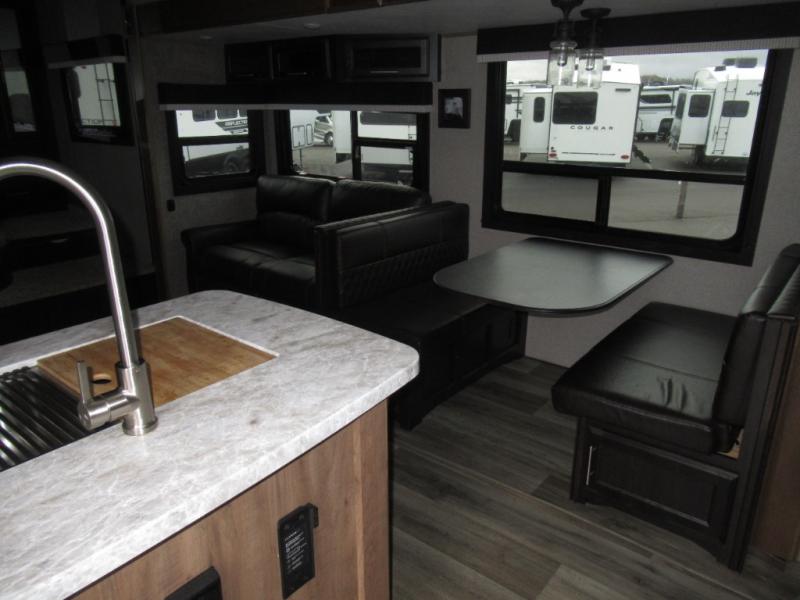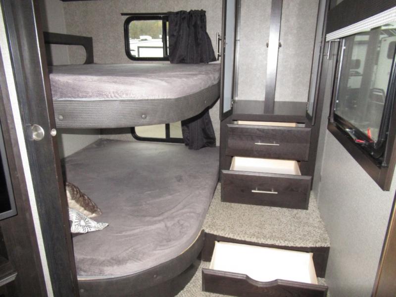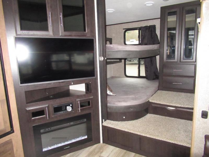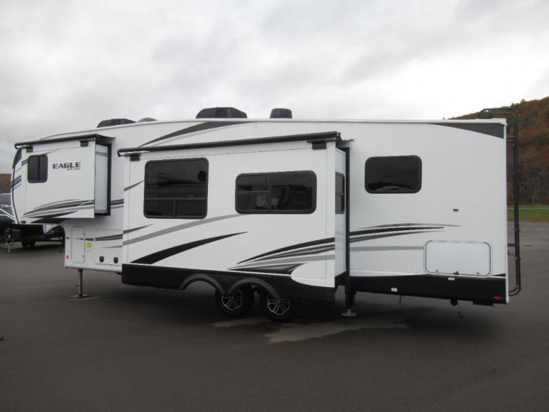 Make it a family vacation you won't forget in this half-ton-towable Eagle HT fifth wheel. The private bunkhouse includes four bunks plus unique stair-step storage drawers so that the kids can bring along their books and toys. You'll appreciate the added space in the main living area thanks to the large slide out, and you'll find the second slide out in the master suite up front. The chef of the family will love making breakfast on the outside kitchen, plus the indoor kitchen includes all the appliances needed if the weather is nasty outside. Whether you're playing a game at the booth dinette, watching your favorite movie on the LED HDTV, or you decided to choose the optional fireplace, you will truly enjoy your time in this fifth wheel.