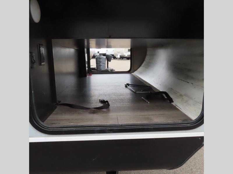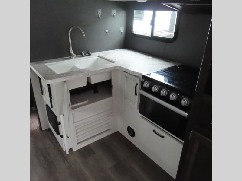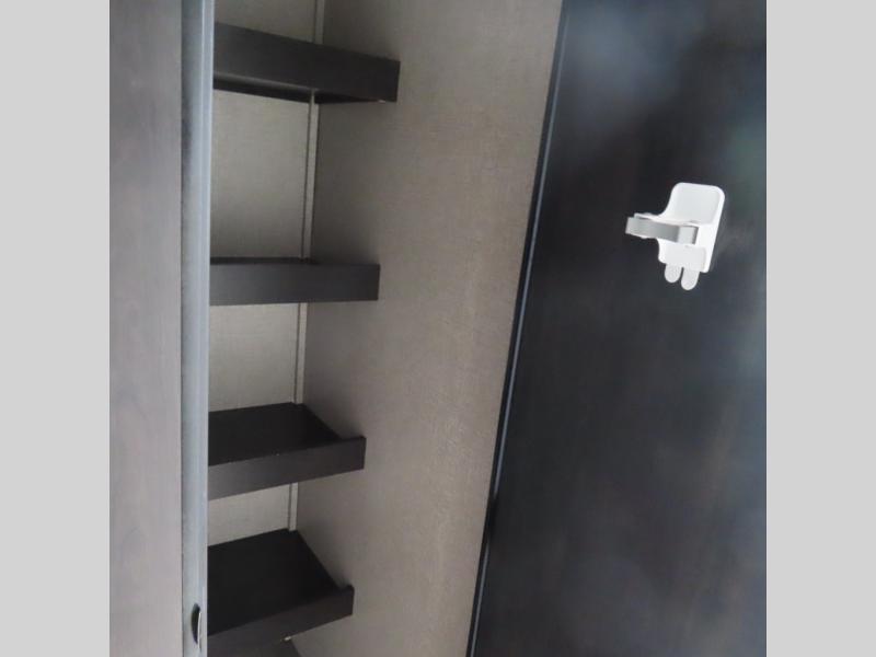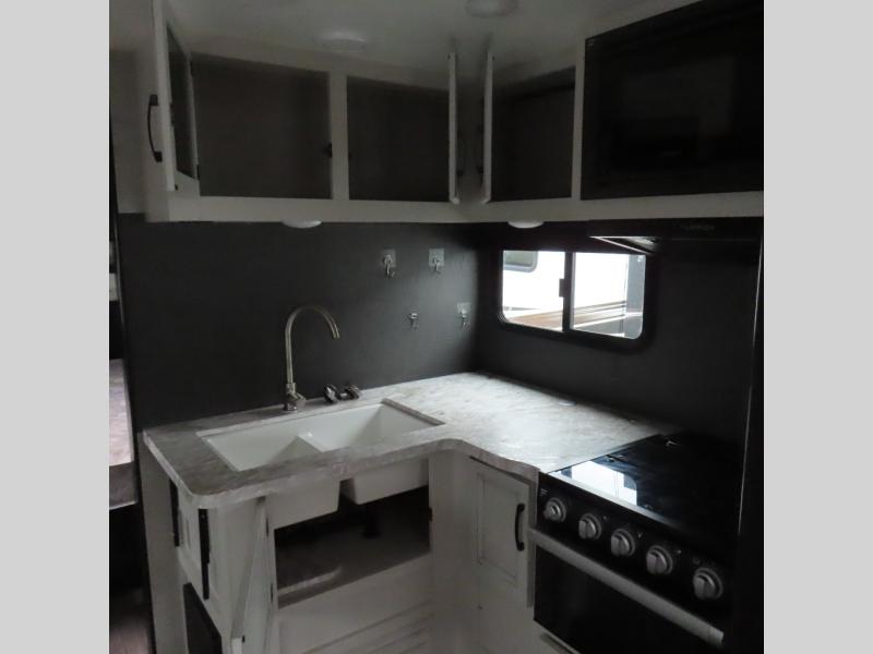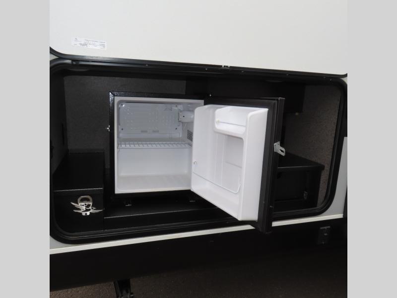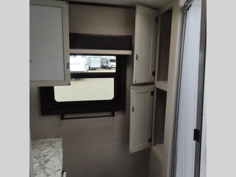 This is a perfect couple's trailer with a spacious rear bathroom with lots of counter space and linen storage, plus the front bedroom offers a walk-around queen bed, dual wardrobes and a space savings sliding door for privacy. The L-shaped kitchen offers extra counter space on the flip-up table, a Furrion range including a three burner recessed glass cooktop and oven, plus a walk-in pantry near the entry for easy access while camping, loading and unloading. The outdoor cook will surely love the outside camp kitchen allowing them to visit with other RVers as they walk by and they will have the 16' power awning with LED lights to relax underneath. The slide out includes the 6 cu. ft. refrigerator and U-dinette or maybe you choose the L-lounger option or theater seating with table trays option.