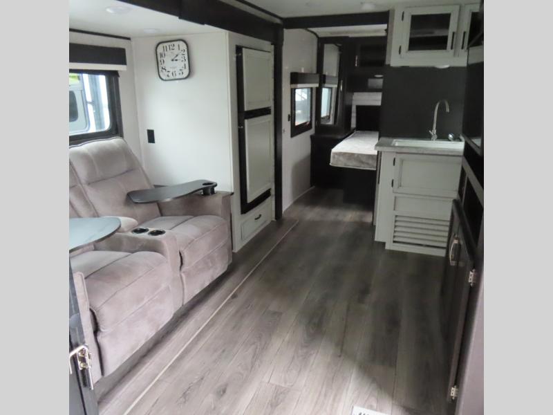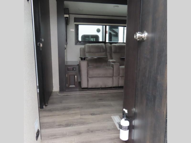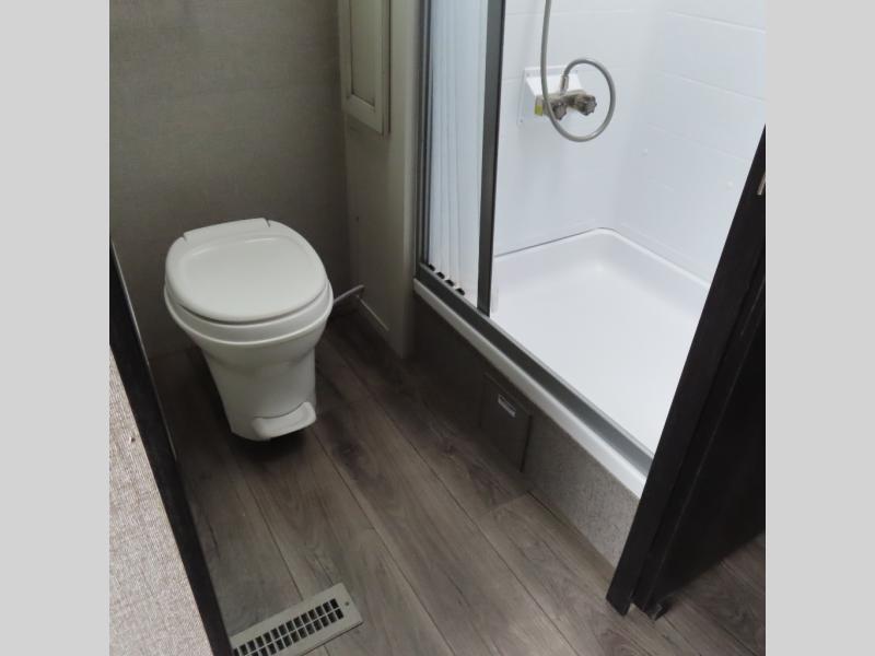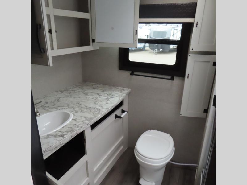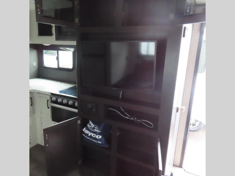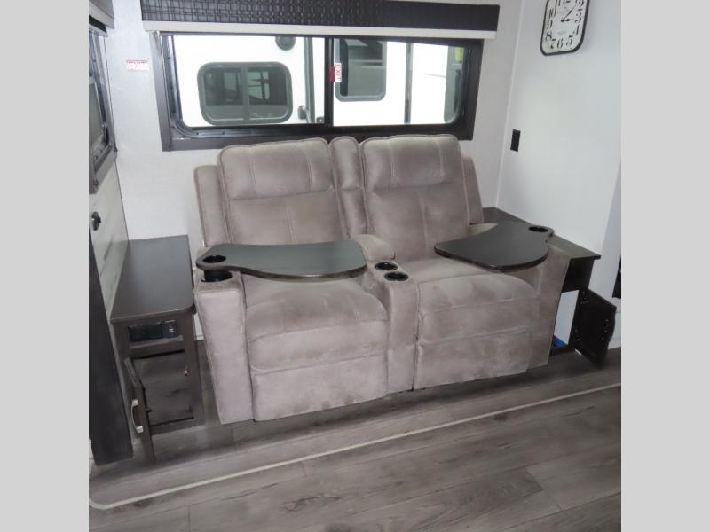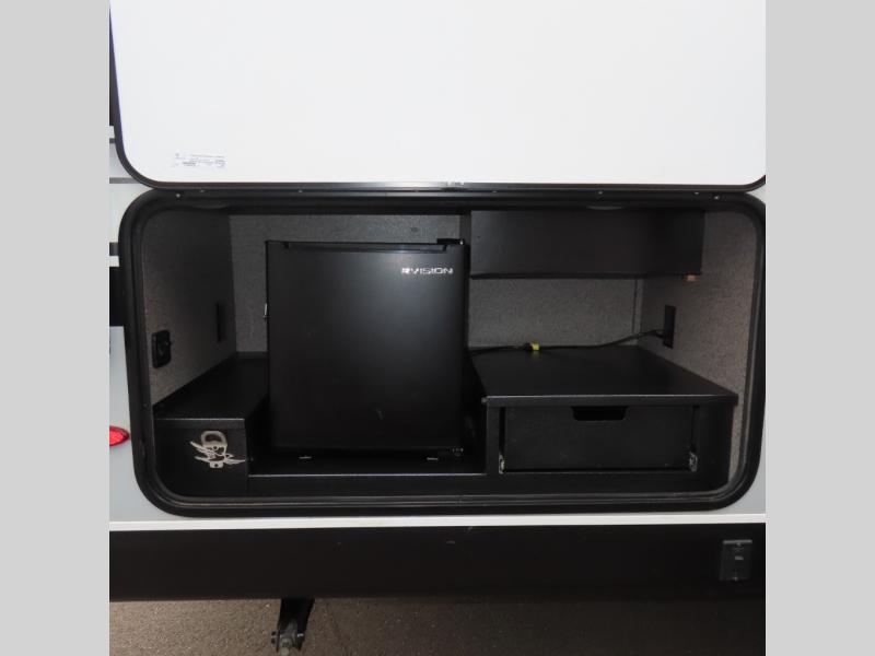 This is a perfect couple's trailer with a spacious rear bathroom with lots of counter space and linen storage, plus the front bedroom offers a walk-around queen bed, dual wardrobes and a space savings sliding door for privacy. The L-shaped kitchen offers extra counter space on the flip-up table, a Furrion range including a three burner recessed glass cooktop and oven, plus a walk-in pantry near the entry for easy access while camping, loading and unloading. The outdoor cook will surely love the outside camp kitchen allowing them to visit with other RVers as they walk by and they will have the 16' power awning with LED lights to relax underneath. The slide out includes the 6 cu. ft. refrigerator and U-dinette or maybe you choose the L-lounger option or theater seating with table trays option.
