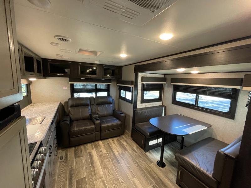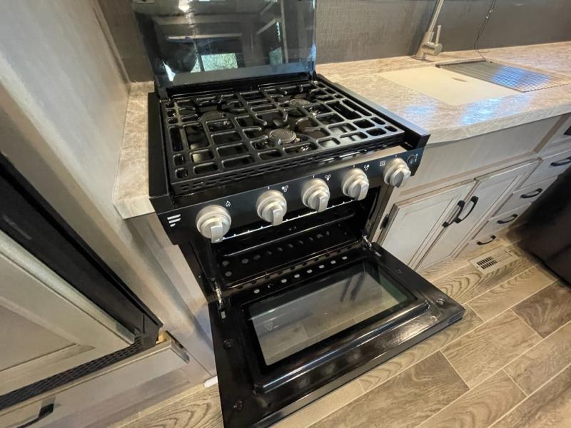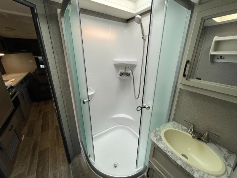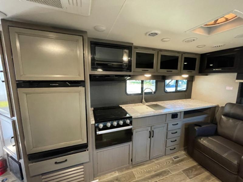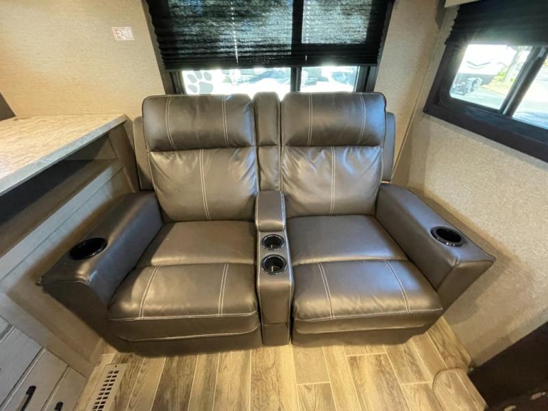 Looking for storage and counter space in your rear living area, well you have found it! The kitchen counter next to the jackknife sofa allows you to utilize this area as you like and not just for preparing meals while the overhead cabinets give you a place to store items up and away. And you can dine at the booth dinette slide while watching the LED TV after whipping up a warm meal using the Furrion range including an oven and three burner recessed glass cooktop. At night you can get cleaned up in the 34" radius shower in the double entry bathroom then retire to your own walk-around queen bed with nightstands and wardrobes on each side. And you might like to choose a tri-fold sofa option or theater seating option in place of the dinette that comes standard.