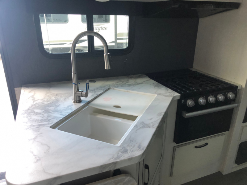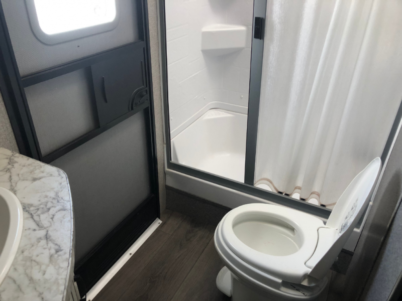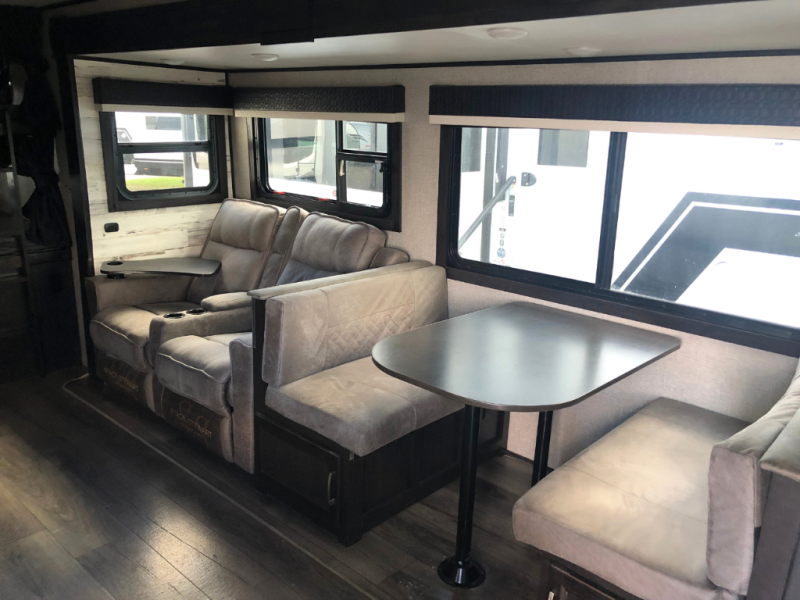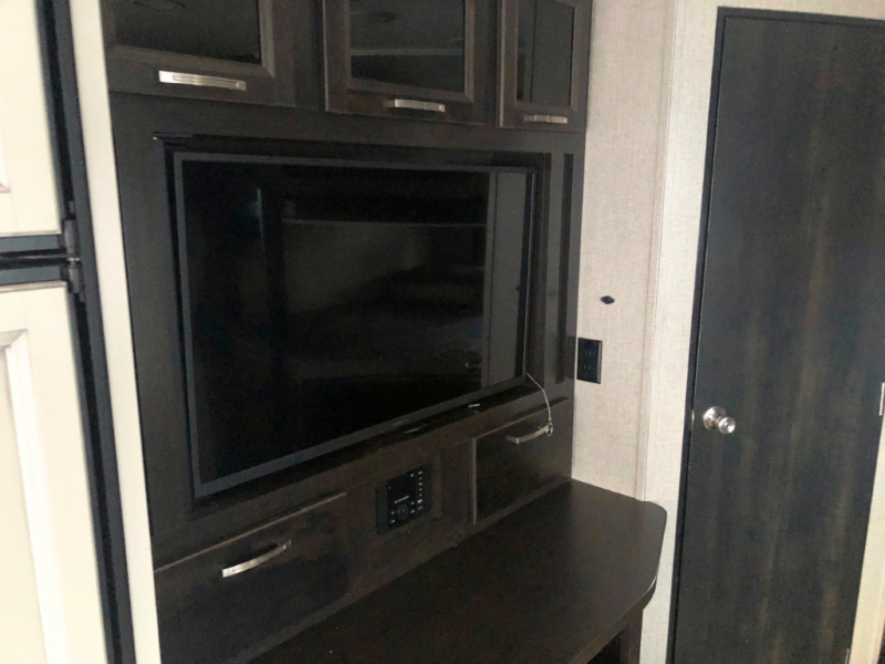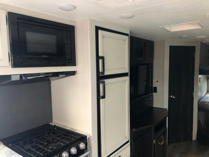 Your family of six to eight can enjoy this trailer for many years with double size bunks for the kids, a walk-around queen bed for the parents and furniture that doubles as sleeping space for overnight guests. The kids will have a ladder to the top bunk and a privacy curtain when it is nighttime, plus the full bathroom is near by and includes an exterior campsite entry so everyone can get inside and back outside quickly to enjoy the great outdoors. The cook can choose between making meals inside using the Furrion range with oven and three burner recessed glass cooktop, plus the 6 cu. ft. refrigerator, or outside using the exterior camp kitchen underneath the 21' power awning with LED lights.