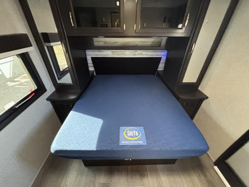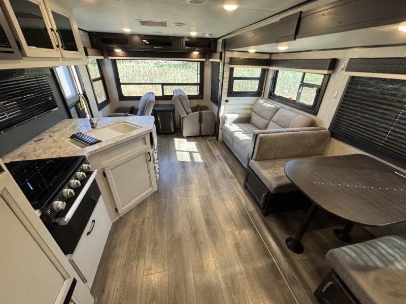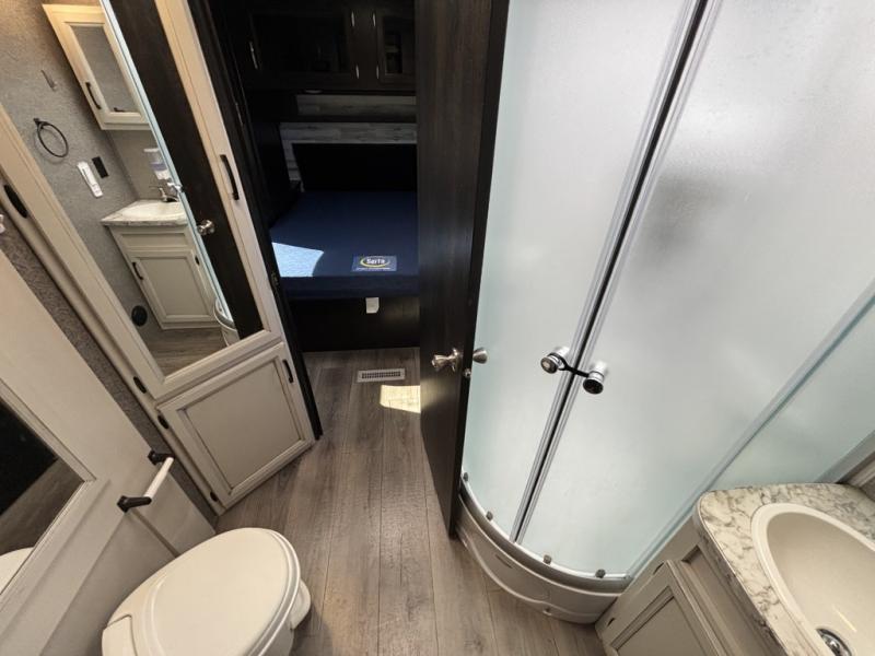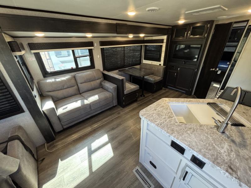 The cook will enjoy making meals using the Furrion range with an oven and a three burner recessed glass cooktop, a 6 cu. ft. refrigerator, and a pantry in the spacious kitchen and living area which includes a slide out with a jackknife sofa and booth dinette. Yet you might have decided to get the tri-fold sofa option instead. When you need to get cleaned up, the walk-through bathroom offers everything you will need plus plenty of storage for your linens and toiletries, and the front bedroom offers a walk-around queen bed, two nightstands and three wardrobes. And the bedroom includes the second exterior entry allowing you to sneak out for a walk in the morning or night.