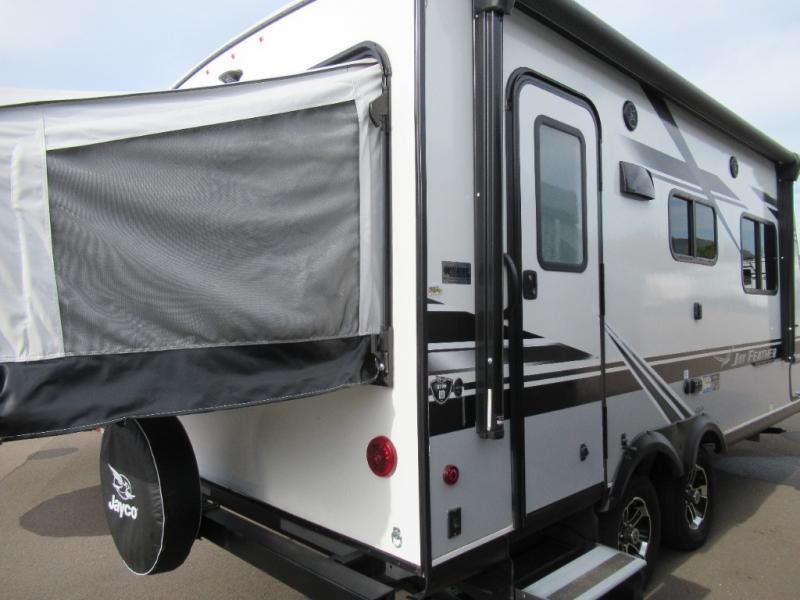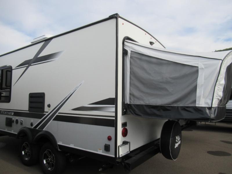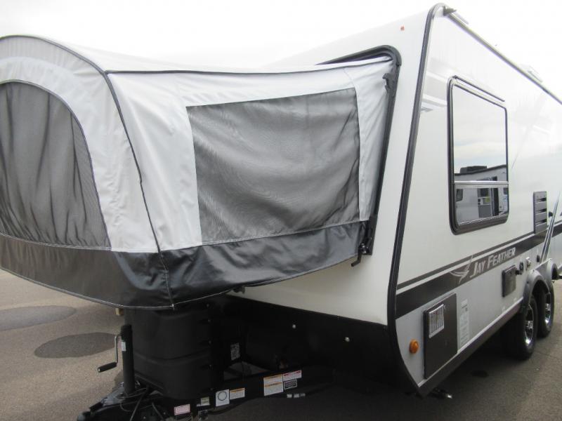 The Jayco Jay Feather hybrid expandables offer versatility and a superior construction process offering Stronghold VBL vacuum-bonded, laminated floor, side, rear and front walls on an American-made Norco frame with an integrated A-frame. Also included are American-made Goodyear tires and Dexter axles with self-adjusting electric brakes and galvanized steel wheel wells. The water-repellent, scratch resistant Jayco DuraTek vinyl tent material with zipper windows and permanently attached tent-to-bed base design including the Keyed-Alike lock system on all tent latches allow you to travel and sleep safely for years to come. The interior offers screwed and glued cabinetry, LED lighting throughout, a decorative backsplash and smoked glass decorative inserts on select overhead cabinets for style, plus much more depending on the Jay Feather you choose.