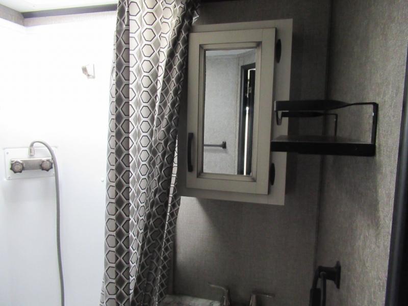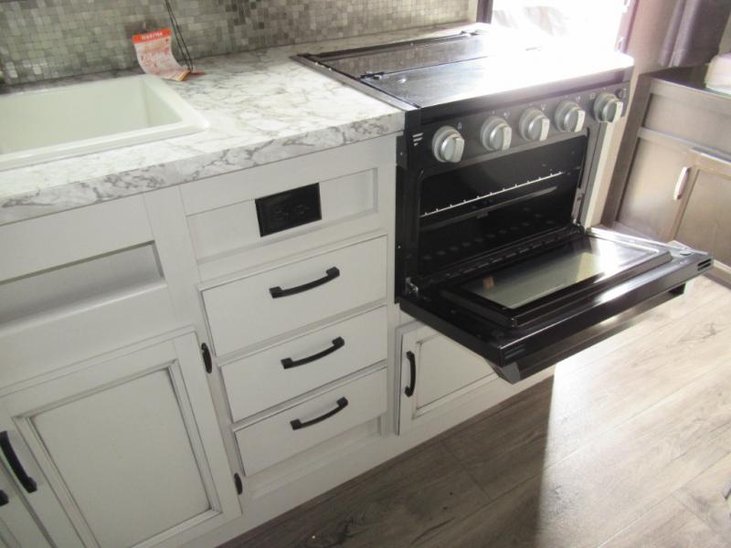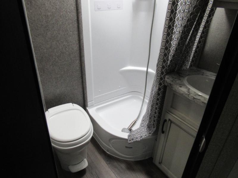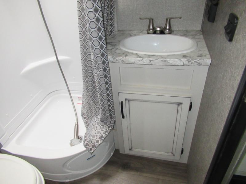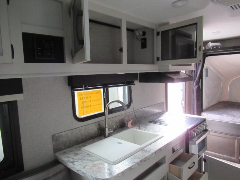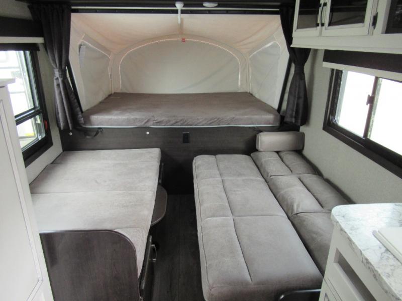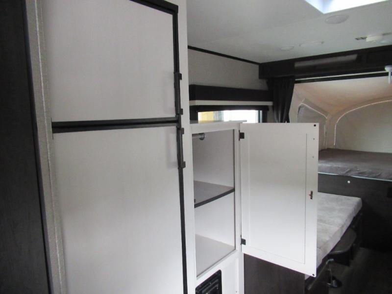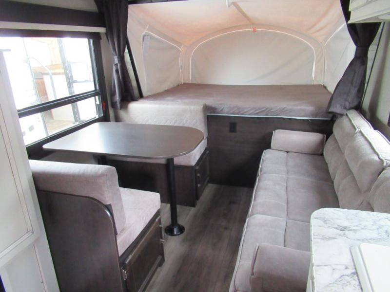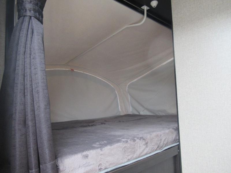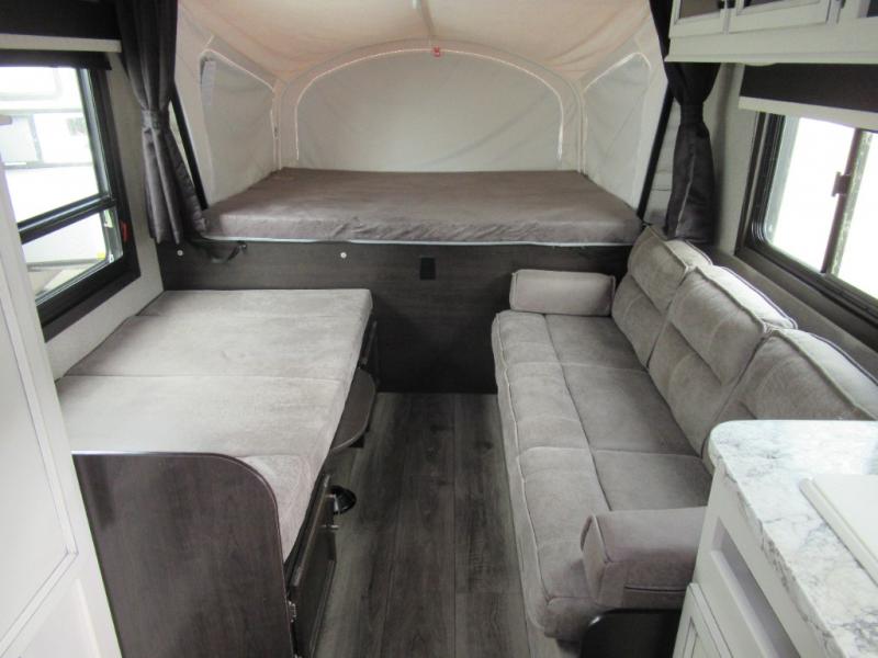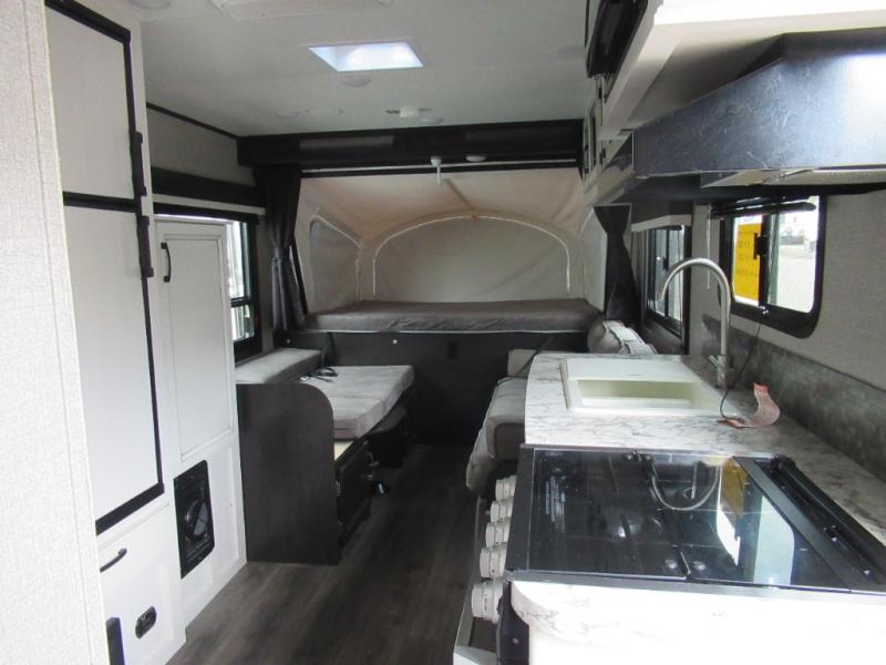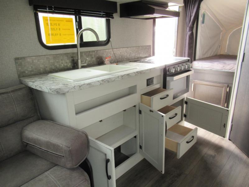 Looking to camp with your family at a state park or a far-away camping destination? This easy to tow hybrid expandable offers a place to relax, dine and sleep inside at the sofa, the dinette and/or the front and rear tent end beds with Stronghold vacuum-bonded bed platforms with 1,050 lb. weight rating. Outside you can relax under the 13' power awning with LED lights either during the day or night just grab your camp chairs. The rear corner bathroom is steps away from the entry allowing you to quickly get back outside to the fun. And the wardrobe/TV cabinet offers you additional storage if the overhead shelves and cabinets are full. The cook will enjoy having a three-burner recessed cooktop and microwave to make warm meals for everyone and a 6 cu. ft. refrigerator to store the cold items.