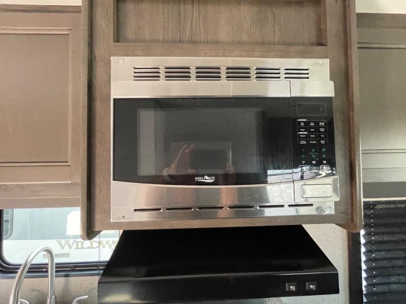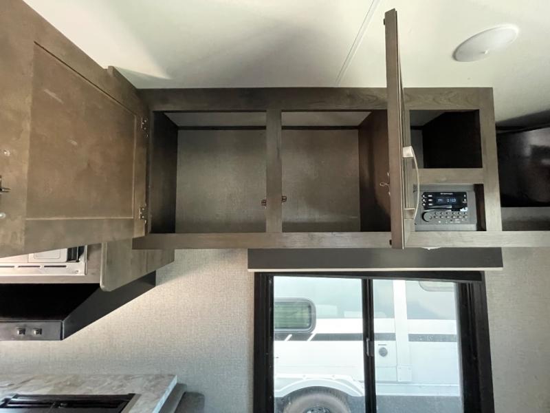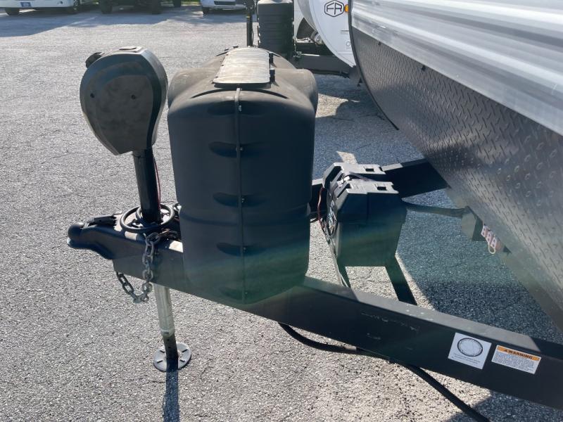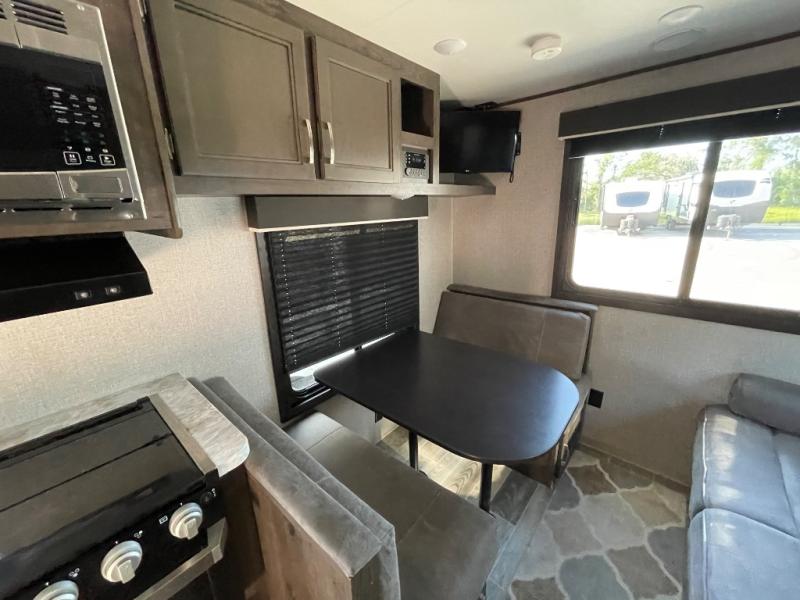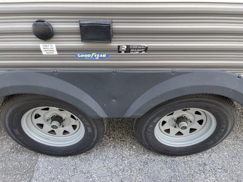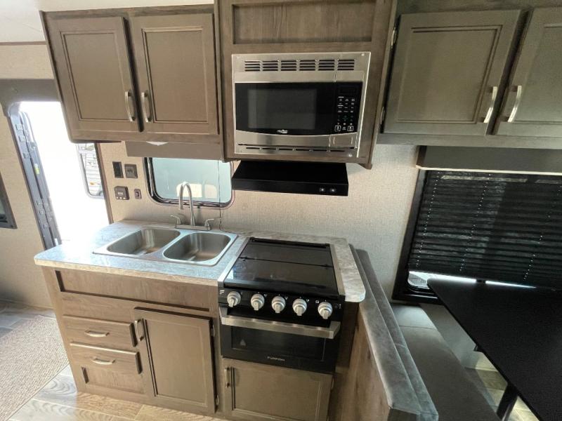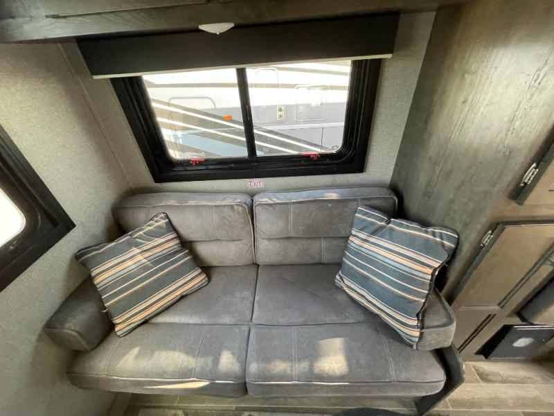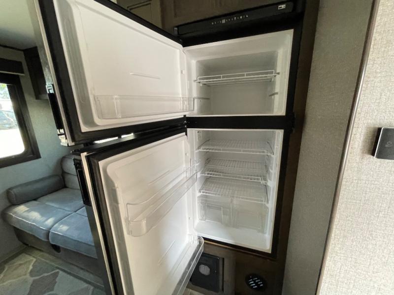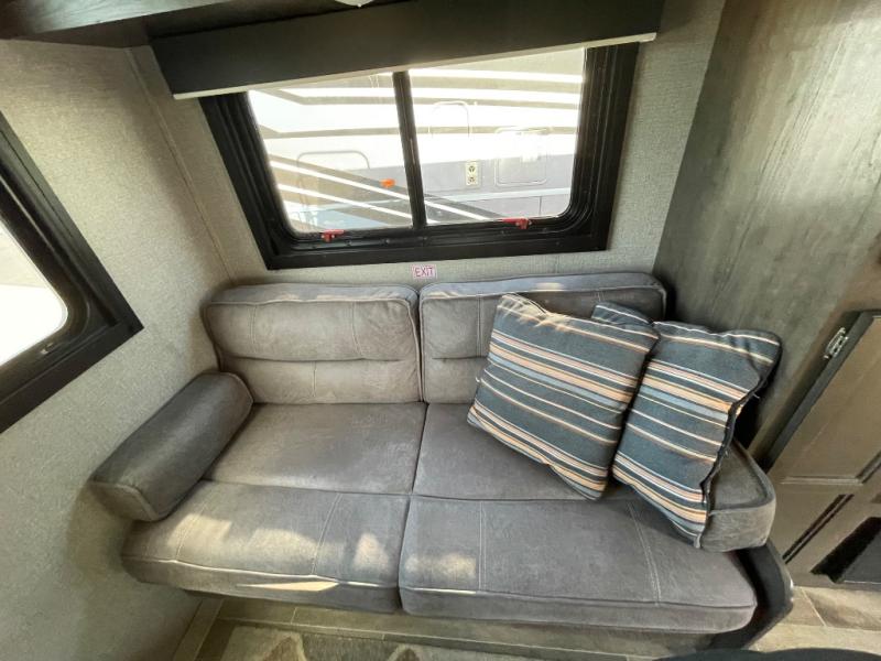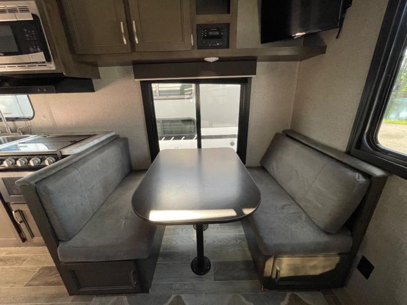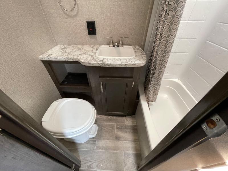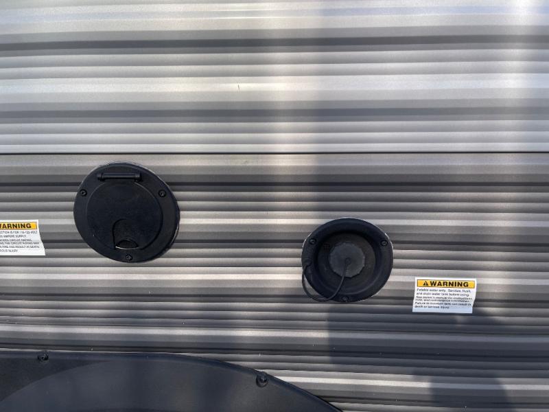 If you and your spouse wish to escape the hustle and bustle of everyday life then you need this travel trailer! You can create delicious home cooked meals with the three burner range with glass cover, and enjoy eating them comfortably at the booth dinette. The dinette and sofa can also double as extra sleeping spaces for a few to tag along and join in on the fun. Start each morning feeling refreshed and clean after sleeping on the front island queen bed and taking a nice, hot shower in the tub/shower which also has skylight above it for you to have natural lighting as you get ready!