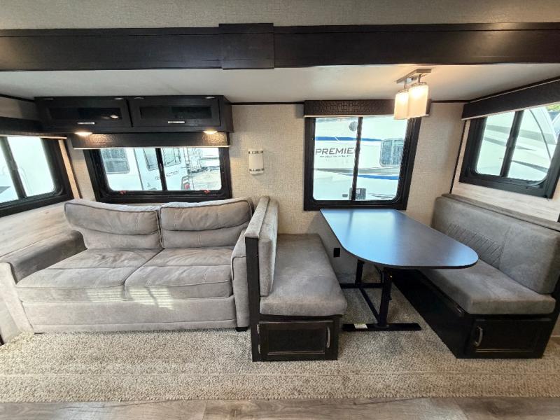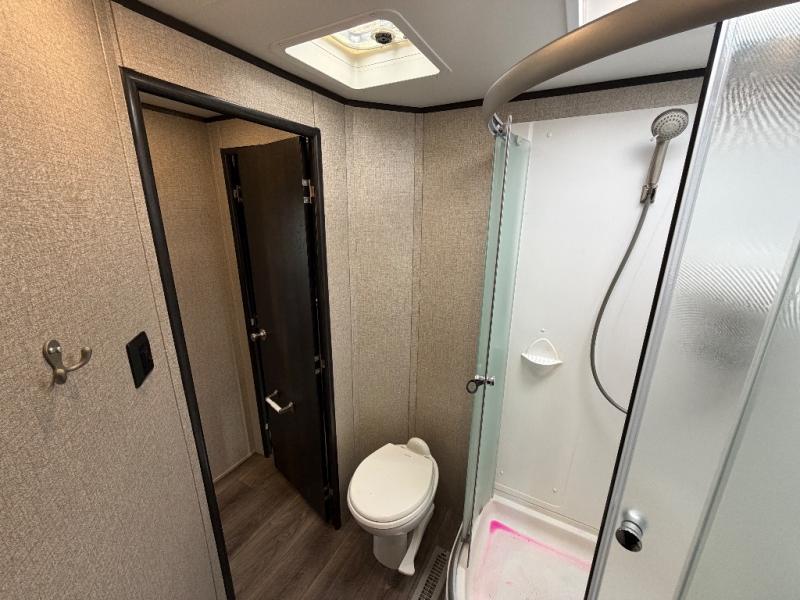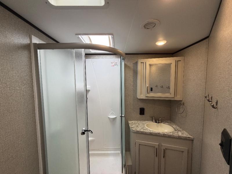 This comfortable Jay Flight travel trailer provides you with a secluded sleeping space up in the front private bedroom. Not only does this room have a walk-around queen bed and bedside wardrobes, but it also has its very own exterior entry door so that you can come and go as you please. With the bedroom being located right next to the full bathroom, you'll have an easy time getting ready in the morning, and the bathroom skylight is going to wake you up and brighten your day. Out in the main living area, you'll find loads of space to relax with the large slide, the booth dinette, the jackknife sofa, and the two push-back reclining chairs, and the entertainment center is easily viewable from all of those spots.