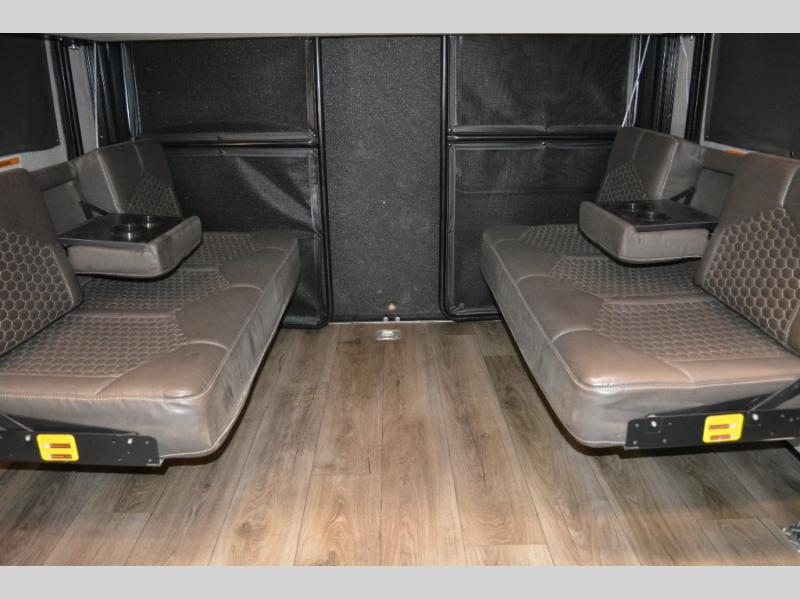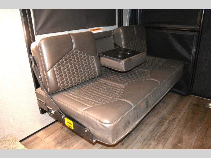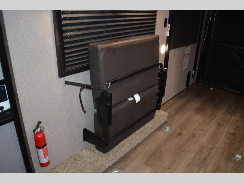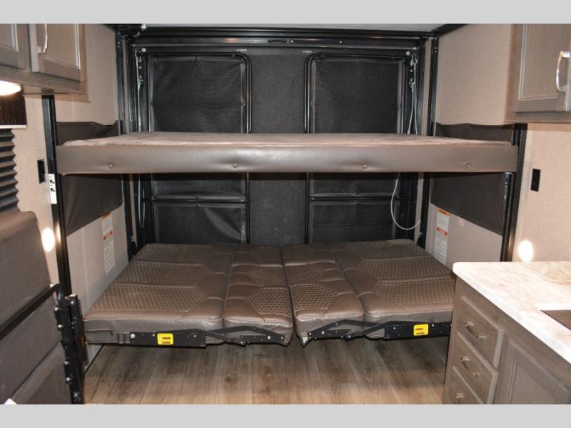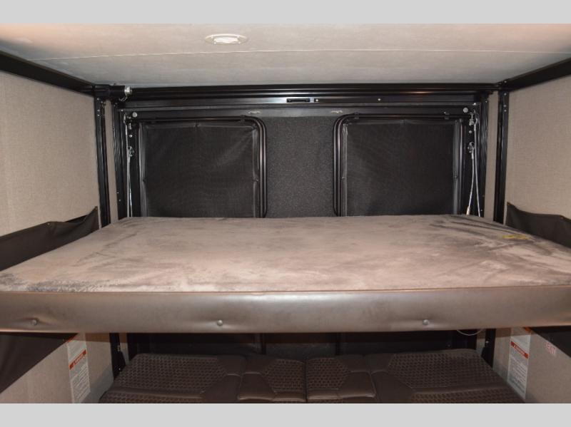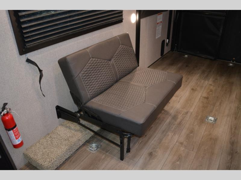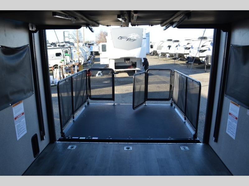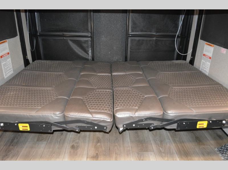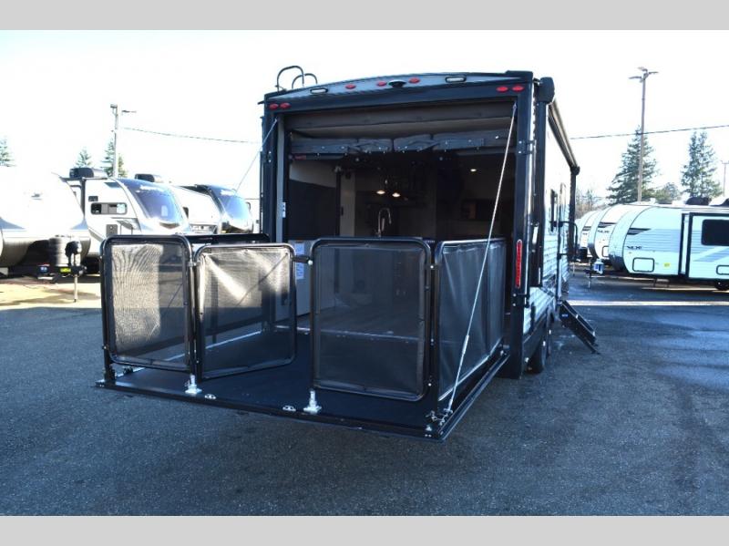 You will love the extra space you have in this Jay Flight Octane toy hauler thanks to the RV queen bed slide in the semi-private bedroom up front. The full bath is right next to the bedroom for convenience, and you'll find all the kitchen appliances needed to create meals each day, including a stainless steel microwave. Your guests can sleep on the power queen bunk or the convertible sofas at night, and the indoor/outdoor table can be removed so that you can enjoy lunch inside or outside under the 20' power awning. With a 14' 8" garage space, you can bring along your dirt bikes, four-wheeler, or kayaks!