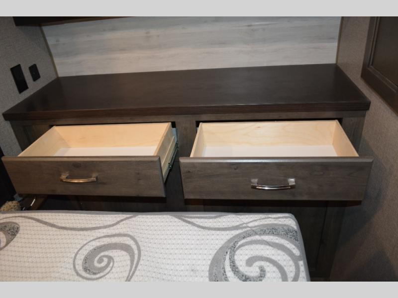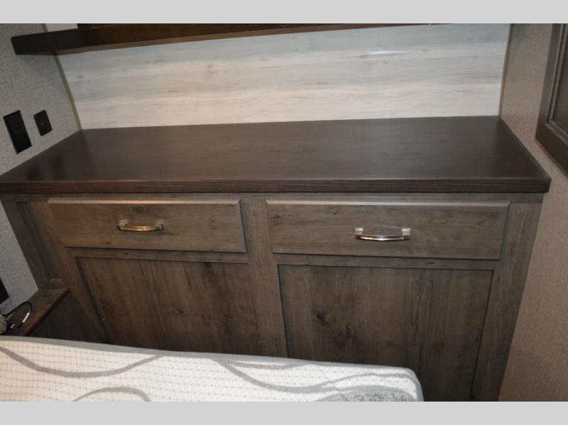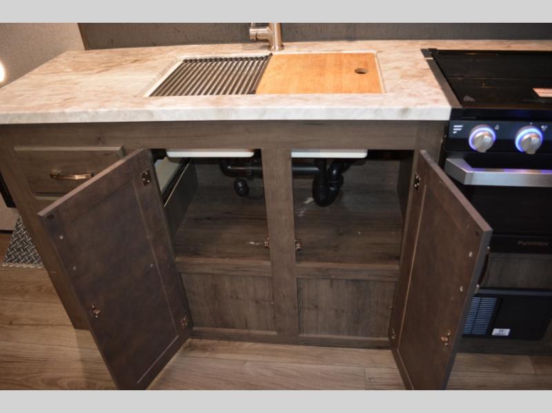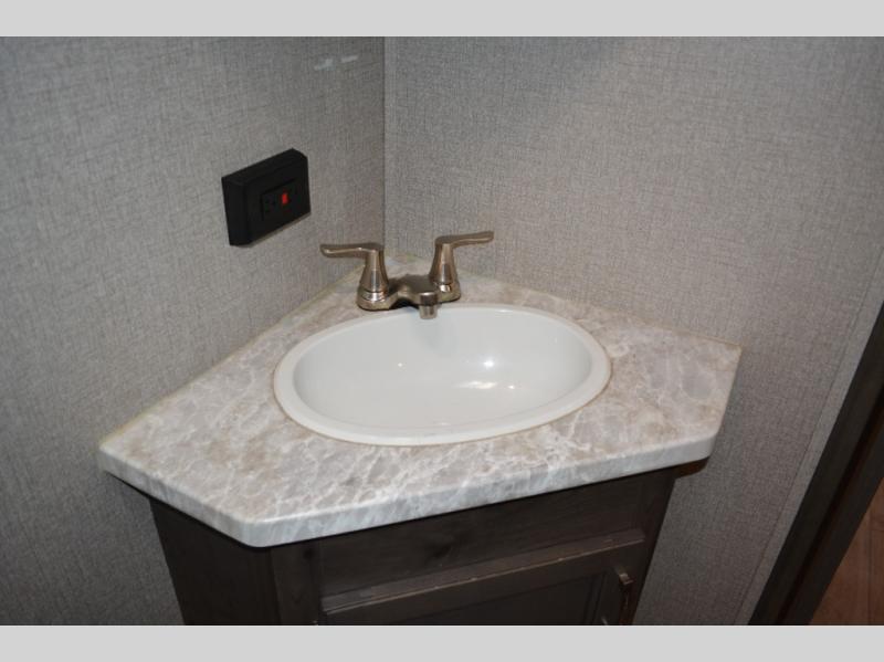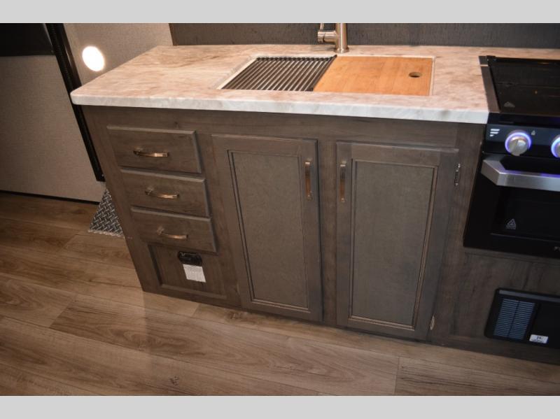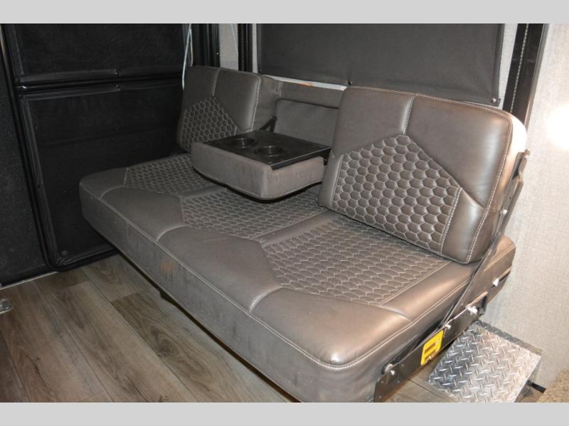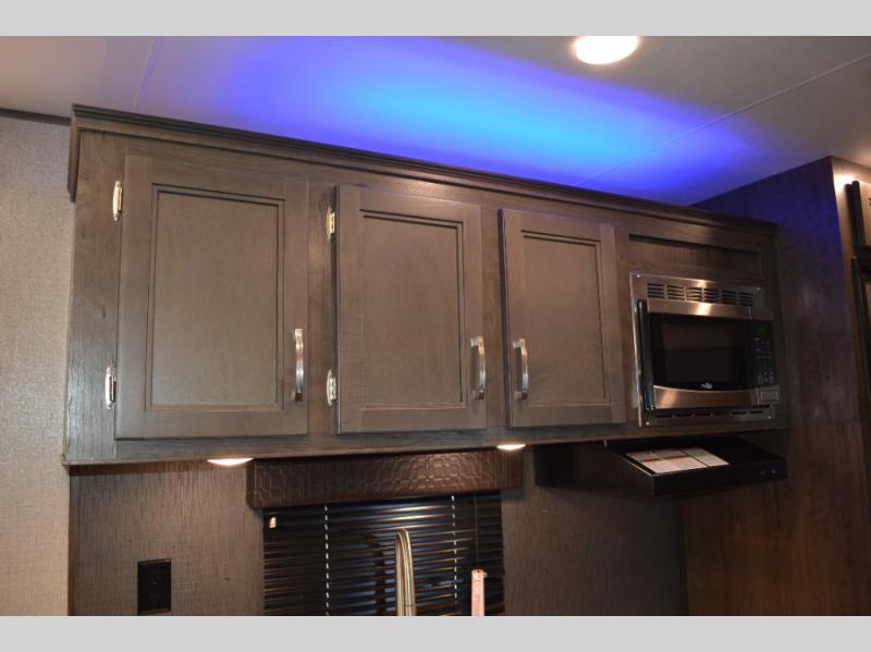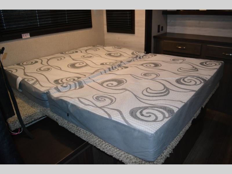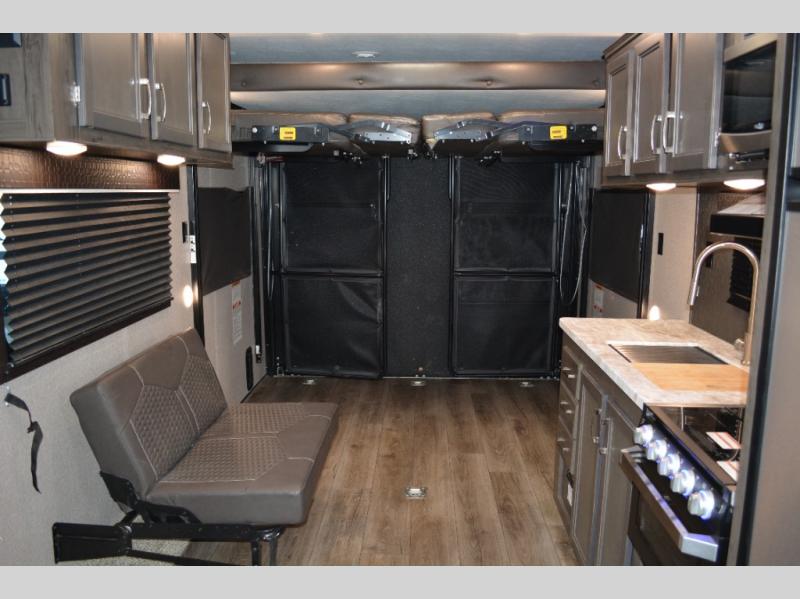 You will love the extra space you have in this Jay Flight Octane toy hauler thanks to the RV queen bed slide in the semi-private bedroom up front. The full bath is right next to the bedroom for convenience, and you'll find all the kitchen appliances needed to create meals each day, including a stainless steel microwave. Your guests can sleep on the power queen bunk or the convertible sofas at night, and the indoor/outdoor table can be removed so that you can enjoy lunch inside or outside under the 20' power awning. With a 14' 8" garage space, you can bring along your dirt bikes, four-wheeler, or kayaks!