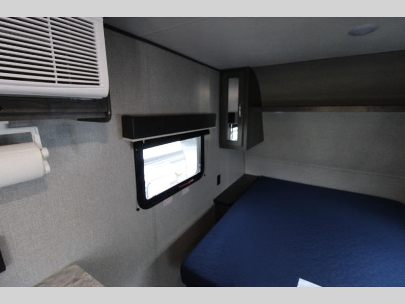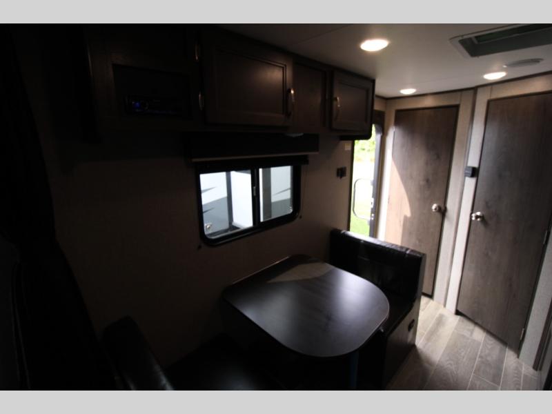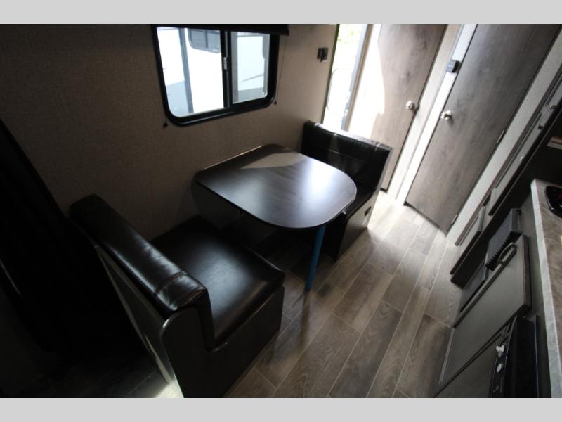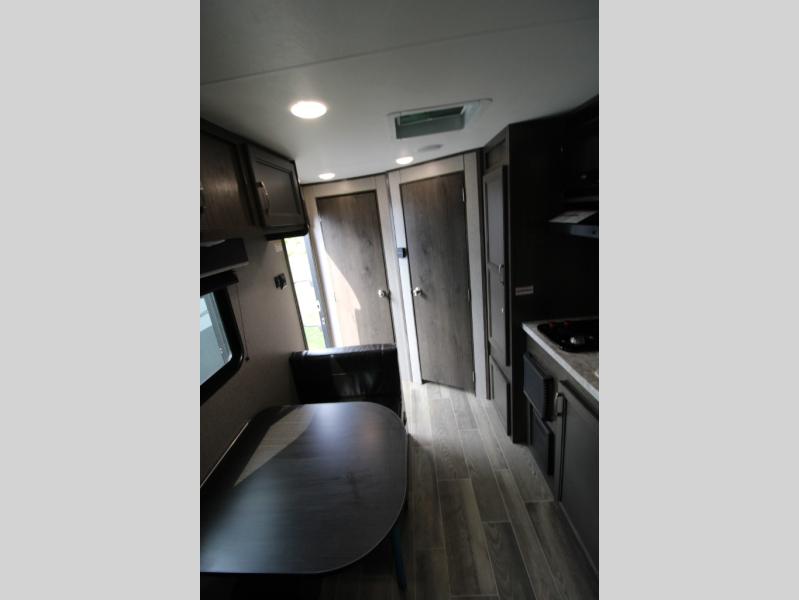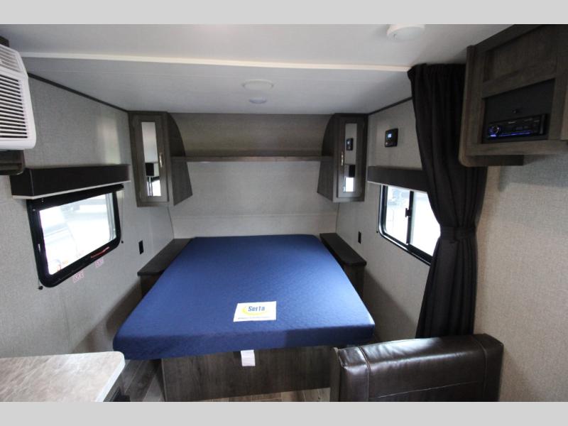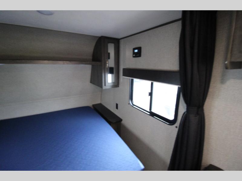You will love waking up each morning on the walk-around RV queen bed in this Jay Flight SLX 7 travel trailer. The privacy curtain will create a semi-private bedroom so that you can get dressed discretely. Once you've made breakfast on the two-burner cooktop, get freshened up in the private bathroom before heading out to find a trail. When you return, you can hang your jacket in the large entryway wardrobe and grab the cards to play a game at the booth dinette. This model also includes a pantry for snacks, overhead compartments for your belongings, plus outside storage for charcoal and tackle boxes!