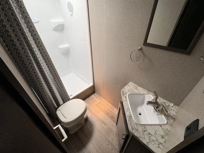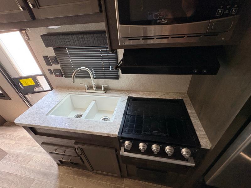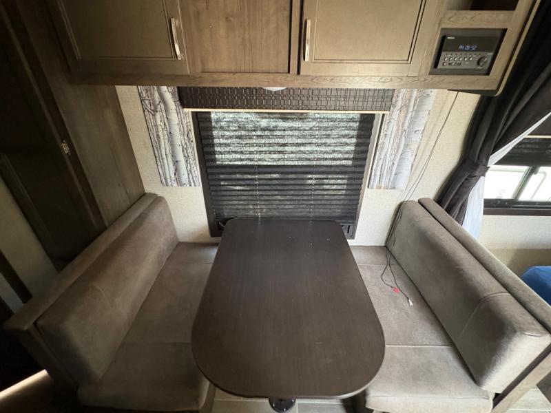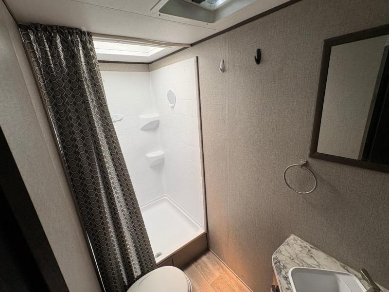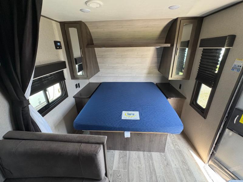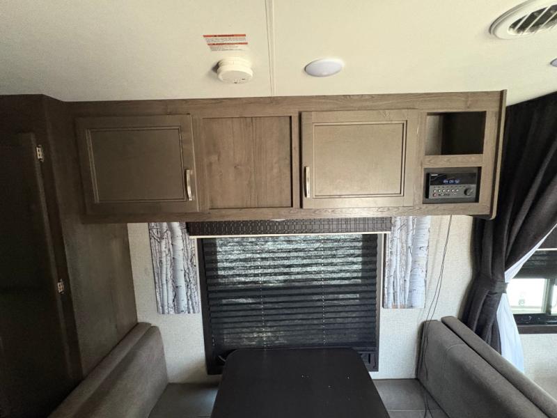 Don't go on another camping trip without taking this travel trailer! There is an island queen bed up front with wardrobes on either side to keep your clothes looking nice and a privacy curtain to draw at night. The kids will enjoy sleeping on the rear double bunk beds and they can even bring a friend along too, just convert the booth dinette into a sleeping space for them. The spacious rear corner bathroom comes with a large shower for you to enjoy a nice, hot shower every morning. If you don't feel like cooking dinner indoors then head to the outside kitchen to breathe in some fresh air and watch the kids playing!