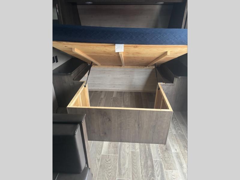 Don't go on another camping trip without taking this travel trailer! There is an island queen bed up front with wardrobes on either side to keep your clothes looking nice and a privacy curtain to draw at night. The kids will enjoy sleeping on the rear double bunk beds and they can even bring a friend along too, just convert the booth dinette into a sleeping space for them. The spacious rear corner bathroom comes with a large shower for you to enjoy a nice, hot shower every morning. If you don't feel like cooking dinner indoors then head to the outside kitchen to breathe in some fresh air and watch the kids playing!