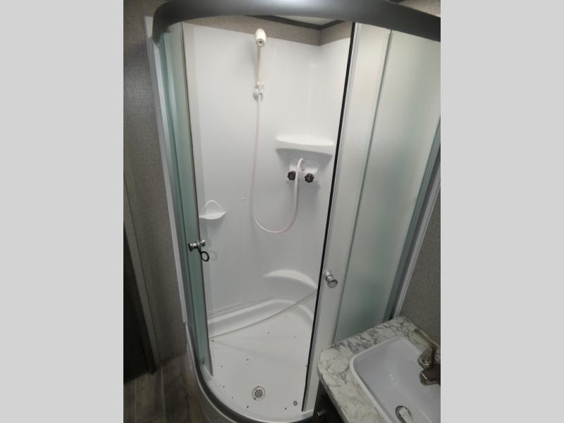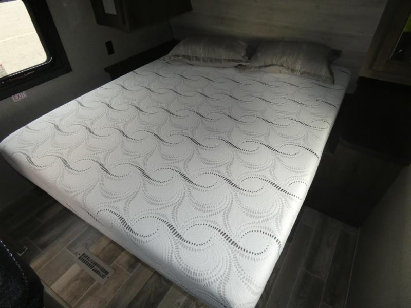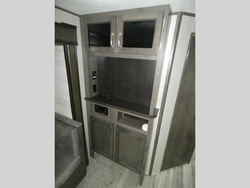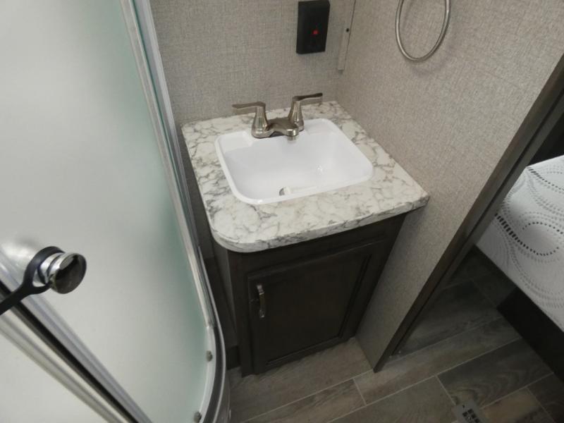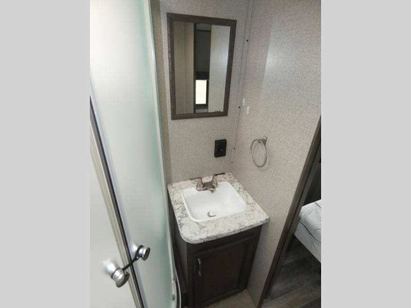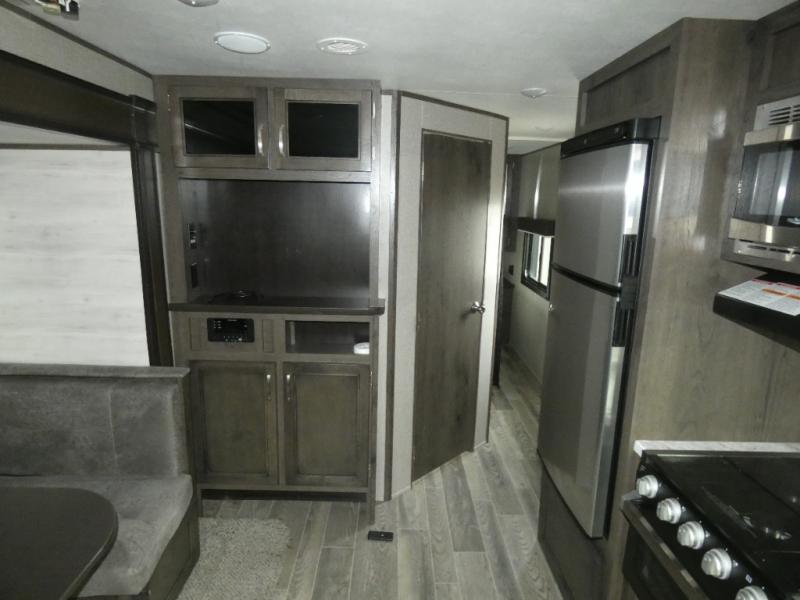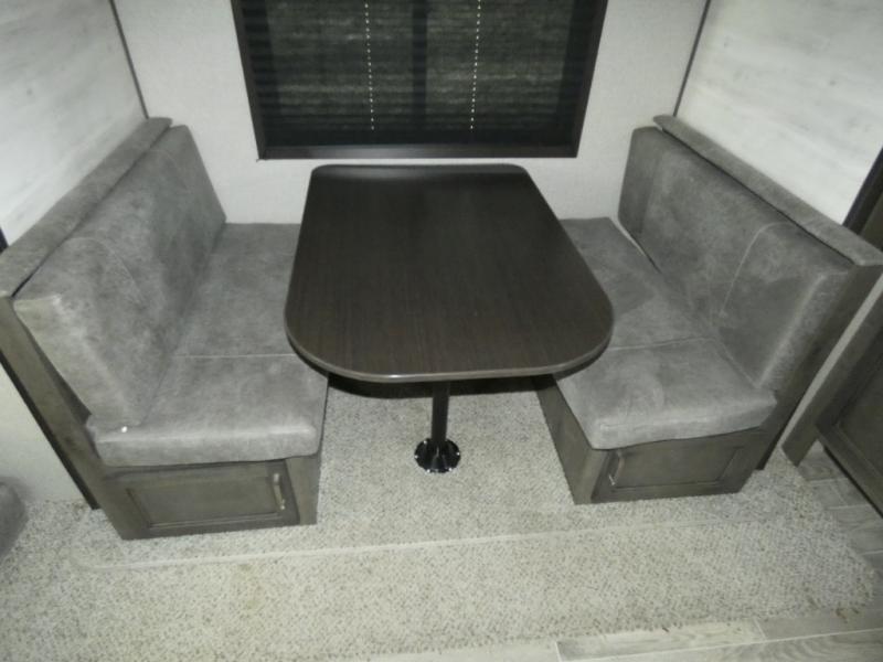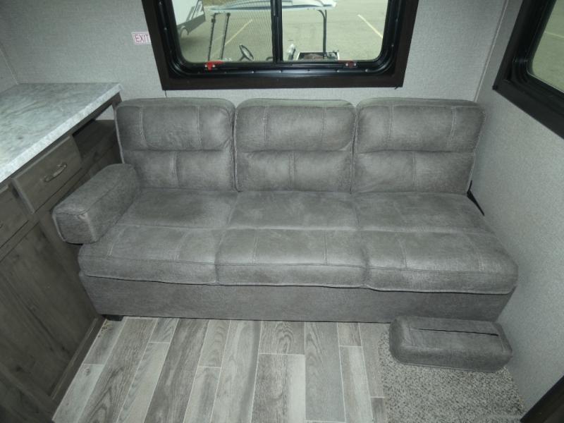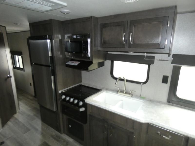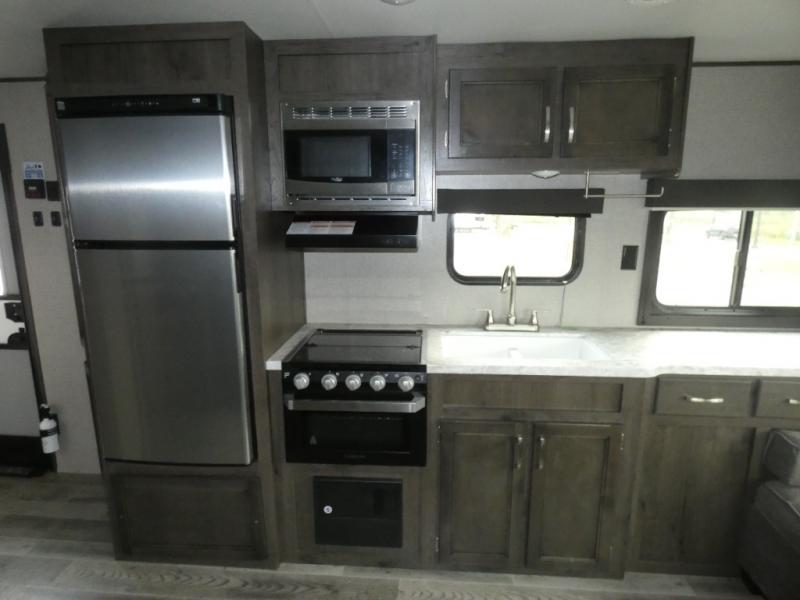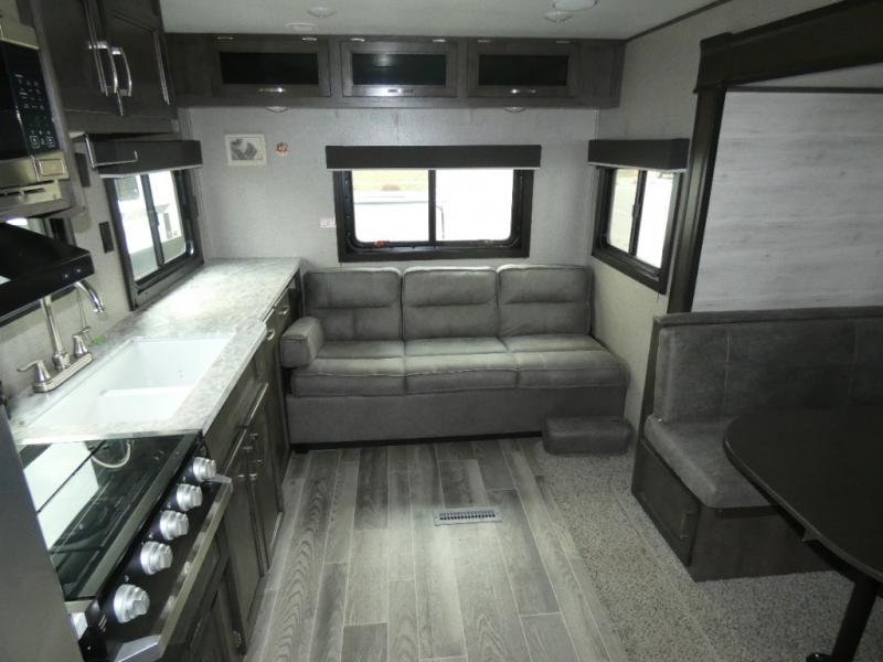 Come see just how fun and easy camping can be in this travel trailer! There is a front private bedroom with a queen bed that has wardrobes on either side of it and an entrance into the dual entry bathroom. The rear living area has a large sofa and is right next to the ample counter space with the double sink and three burner range with glass top to create your best home cooked meals. The booth dinette slide helps to open up the living area for more walking around space.