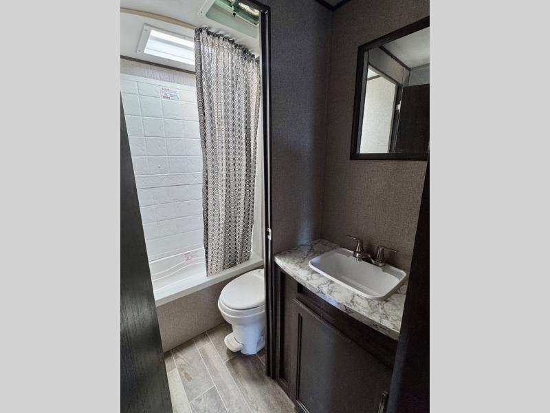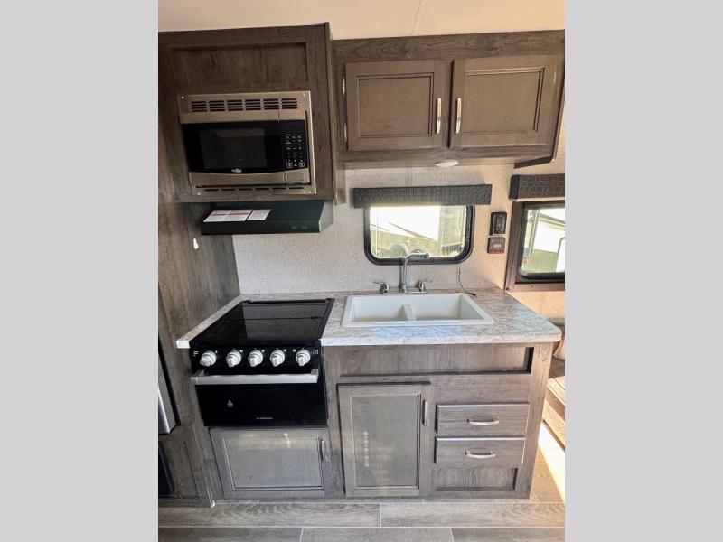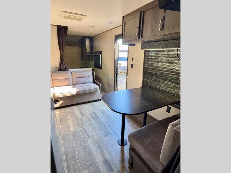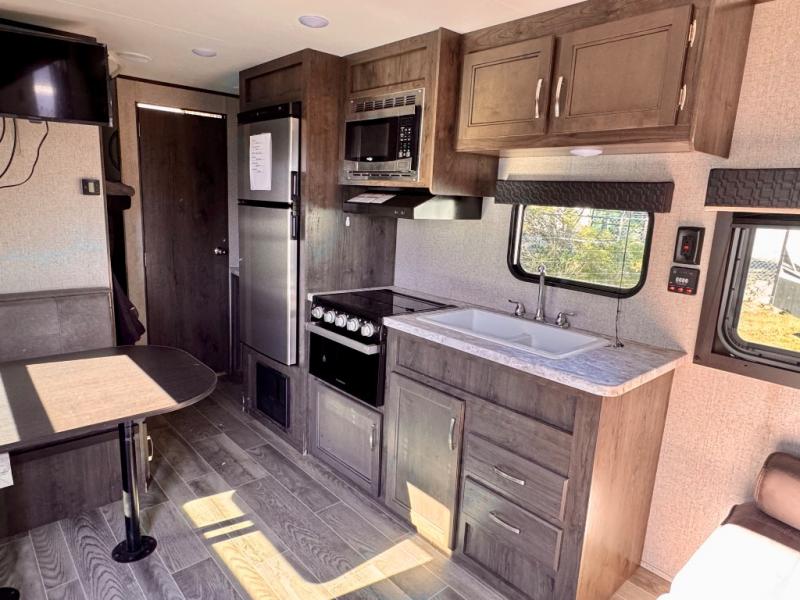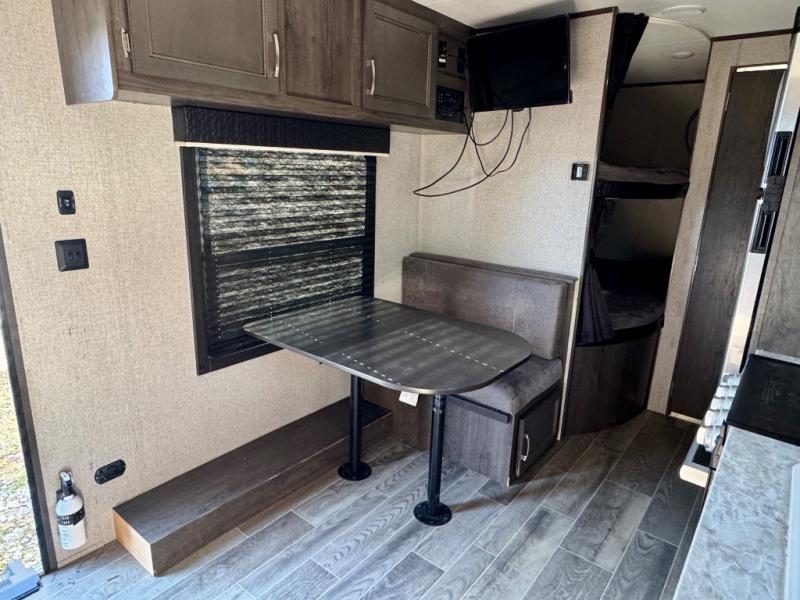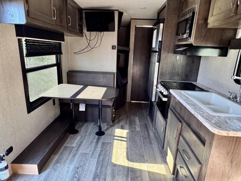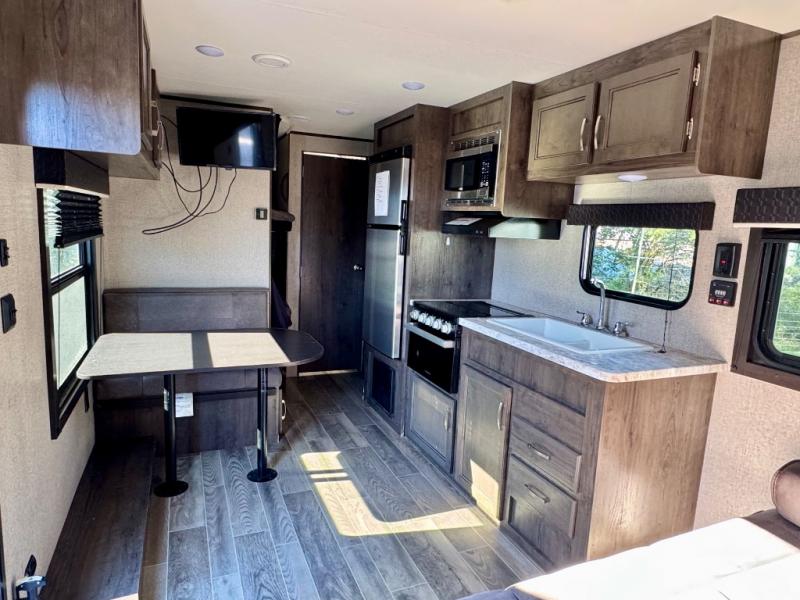 The whole family can head to the campground with this travel trailer! Everyone will start each day feeling re-charged and ready to go after sleeping on the rear corner double bunk beds and the front queen bed, plus the sofa and the booth dinette can also transform into extra sleeping spaces for any friends that want to tag along. The rear corner bathroom comes with a tub/shower that has a skylight above for natural lighting and a wood trimmed mirror to make you feel more at home. There is plenty of storage inside and out between the overhead cabinets, the wardrobes, and the exterior pass-through storage area. You can also add the optional Chil N' Stor feature to the exterior so that you can enjoy a nice, cold beverage without having to go inside to get one!
