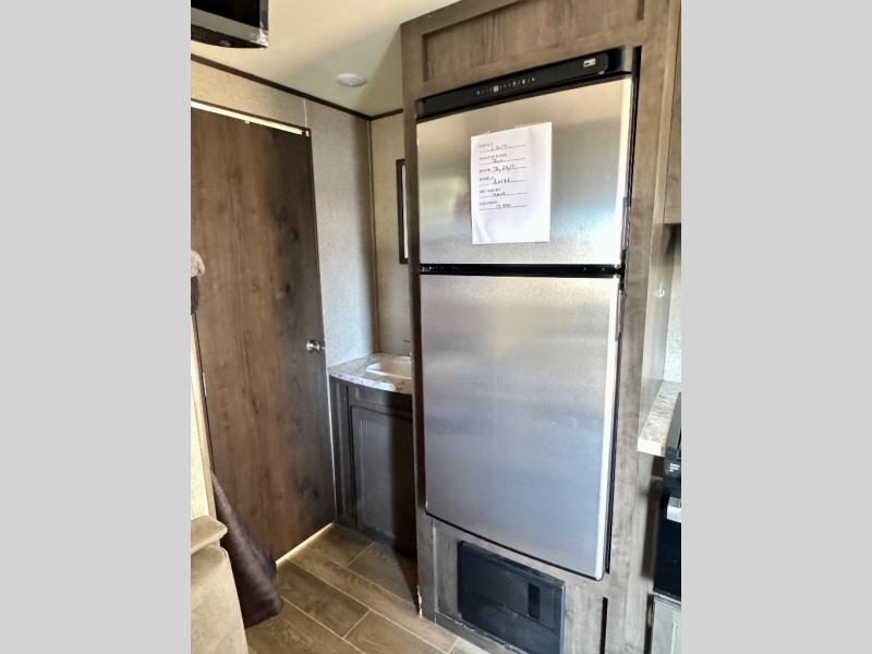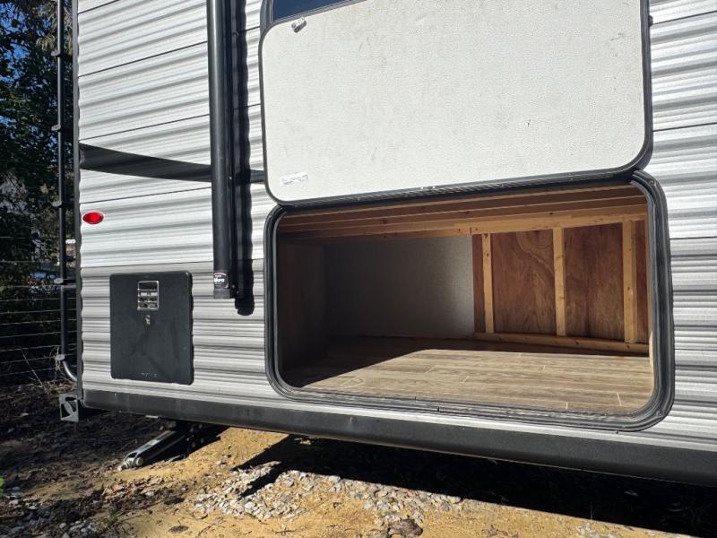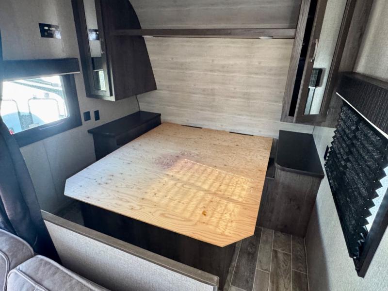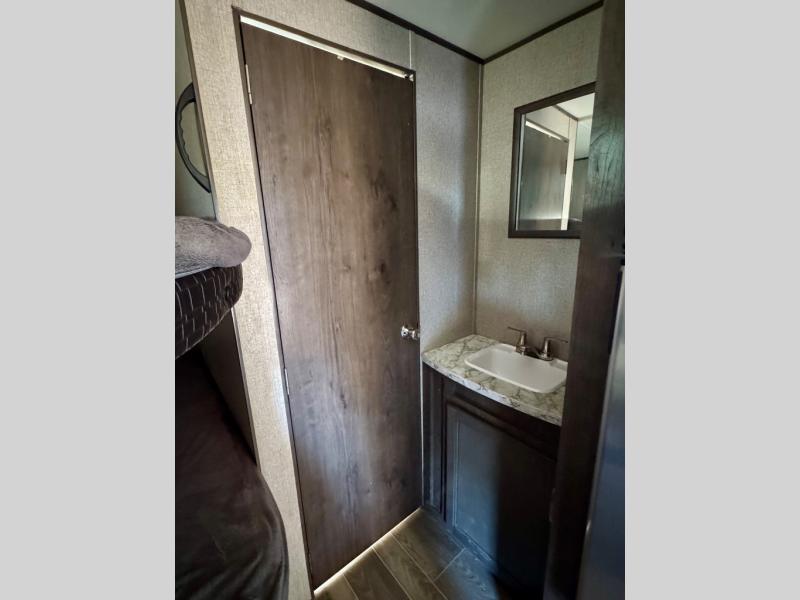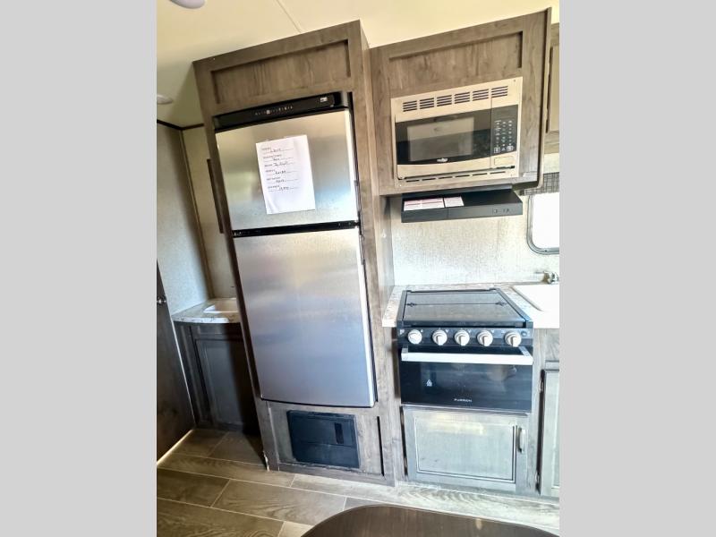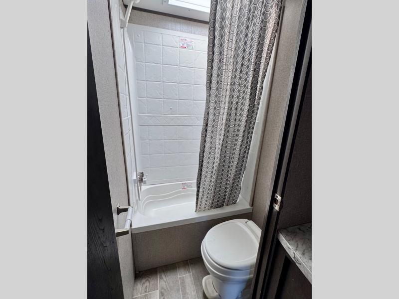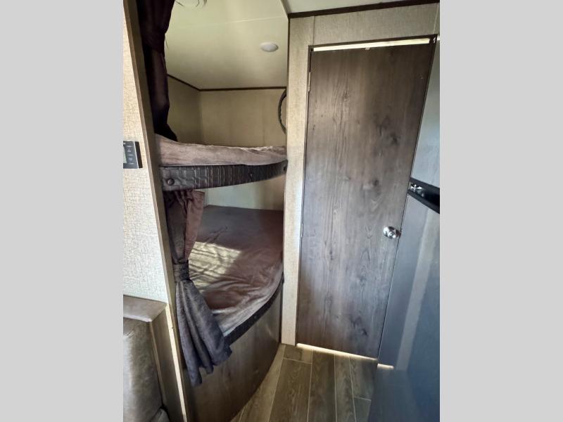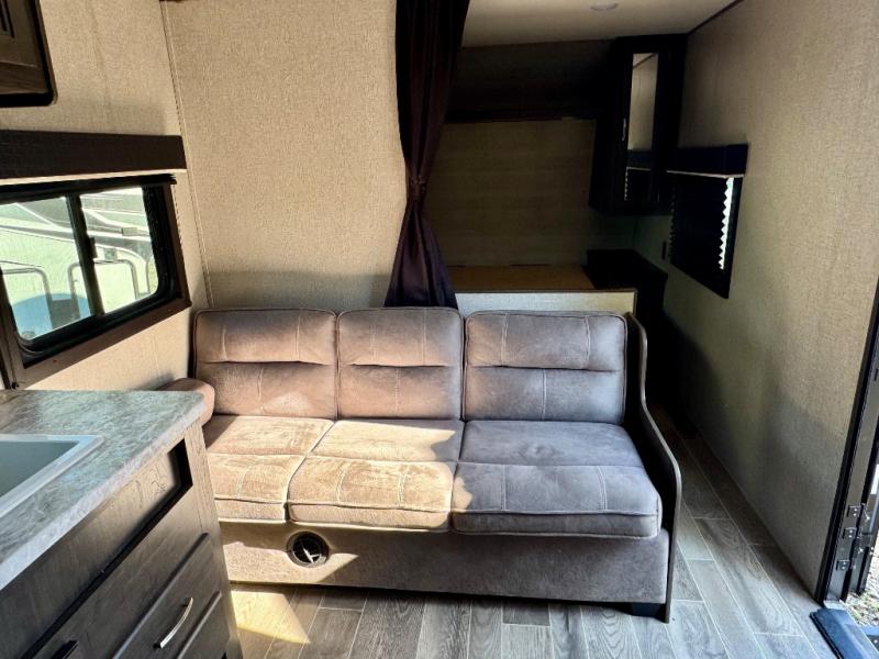 The whole family can head to the campground with this travel trailer! Everyone will start each day feeling re-charged and ready to go after sleeping on the rear corner double bunk beds and the front queen bed, plus the sofa and the booth dinette can also transform into extra sleeping spaces for any friends that want to tag along. The rear corner bathroom comes with a tub/shower that has a skylight above for natural lighting and a wood trimmed mirror to make you feel more at home. There is plenty of storage inside and out between the overhead cabinets, the wardrobes, and the exterior pass-through storage area. You can also add the optional Chil N' Stor feature to the exterior so that you can enjoy a nice, cold beverage without having to go inside to get one!