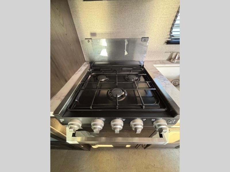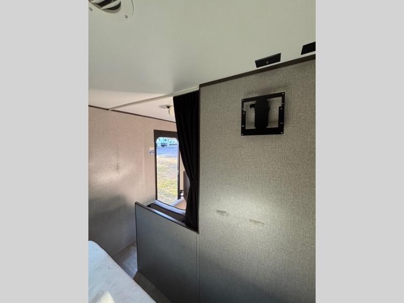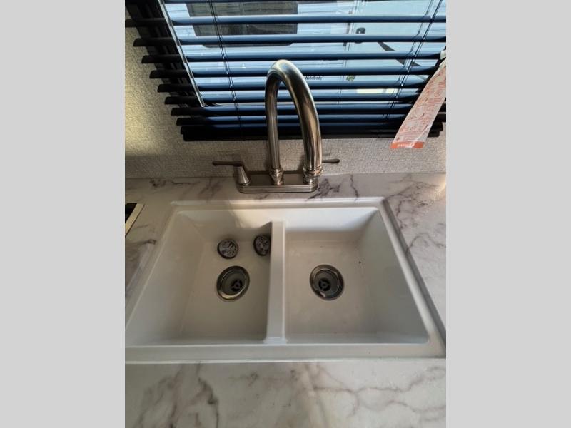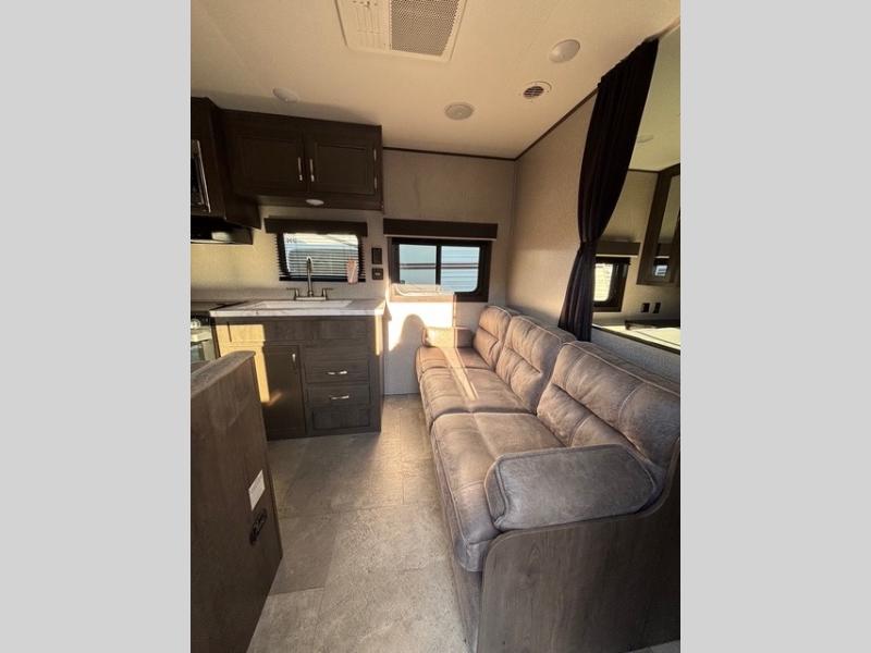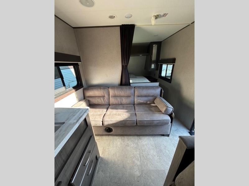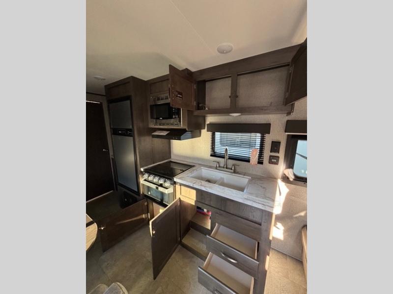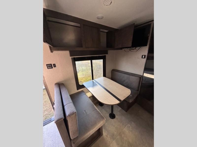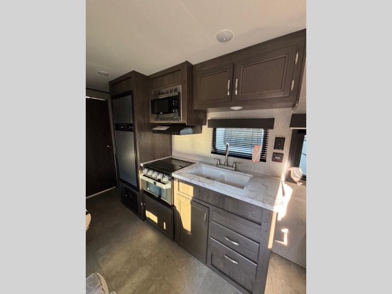 The whole family can head to the campground with this travel trailer! Everyone will start each day feeling re-charged and ready to go after sleeping on the rear corner double bunk beds and the front queen bed, plus the sofa and the booth dinette can also transform into extra sleeping spaces for any friends that want to tag along. The rear corner bathroom comes with a tub/shower that has a skylight above for natural lighting and a wood trimmed mirror to make you feel more at home. There is plenty of storage inside and out between the overhead cabinets, the wardrobes, and the exterior pass-through storage area. You can also add the optional Chil N' Stor feature to the exterior so that you can enjoy a nice, cold beverage without having to go inside to get one!