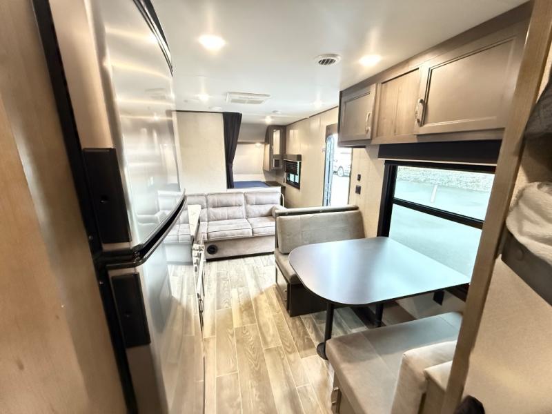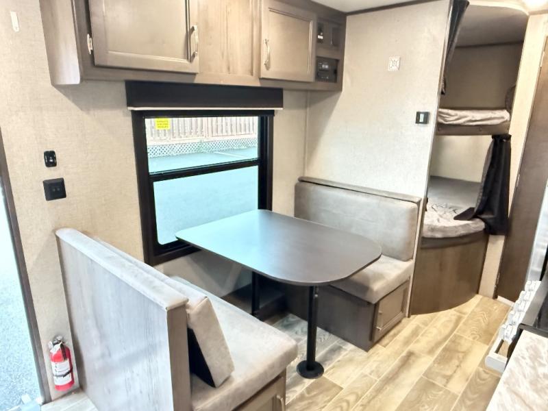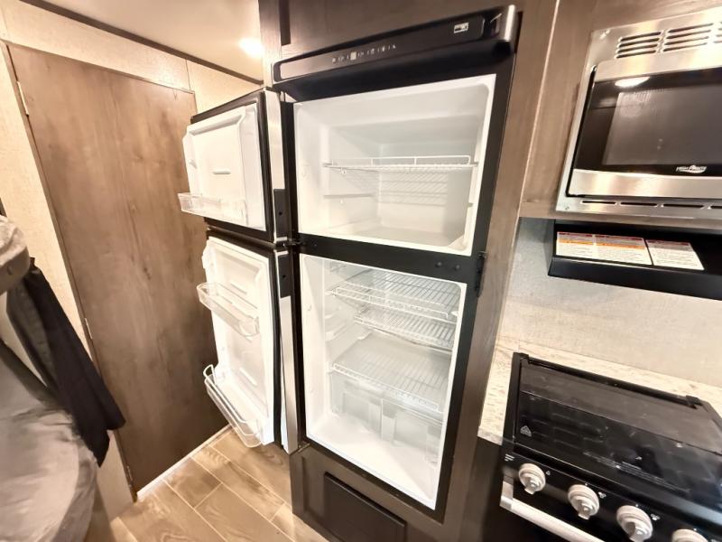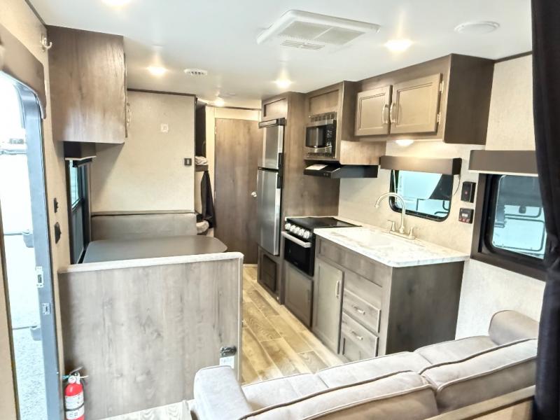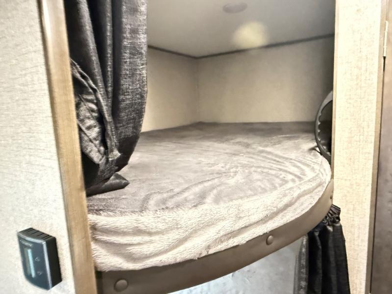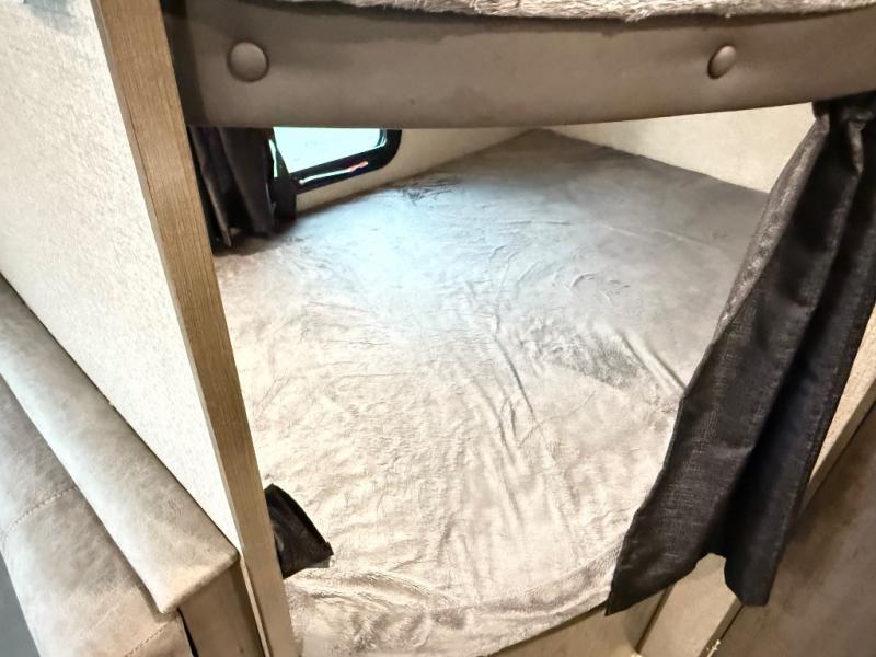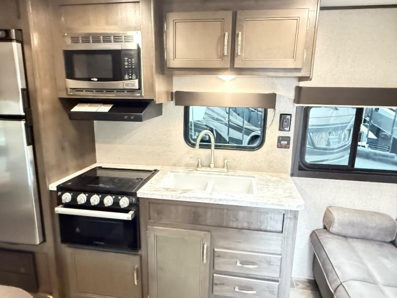 The whole family can head to the campground with this travel trailer! Everyone will start each day feeling re-charged and ready to go after sleeping on the rear corner double bunk beds and the front queen bed, plus the sofa and the booth dinette can also transform into extra sleeping spaces for any friends that want to tag along. The rear corner bathroom comes with a tub/shower that has a skylight above for natural lighting and a wood trimmed mirror to make you feel more at home. There is plenty of storage inside and out between the overhead cabinets, the wardrobes, and the exterior pass-through storage area. You can also add the optional Chil N' Stor feature to the exterior so that you can enjoy a nice, cold beverage without having to go inside to get one!