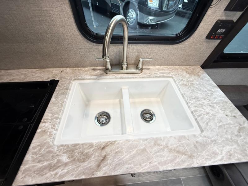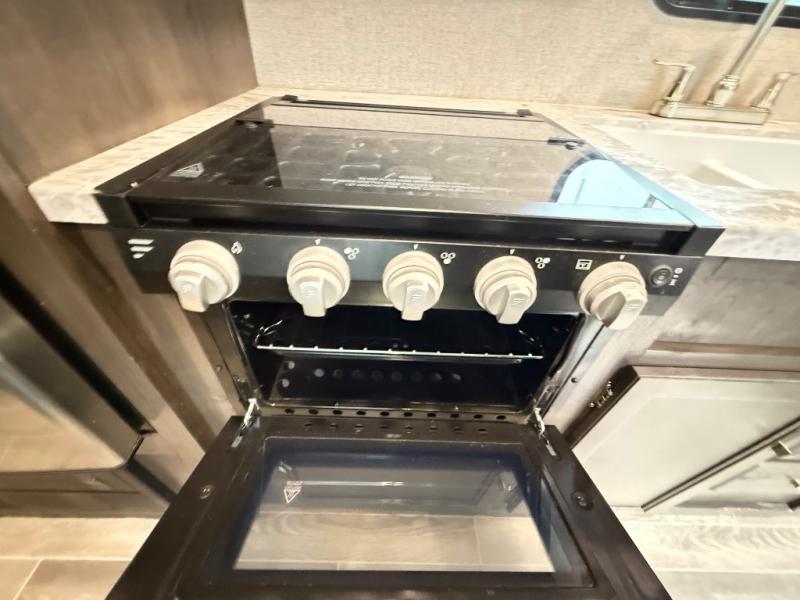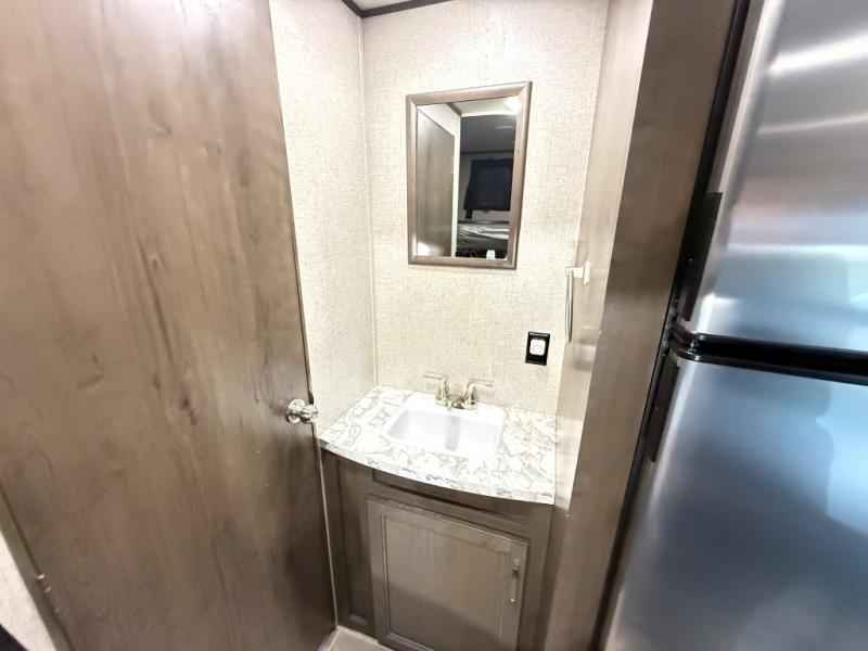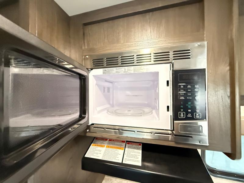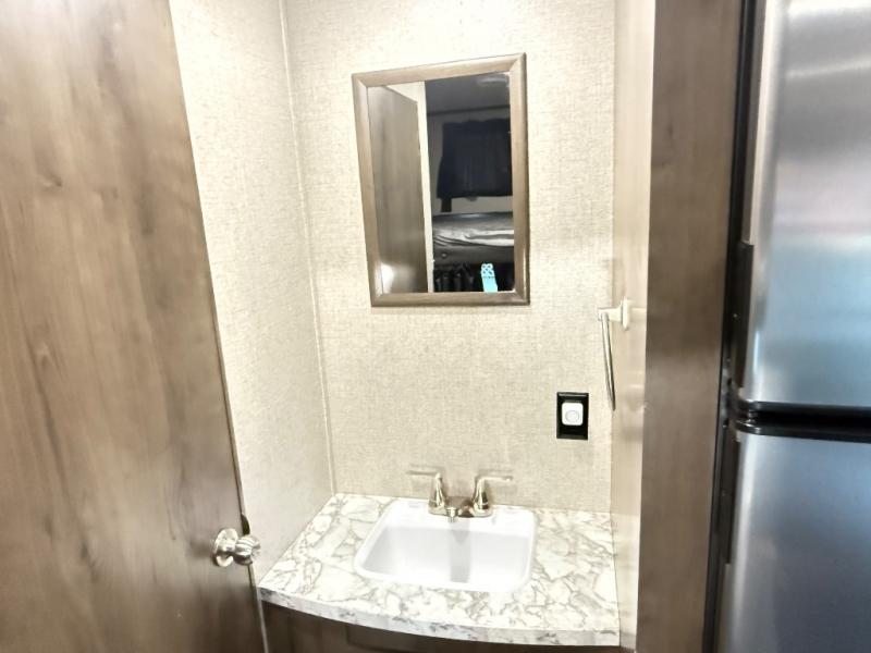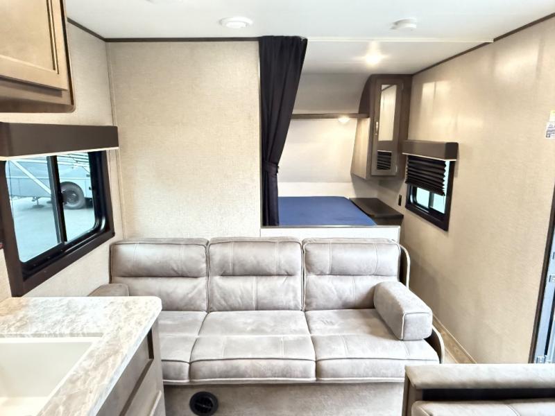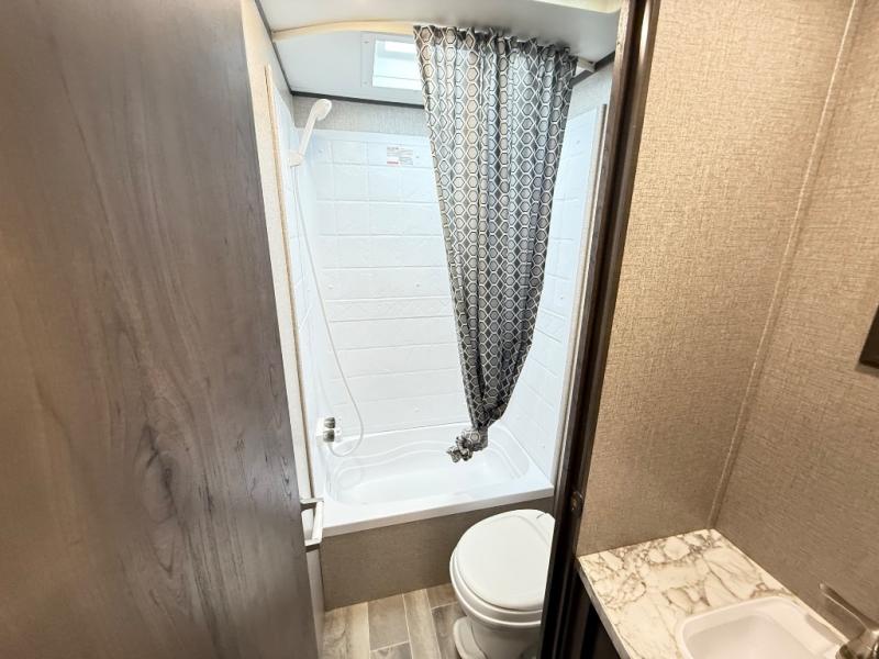 The whole family can head to the campground with this travel trailer! Everyone will start each day feeling re-charged and ready to go after sleeping on the rear corner double bunk beds and the front queen bed, plus the sofa and the booth dinette can also transform into extra sleeping spaces for any friends that want to tag along. The rear corner bathroom comes with a tub/shower that has a skylight above for natural lighting and a wood trimmed mirror to make you feel more at home. There is plenty of storage inside and out between the overhead cabinets, the wardrobes, and the exterior pass-through storage area. You can also add the optional Chil N' Stor feature to the exterior so that you can enjoy a nice, cold beverage without having to go inside to get one!