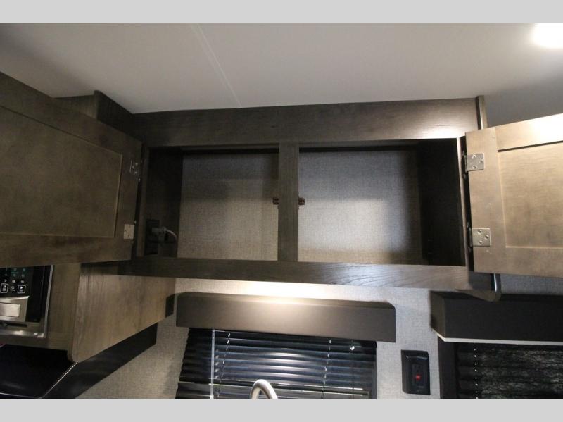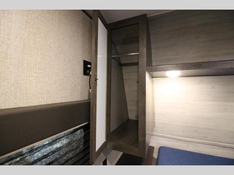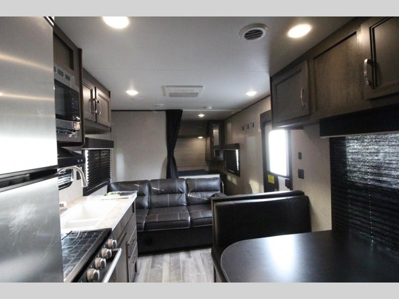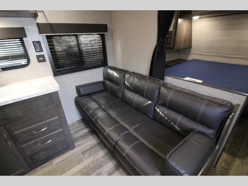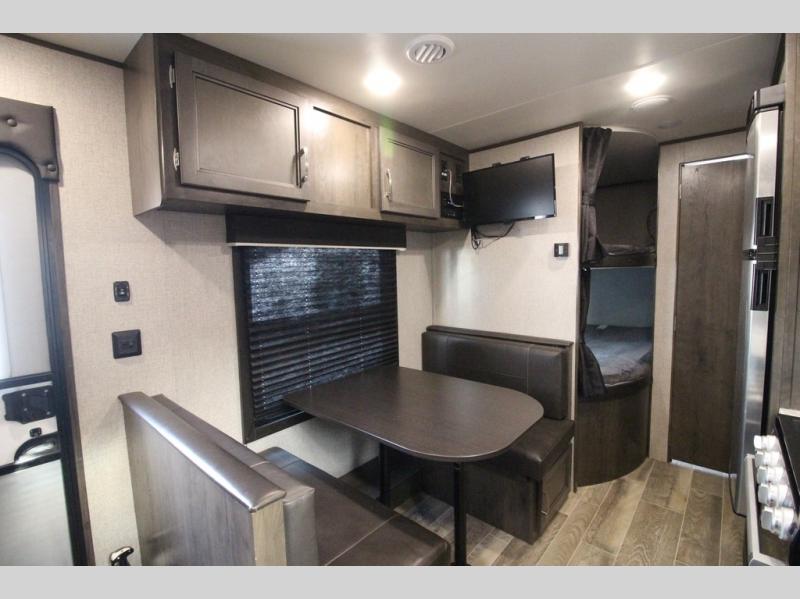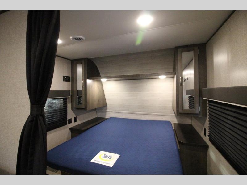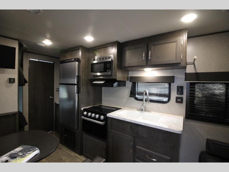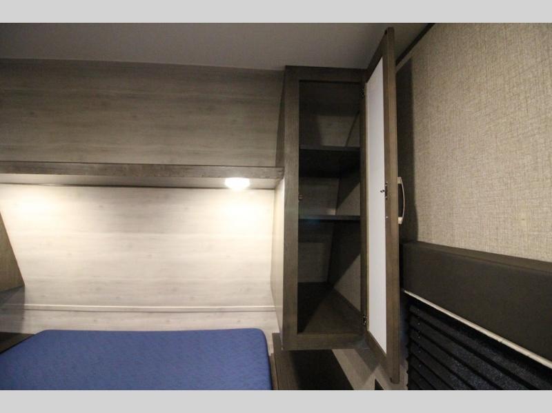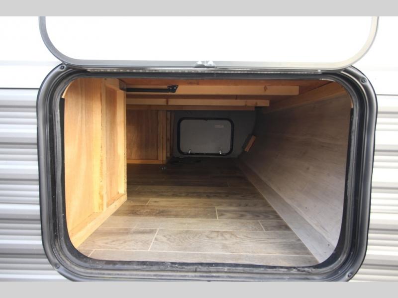 The whole family can head to the campground with this travel trailer! Everyone will start each day feeling re-charged and ready to go after sleeping on the rear corner double bunk beds and the front queen bed, plus the sofa and the booth dinette can also transform into extra sleeping spaces for any friends that want to tag along. The rear corner bathroom comes with a tub/shower that has a skylight above for natural lighting and a wood trimmed mirror to make you feel more at home. There is plenty of storage inside and out between the overhead cabinets, the wardrobes, and the exterior pass-through storage area. You can also add the optional Chil N' Stor feature to the exterior so that you can enjoy a nice, cold beverage without having to go inside to get one!