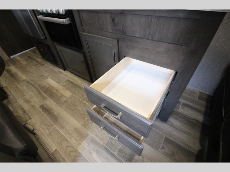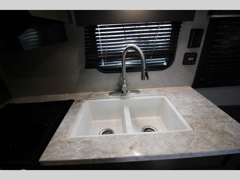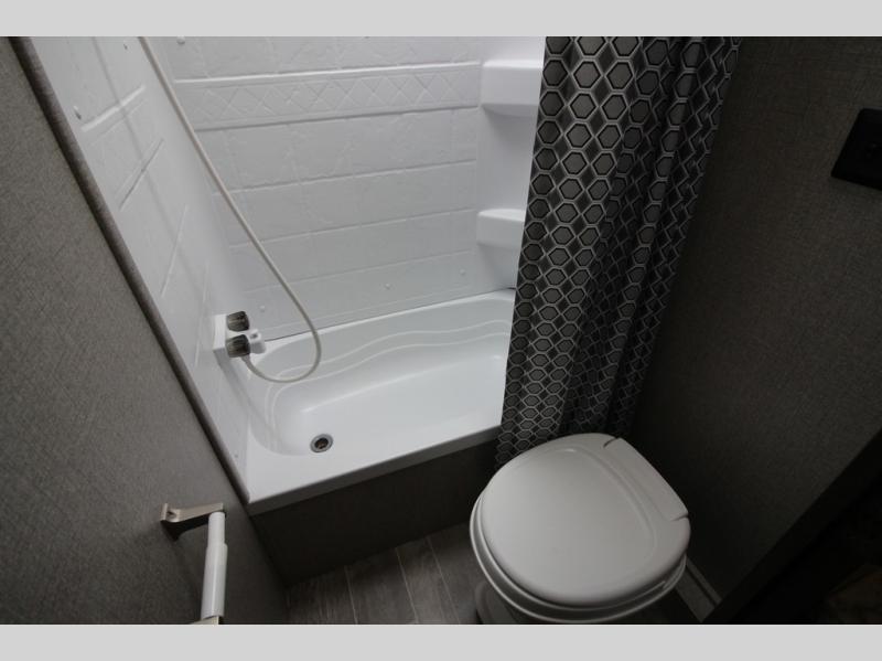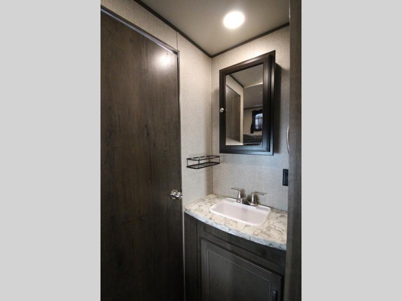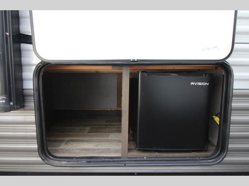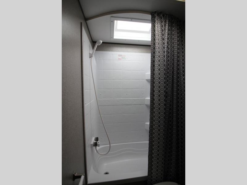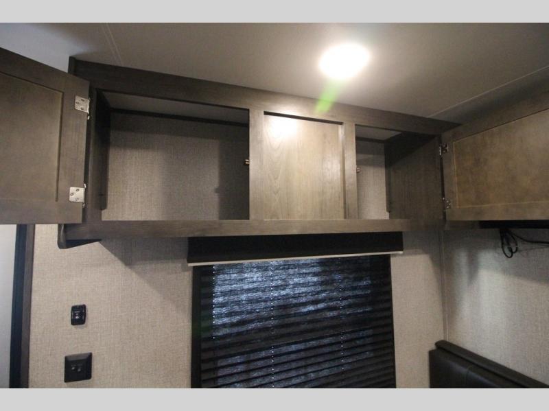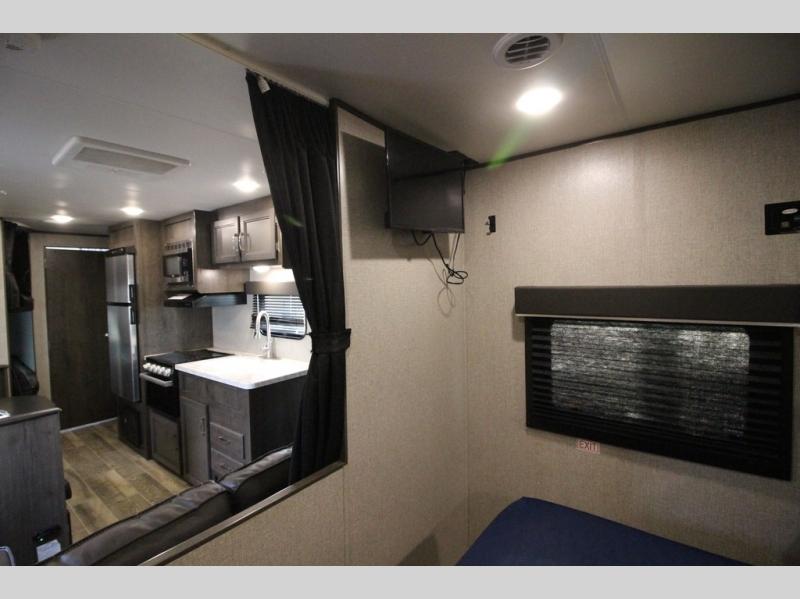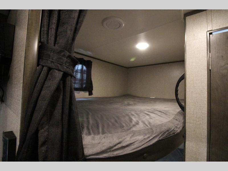 The whole family can head to the campground with this travel trailer! Everyone will start each day feeling re-charged and ready to go after sleeping on the rear corner double bunk beds and the front queen bed, plus the sofa and the booth dinette can also transform into extra sleeping spaces for any friends that want to tag along. The rear corner bathroom comes with a tub/shower that has a skylight above for natural lighting and a wood trimmed mirror to make you feel more at home. There is plenty of storage inside and out between the overhead cabinets, the wardrobes, and the exterior pass-through storage area. You can also add the optional Chil N' Stor feature to the exterior so that you can enjoy a nice, cold beverage without having to go inside to get one!