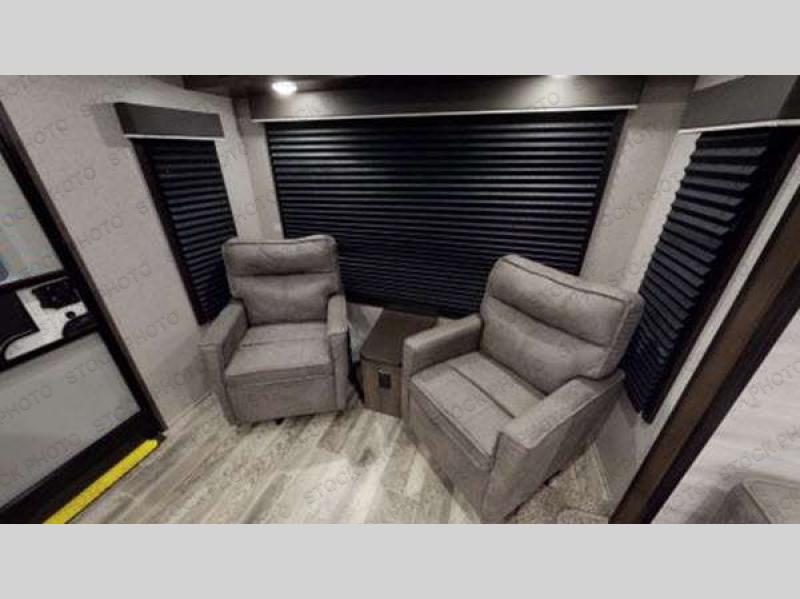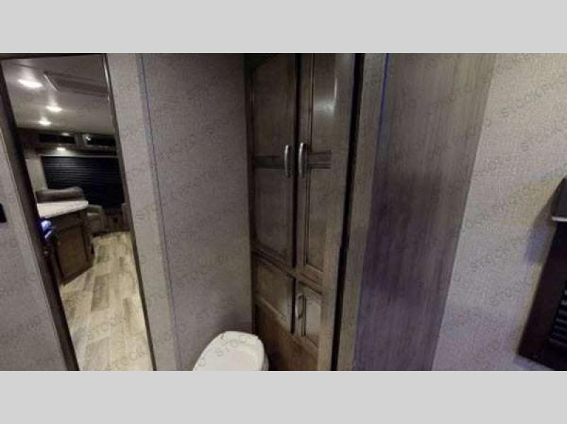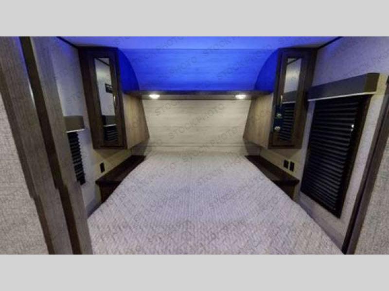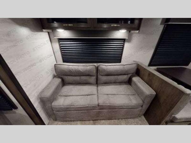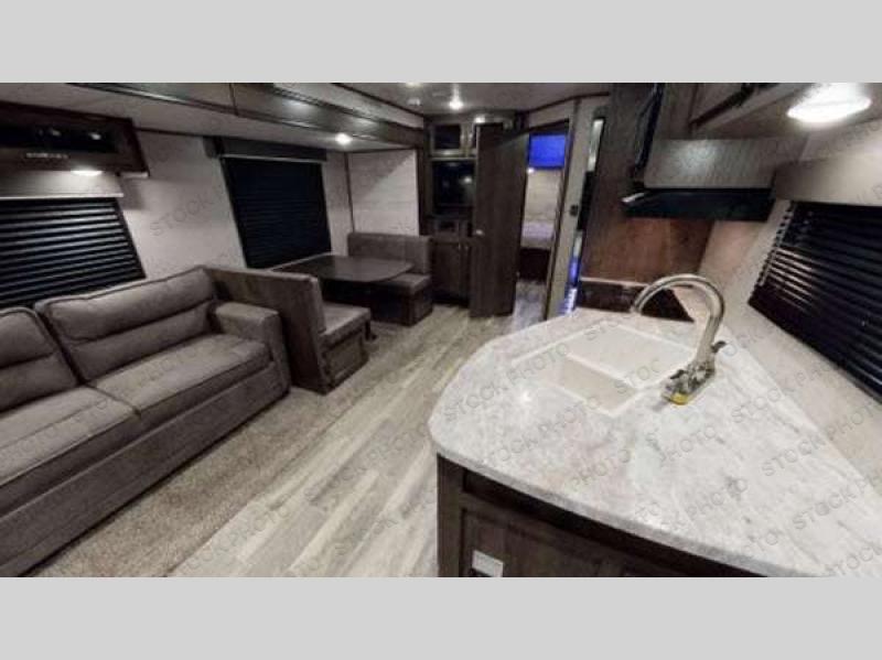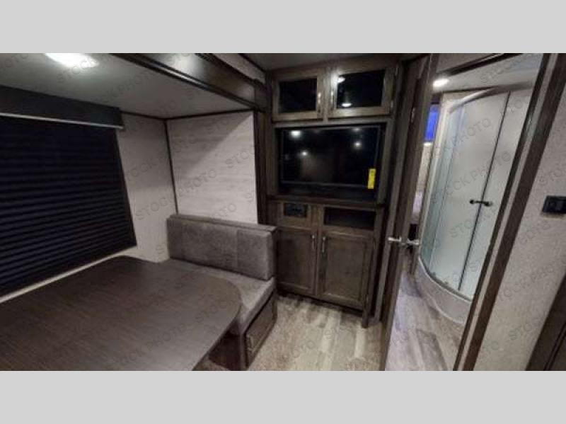 Find your favorite campsite and load up this travel trailer! With dual entry doors, you will experience a smooth flow of traffic in and out of the unit, plus one of the entrances leads directly into the front private bedroom. The bedroom has a queen bed with wardrobes on either side to keep your clothes looking their best and has an entrance into the walk-through bathroom for easy access at night. Grab the eggs and bacon from the 6 cu. ft. stainless steel refrigerator with temperature controls and fry them up at the three burner range glass top then enjoy eating it all at the booth dinette. If you ate a little too much then you can relax on the sofa or in one of the two swivel rockers before heading out to a fun day at the beach!