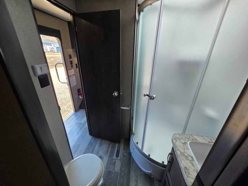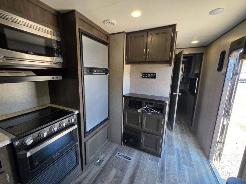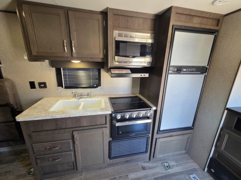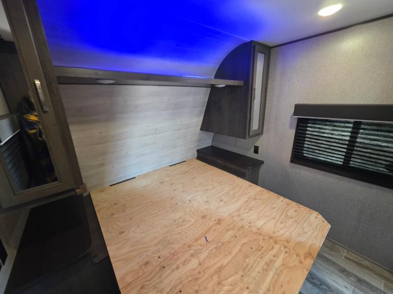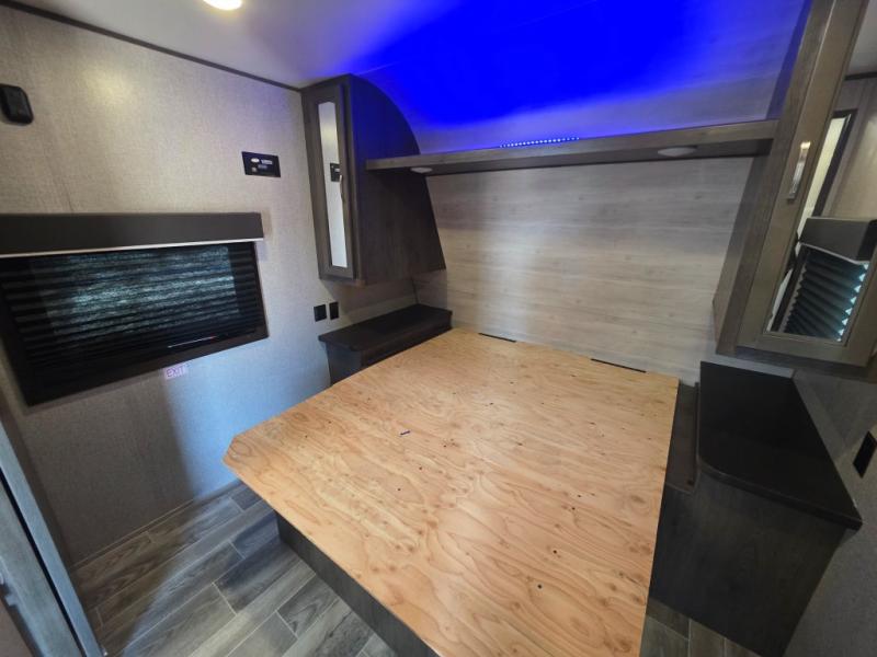 You can load up your favorite off-road toys into this toy hauler and know that they will arrive safely thanks to the D-rings welded to the frame! The whole gang can relax together with the dual convertible sofas with a removable table in between and the fold-up sofa by the entertainment center. The dual entry bathroom makes it easy for everyone to access and take a hot, steamy shower in the radius shower with a skylight above for natural lighting. The front private bedroom features a walk-around queen bed with a bedspread for you to enjoy a good night's rest, wardrobes on either side of it to hang your clothes, and the second entrance into the bathroom. Don't worry about leaving any camping items behind because the pass-through storage area has you covered!