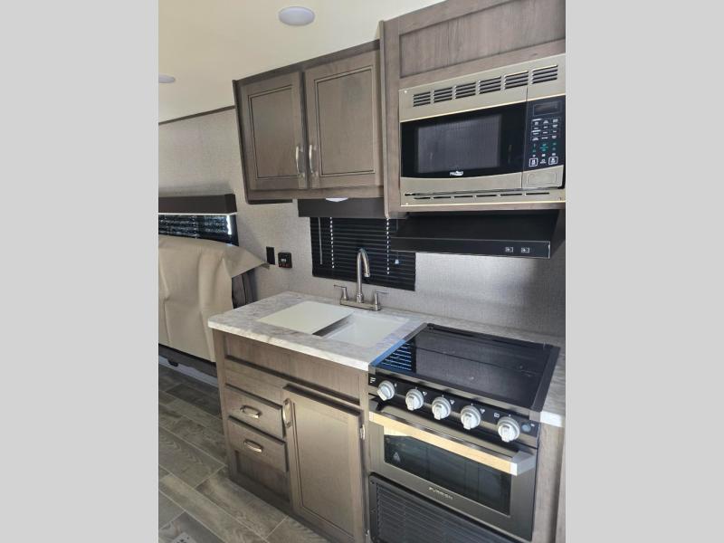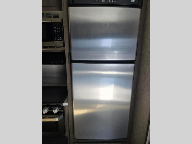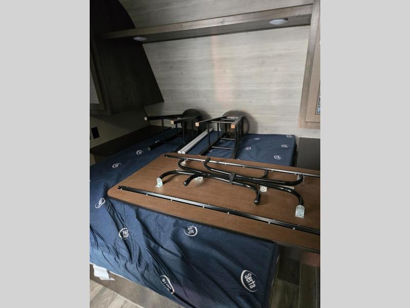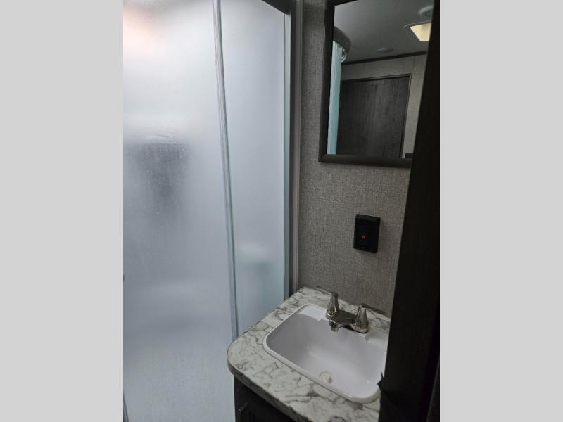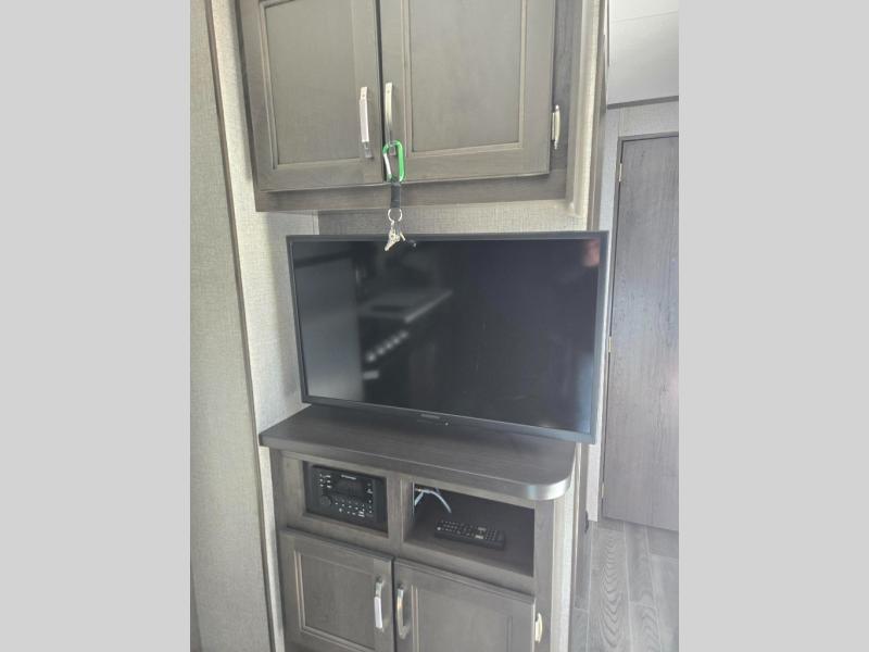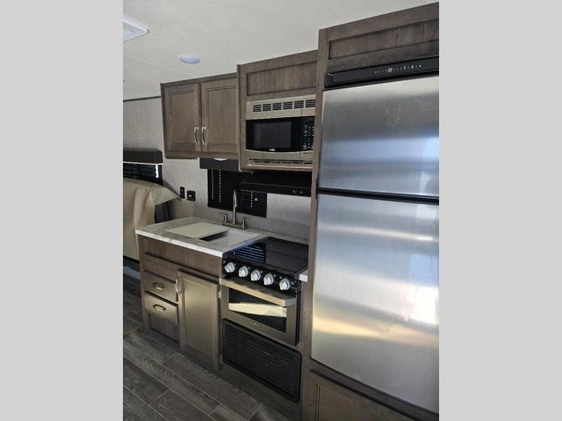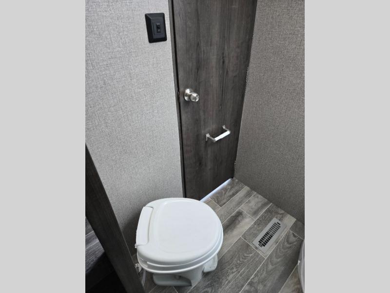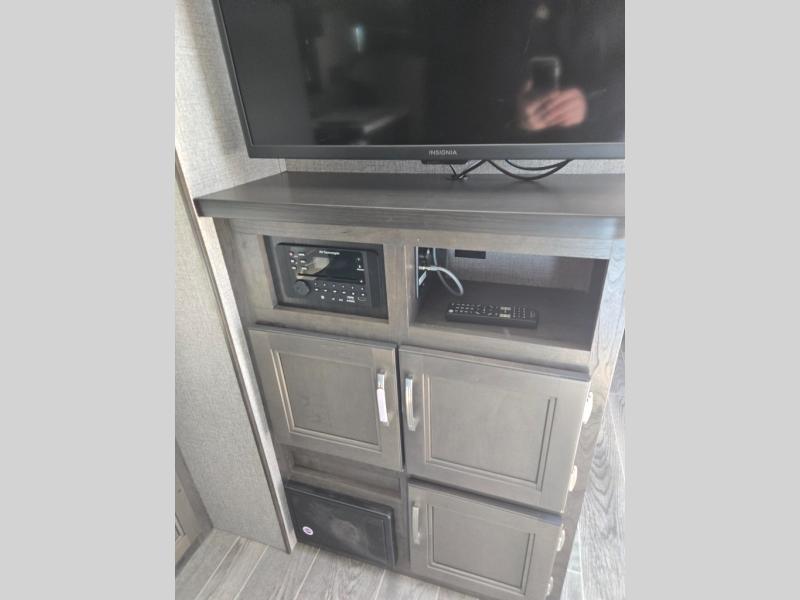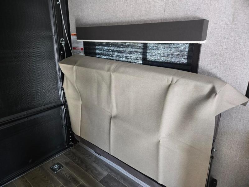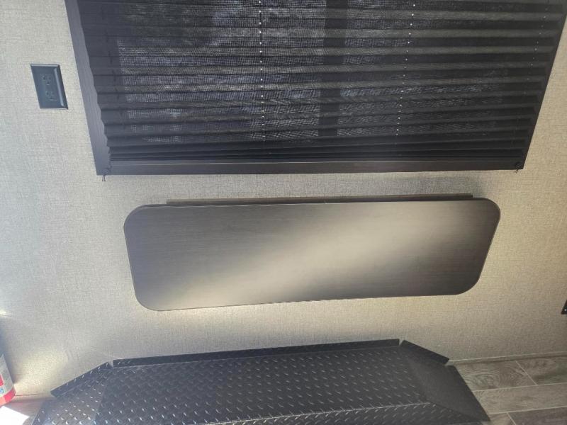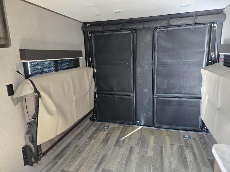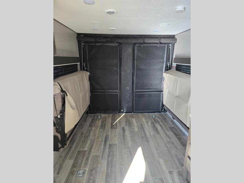 You can load up your favorite off-road toys into this toy hauler and know that they will arrive safely thanks to the D-rings welded to the frame! The whole gang can relax together with the dual convertible sofas with a removable table in between and the fold-up sofa by the entertainment center. The dual entry bathroom makes it easy for everyone to access and take a hot, steamy shower in the radius shower with a skylight above for natural lighting. The front private bedroom features a walk-around queen bed with a bedspread for you to enjoy a good night's rest, wardrobes on either side of it to hang your clothes, and the second entrance into the bathroom. Don't worry about leaving any camping items behind because the pass-through storage area has you covered!