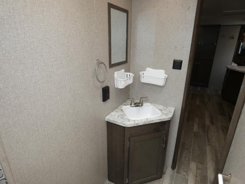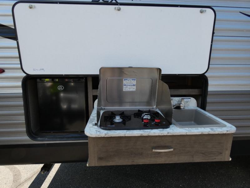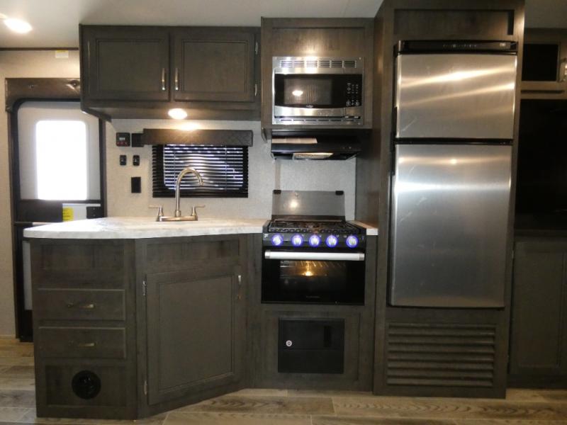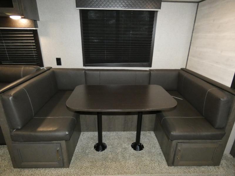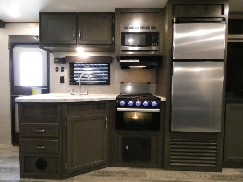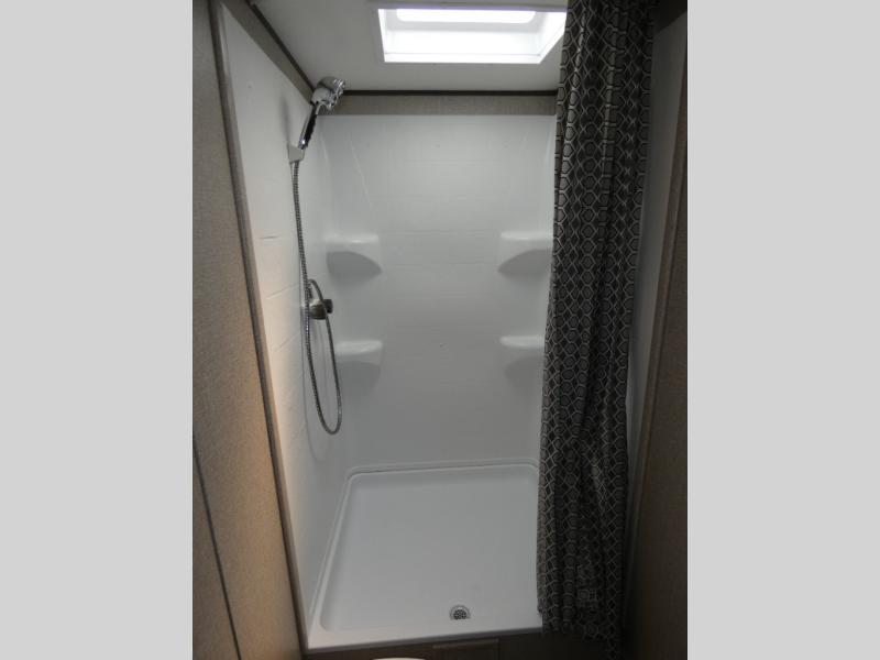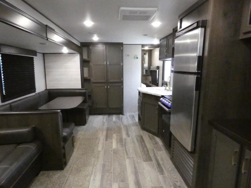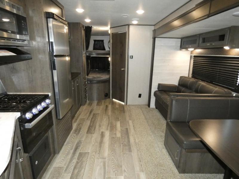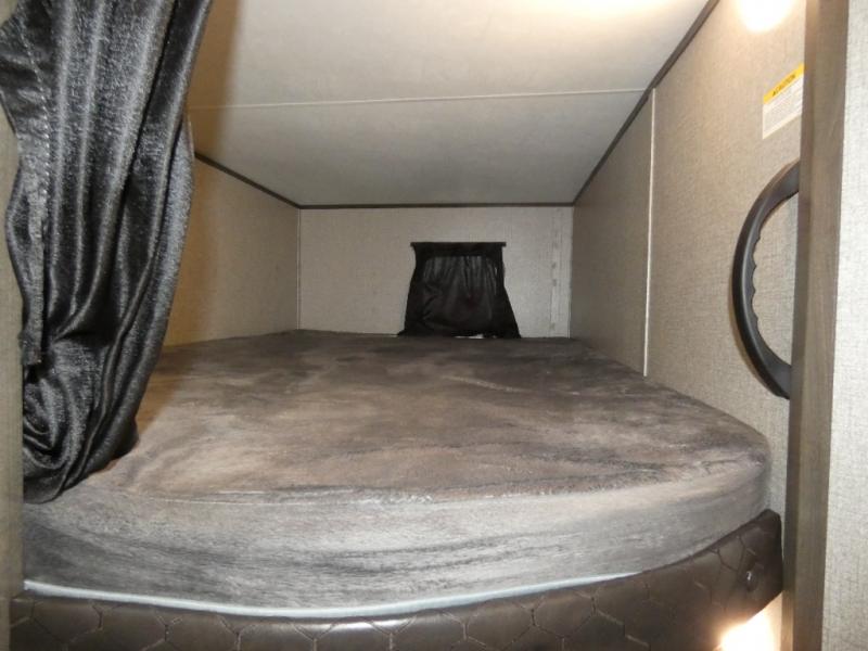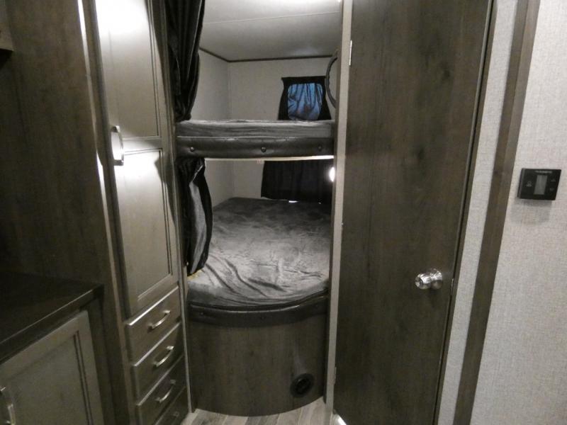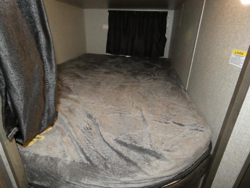You won't want to camp any other way than in this travel trailer once you step inside! The kids will love sleeping on the rear corner double bunk beds with a privacy curtain and love having the rear corner bathroom right next to them too, especially at night. The U-shaped dinette and sofa slide offers enough seating space for everyone to gather together and watch a movie at the entertainment center. You can even pop a bag of popcorn into the microwave and grab your favorite beverage from the 6 cu. ft. stainless steel refrigerator with temperature controls to complete the perfect movie night ambiance. When you're ready to hit the hay head to the front private bedroom and lay down on the comfortable queen bed with a shelf above it to set your clock!