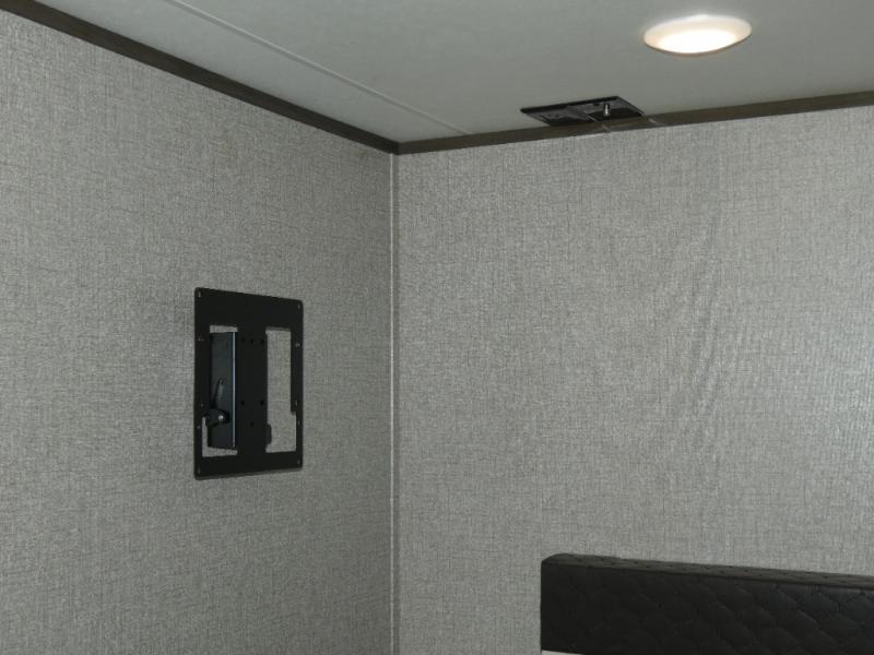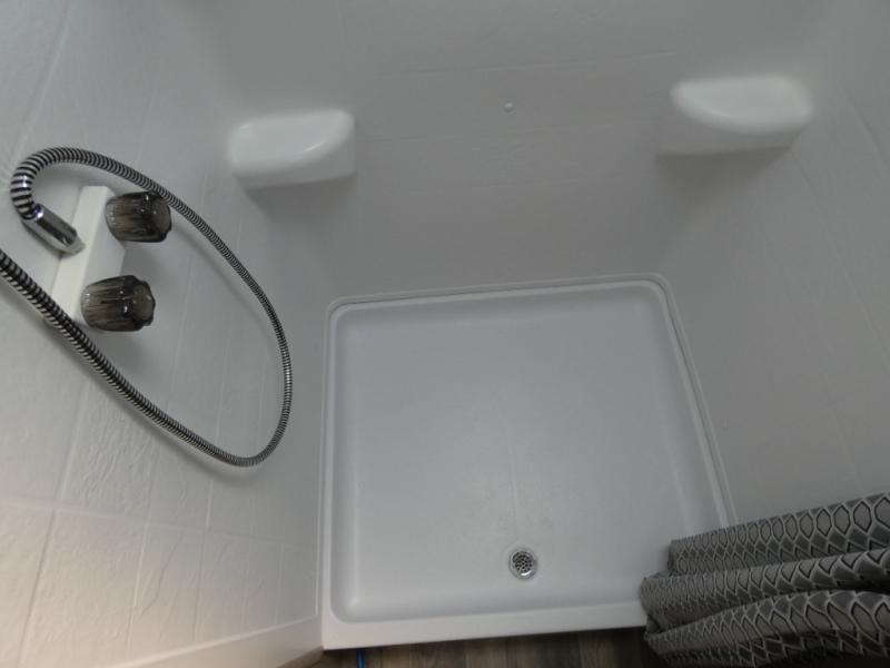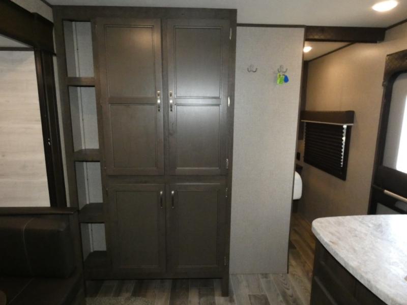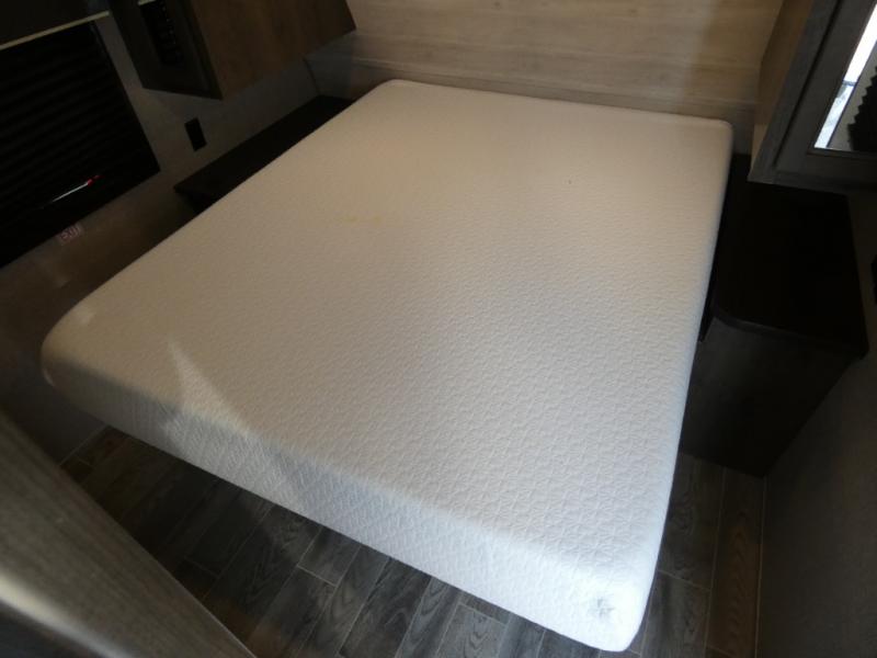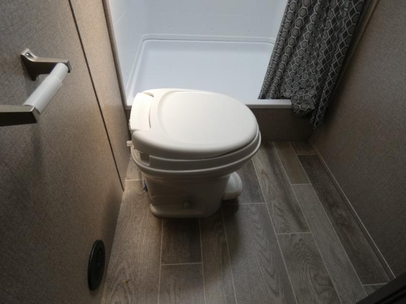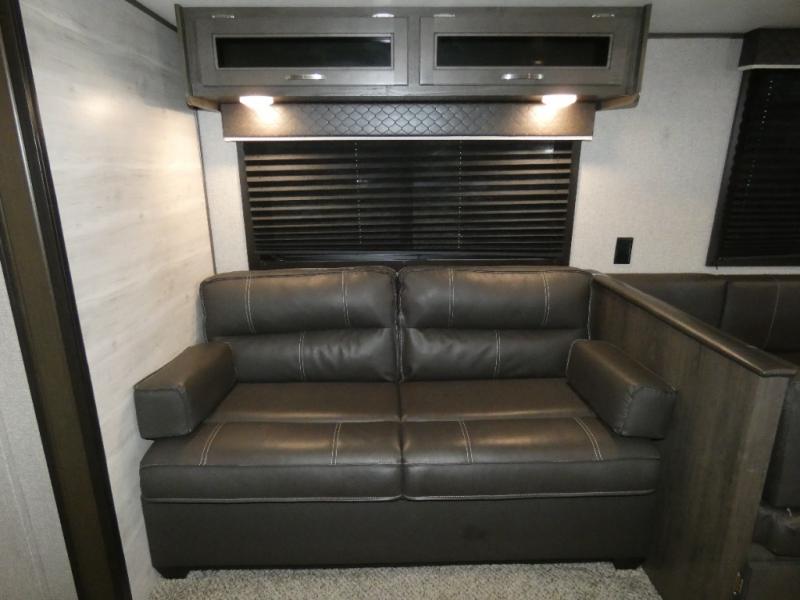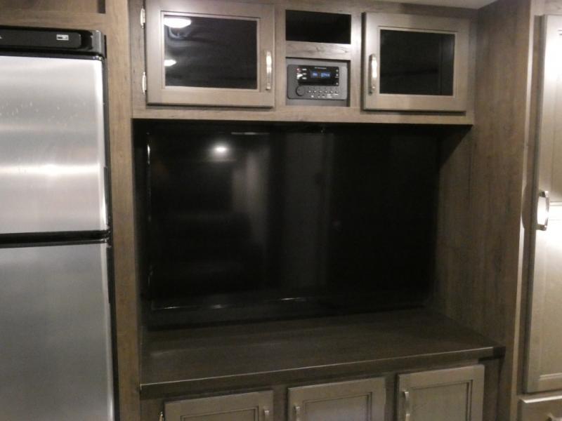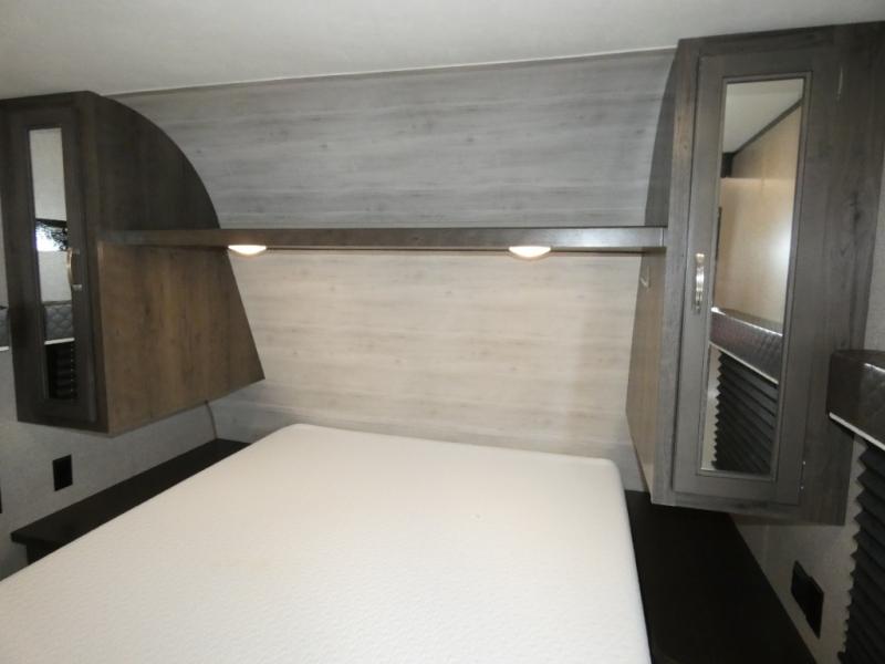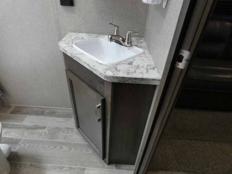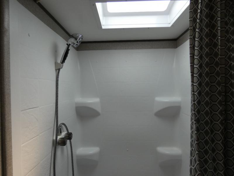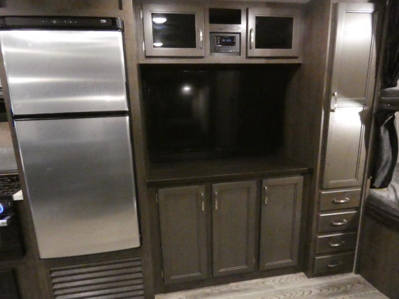 You won't want to camp any other way than in this travel trailer once you step inside! The kids will love sleeping on the rear corner double bunk beds with a privacy curtain and love having the rear corner bathroom right next to them too, especially at night. The U-shaped dinette and sofa slide offers enough seating space for everyone to gather together and watch a movie at the entertainment center. You can even pop a bag of popcorn into the microwave and grab your favorite beverage from the 6 cu. ft. stainless steel refrigerator with temperature controls to complete the perfect movie night ambiance. When you're ready to hit the hay head to the front private bedroom and lay down on the comfortable queen bed with a shelf above it to set your clock!