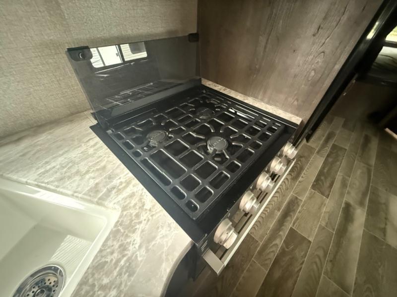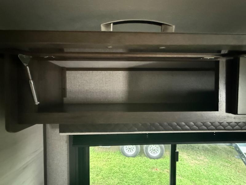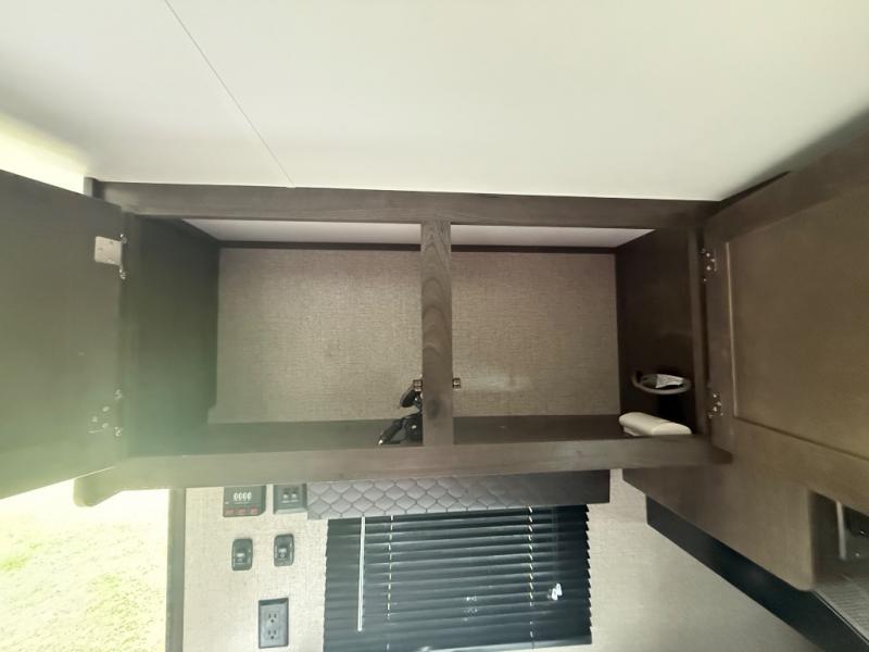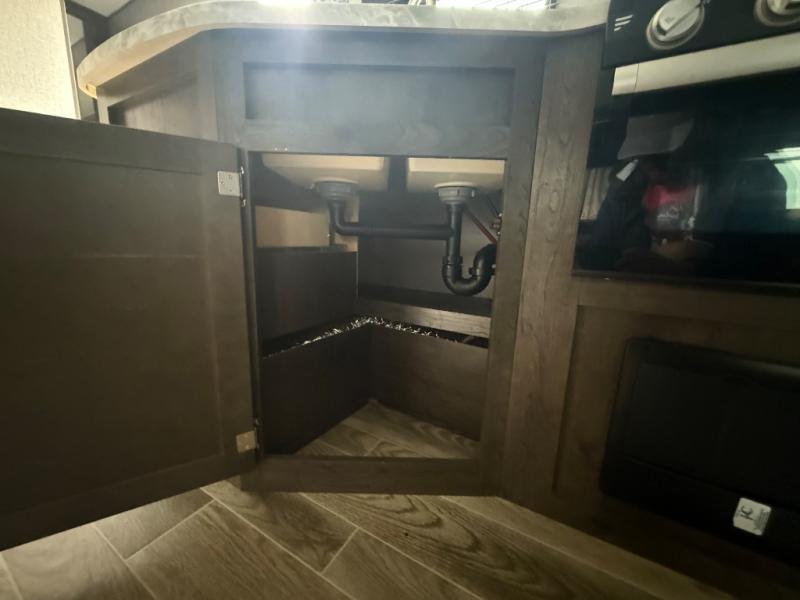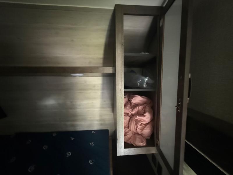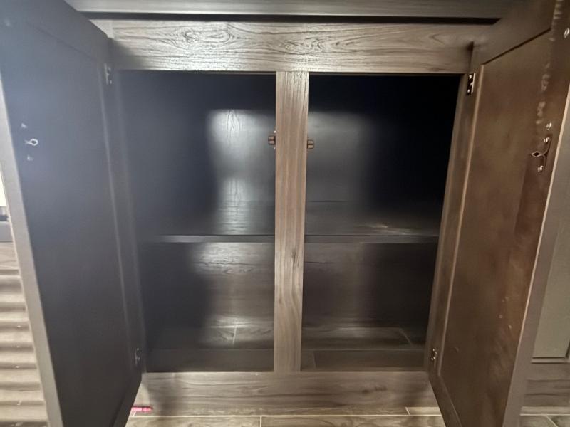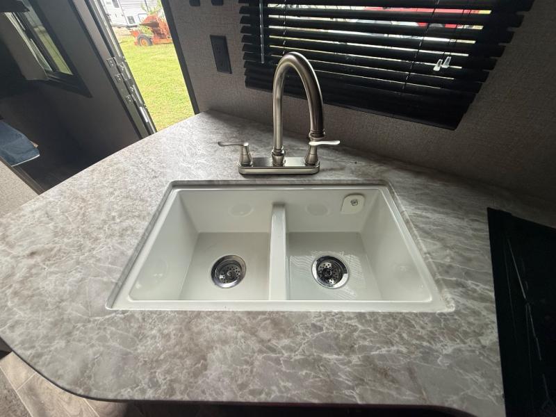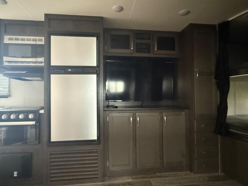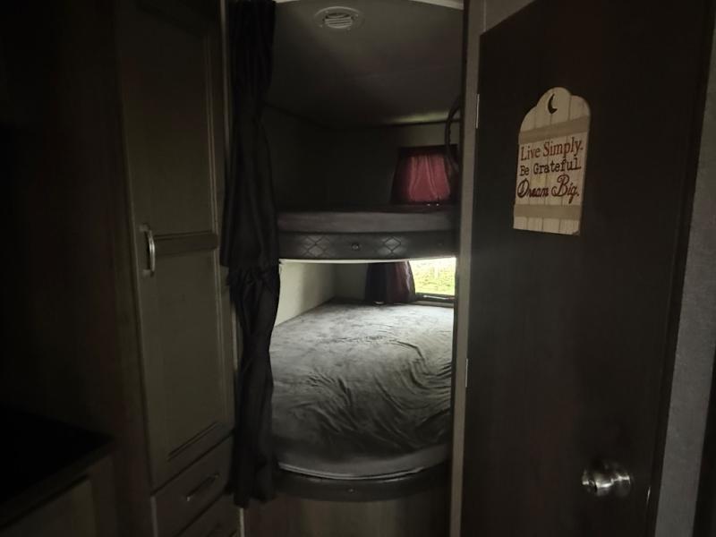 Loads of fun like hiking, fishing, and playing outdoor camping games are waiting for you to make that reservation, hitch up and head out! This trailer allows the owners to sleep in privacy behind the space saving sliding door on a queen bed. And the kids or grandkids can sleep on the double size bunks in the rear next to the full bathroom including a tub/shower. They even have a wardrobe nearby for their things. The slide out jack-knife sofa and U-shaped dinette offers more floor space, a place to relax and dine, plus you can play games at the dinette. The kitchen includes full amenities at your fingertips, plus you all can enjoy the entertainment center with TV when inside. When you want to be outdoors, relax under the 16' power awning after grabbing your camping chairs, and the cook can make a snack on the outside kitchen.