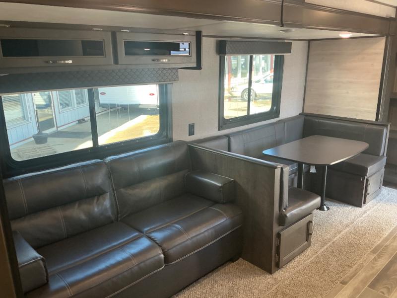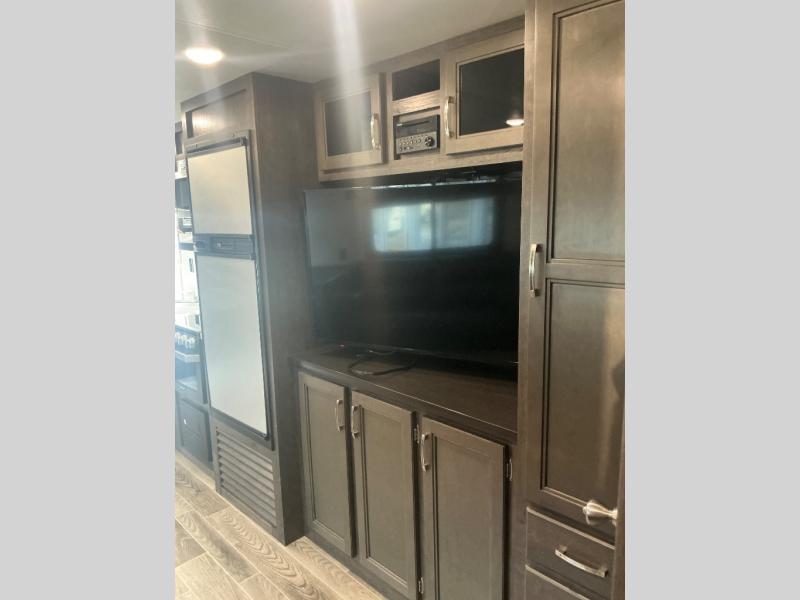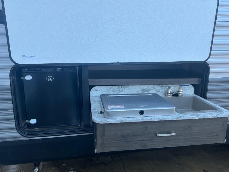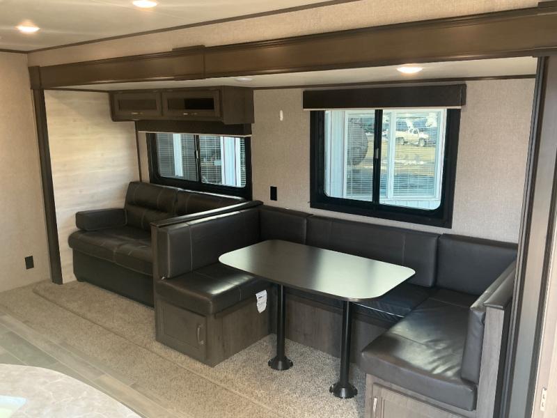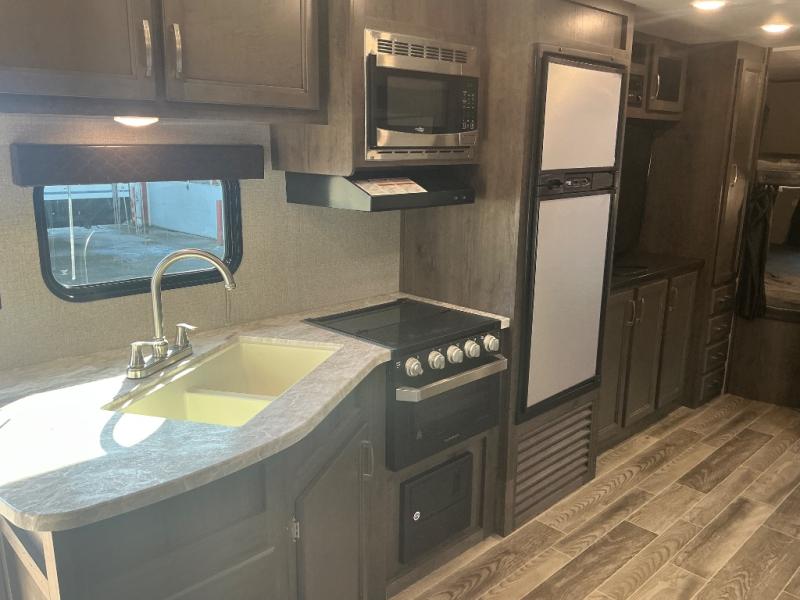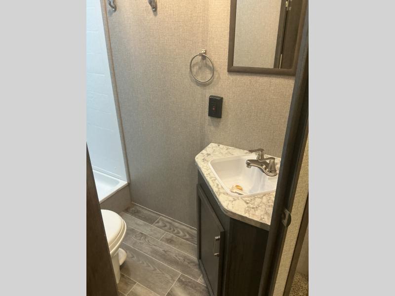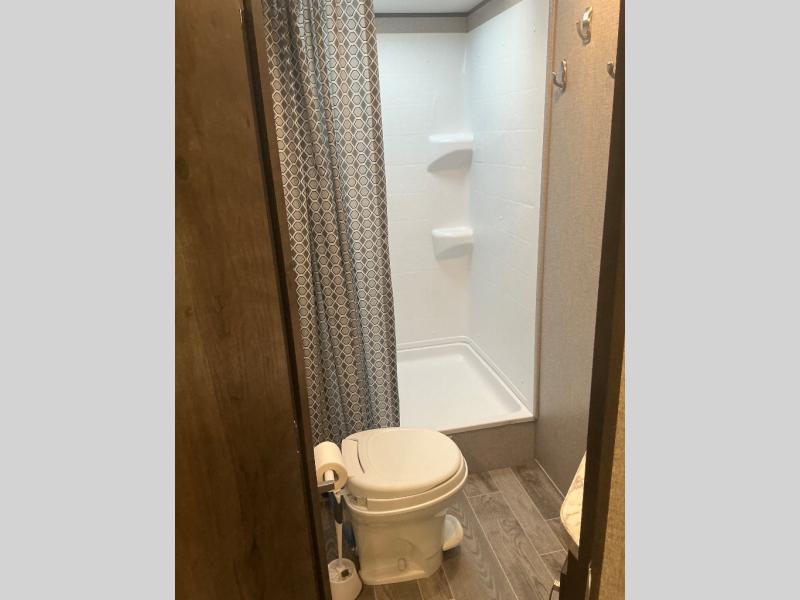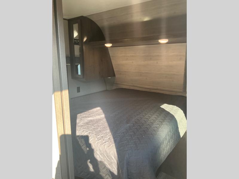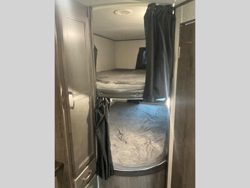 You won't want to camp any other way than in this travel trailer once you step inside! The kids will love sleeping on the rear corner double bunk beds with a privacy curtain and love having the rear corner bathroom right next to them too, especially at night. The U-shaped dinette and sofa slide offers enough seating space for everyone to gather together and watch a movie at the entertainment center. You can even pop a bag of popcorn into the microwave and grab your favorite beverage from the 6 cu. ft. stainless steel refrigerator with temperature controls to complete the perfect movie night ambiance. When you're ready to hit the hay head to the front private bedroom and lay down on the comfortable queen bed with a shelf above it to set your clock!