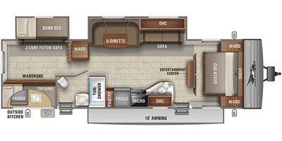 This travel trailer is perfect for a large family who wants to enjoy time together at the campsite! You will enjoy a good night's rest each night on the walk-around queen bed in the front private bedroom, and the kiddos can sleep in the rear private bunkhouse on either the top bunk above the wardrobe, the bunk above the J-cube futon sofa or the sofa once converted, plus they can bring more friends to sleep on the U-shaped dinette or the J-Steel™ jackknife sofa once converted. The second entrance leads right into the spacious bathroom which has a tub/shower for you to clean up after playing at the beach. The exterior also has an outside shower for you to rinse the sand off before entering the unit, and a power awning with LED lights and speakers to crank up the tunes while playing games underneath it at night!