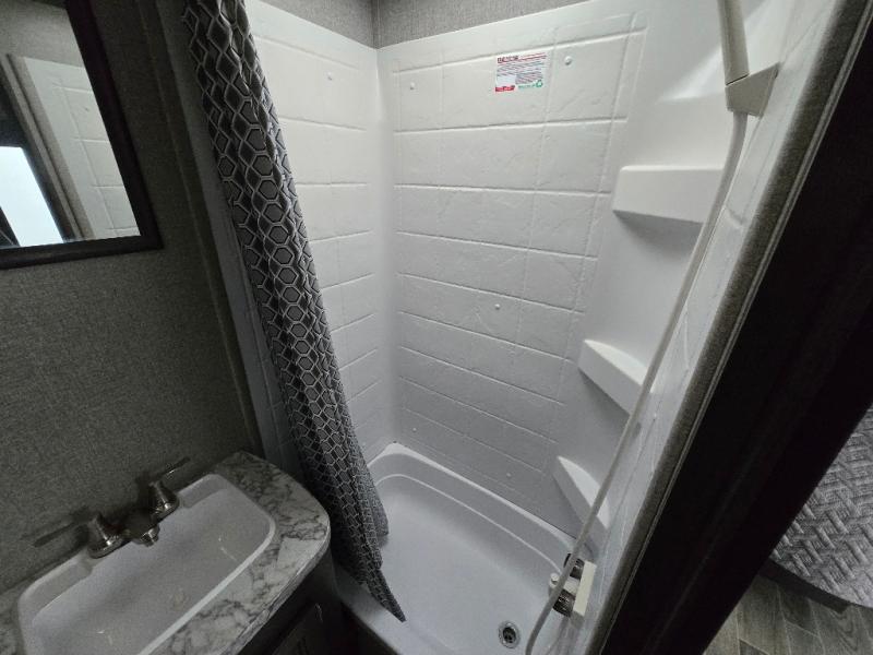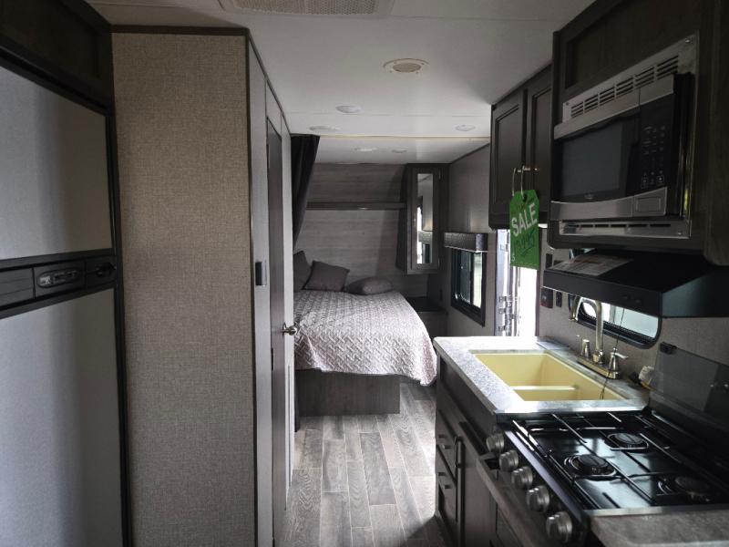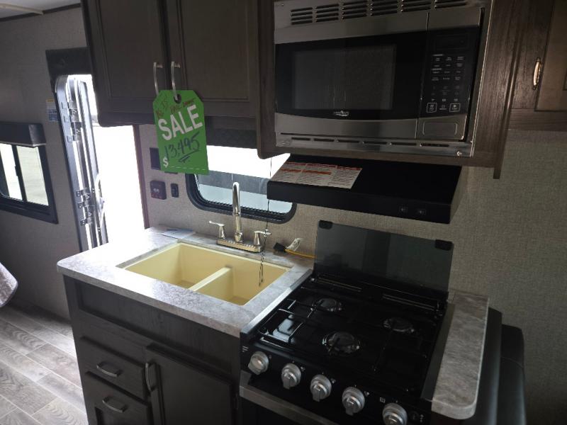 You will be so pleased with this Jay Flight SLX Western Edition travel trailer! This model has both a jackknife sofa and a booth dinette for socializing and relaxing, and it also has a full bathroom with a foot-flush toilet, a tub/shower, a wood-trimmed mirror, and a skylight. The kitchen is filled with amenities that will make meal prep quite easy, like a three-burner range, a 6 cubic foot stainless steel refrigerator, a stainless steel microwave oven, a pantry, and a large sink. With bedside wardrobes, you'll be able to keep your clothing hung up and free of wrinkles.
