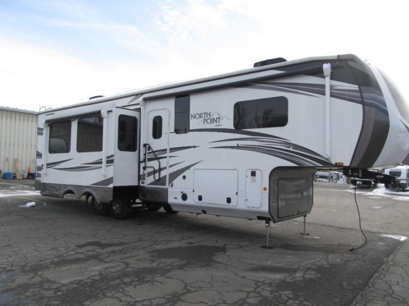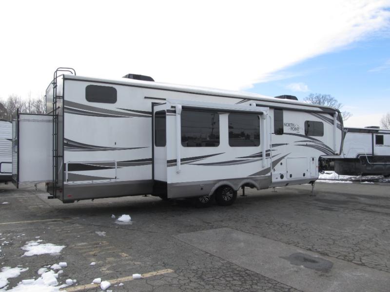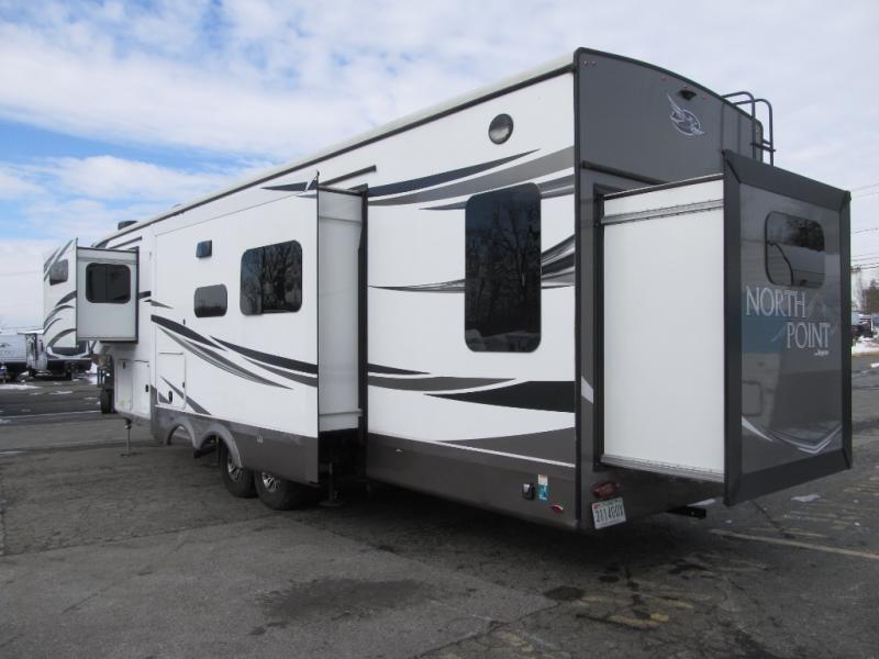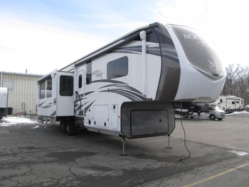 These Jayco North Point fifth wheels offer sleeping spaces and luxurious features to accommodate all types and sizes of groups! You will have generations of family fun with construction features like the Stronghold VBL™ aluminum framed, vacuum bond laminated walls and a Magnum Truss™ XL6™ roof system with a one-piece, seamless DiFlex II material which is the strongest tested roof in the industry. There are three mandatory packages to make your traveling experience even better. One of the packages is a five star handling package which includes Dexter axles with Nev-R-Adjust brakes, Dexter heavy-duty shackles with wet bolt fasteners and bronze bushings to resist the wear and tear of towing, Goodyear beast tires, a MORryde rubberized suspension system, and a MORryde pin box so you can travel forward, backward, and side-to-side for a smoother tow. Come choose your favorite model today!