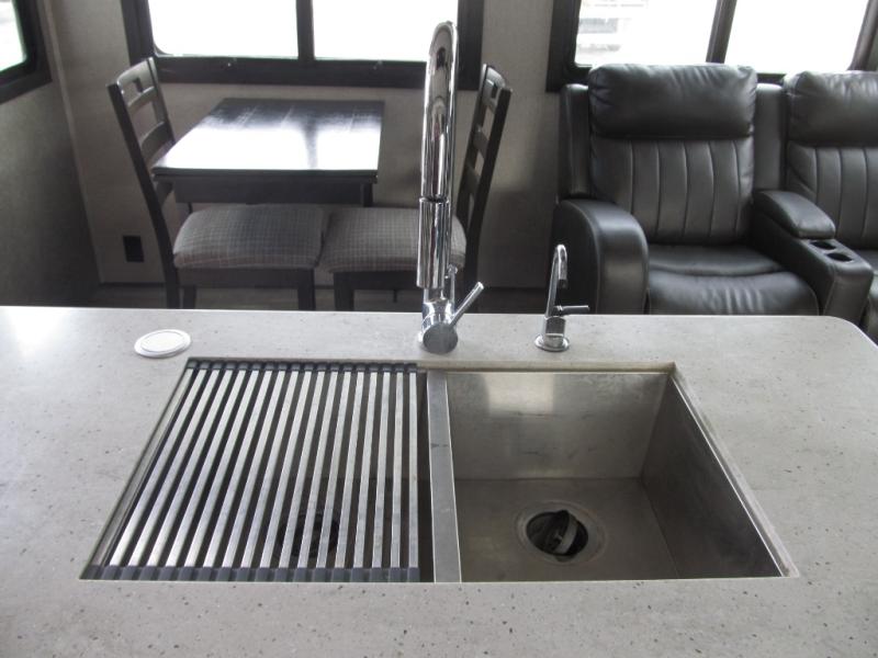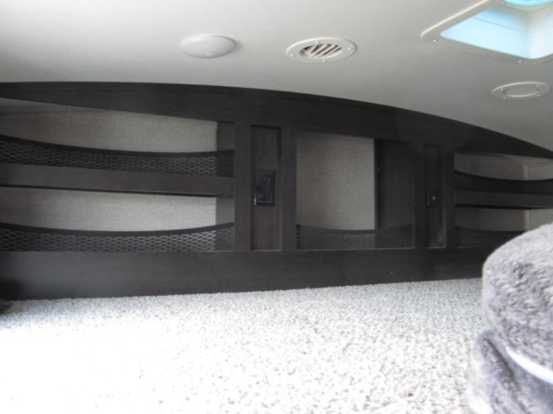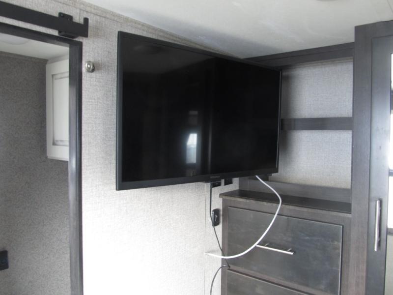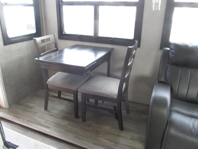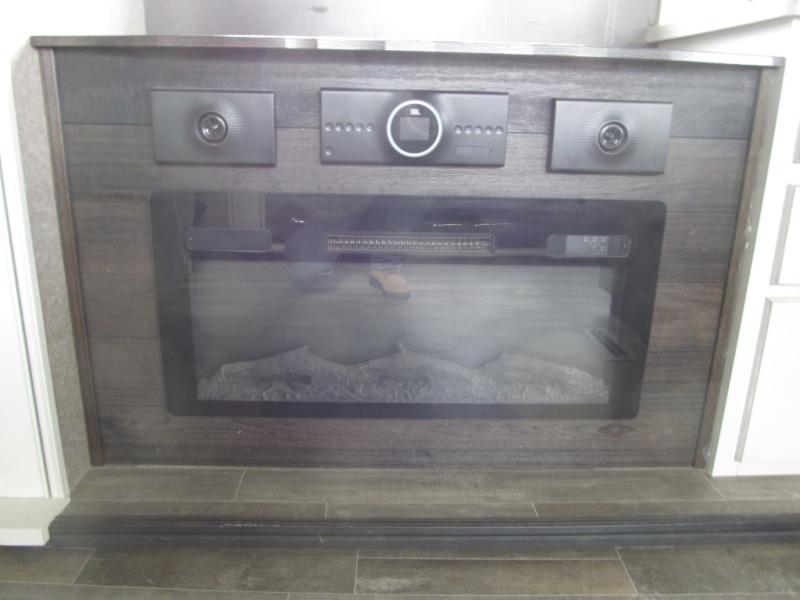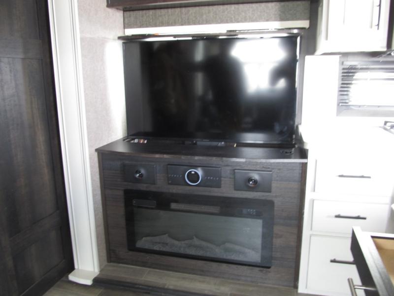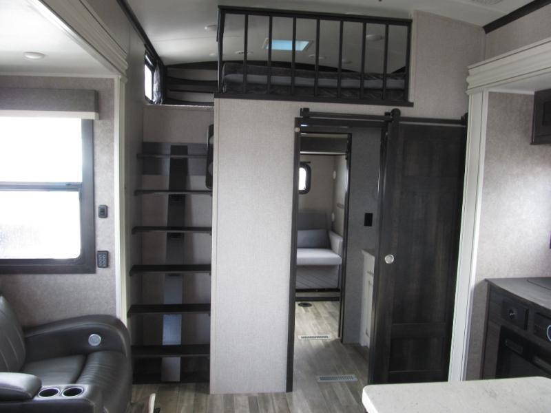 Experience a "hybrid unit" couples coach with this bath and a half fifth wheel! The rear bonus room can be utilized as a bunkhouse with it's flip-up bunk above a tri-fold sofa and removable table, all of which is in a slide out. The oversized loft/storage area above offers the industry's first loft stairs/ladder for easy access. The walk-through half bath is convenient for everyone on this side of the fifth wheel, and the full bathroom next to the front bedroom provides a shower with a seat for everyone to get cleaned up before bedtime. The queen bed, the walk-in closet with hamper and a prepped space for a washer/dryer option, plus the flip-top dresser and 32" TV provide a nice oasis after a full day outdoors. The main area is spacious with dual slides and offers a free standing dinette and theater seats, full kitchen amenities, plus a kitchen island with dishwasher prep and a fireplace!