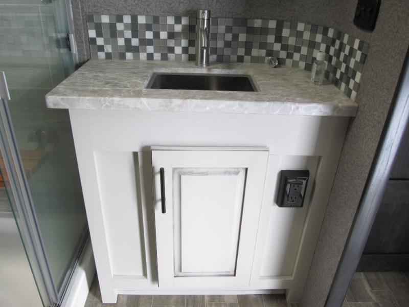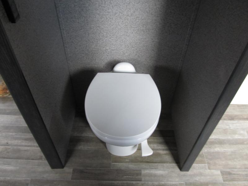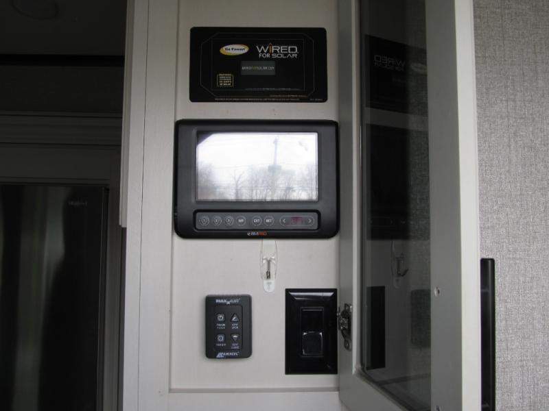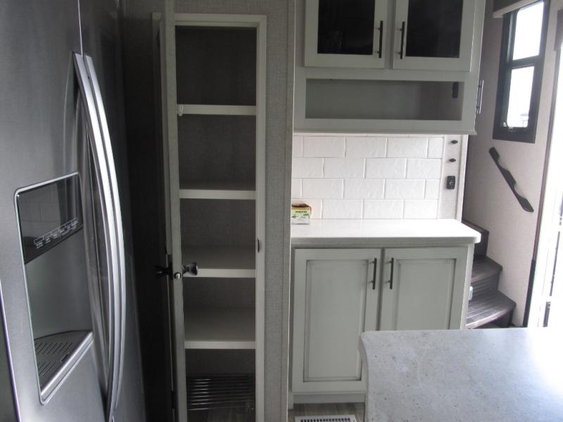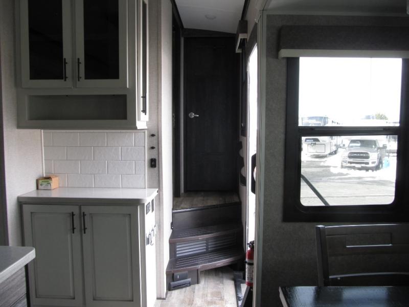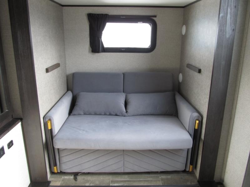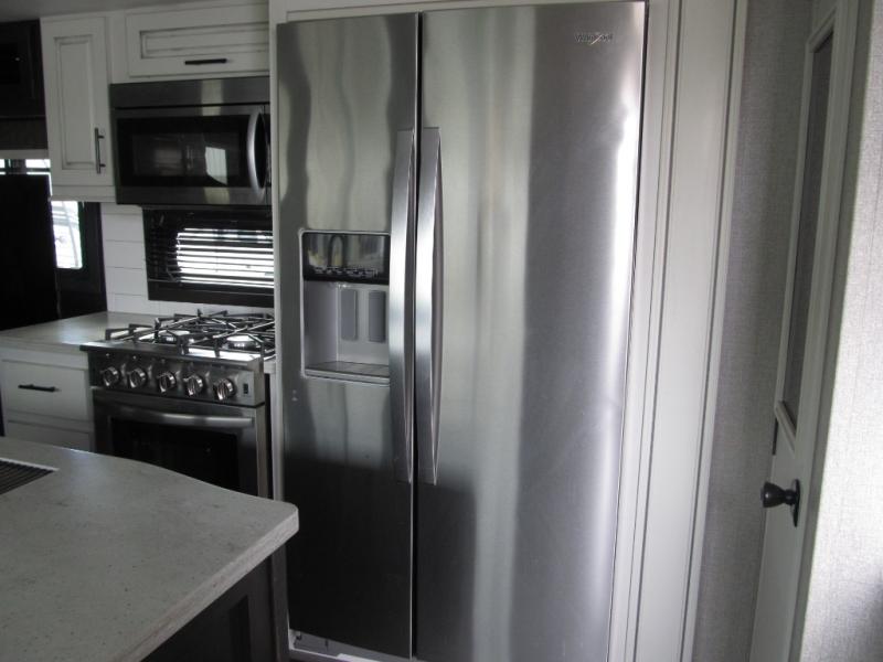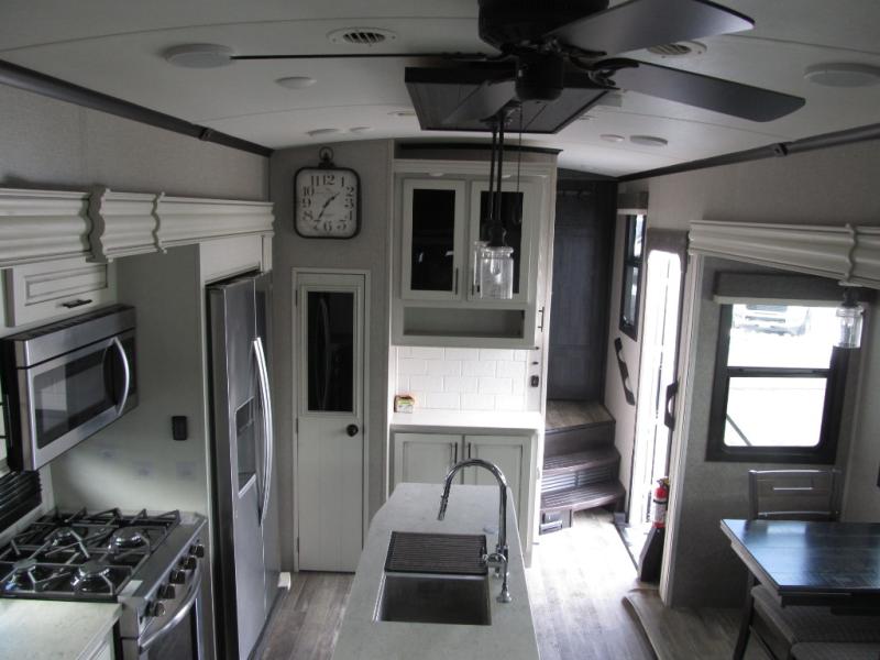 Experience a "hybrid unit" couples coach with this bath and a half fifth wheel! The rear bonus room can be utilized as a bunkhouse with it's flip-up bunk above a tri-fold sofa and removable table, all of which is in a slide out. The oversized loft/storage area above offers the industry's first loft stairs/ladder for easy access. The walk-through half bath is convenient for everyone on this side of the fifth wheel, and the full bathroom next to the front bedroom provides a shower with a seat for everyone to get cleaned up before bedtime. The queen bed, the walk-in closet with hamper and a prepped space for a washer/dryer option, plus the flip-top dresser and 32" TV provide a nice oasis after a full day outdoors. The main area is spacious with dual slides and offers a free standing dinette and theater seats, full kitchen amenities, plus a kitchen island with dishwasher prep and a fireplace!