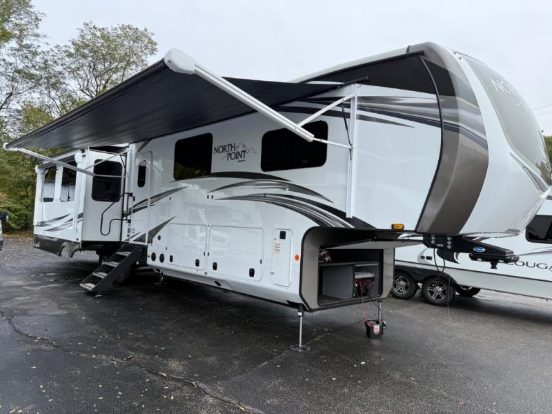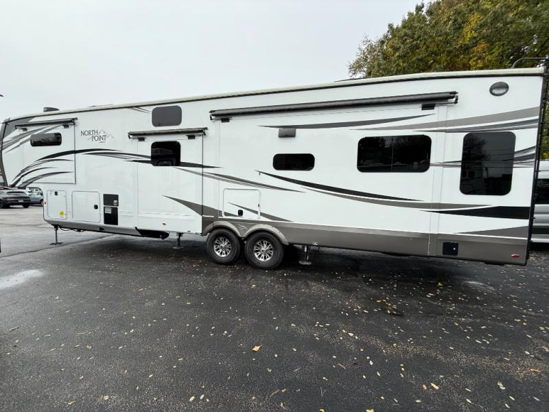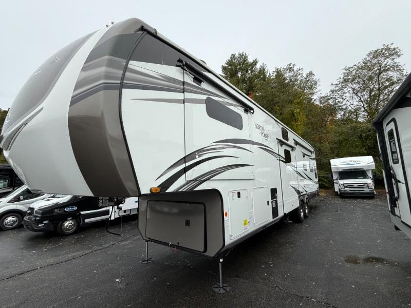 These Jayco North Point fifth wheels offer sleeping spaces and luxurious features to accommodate all types and sizes of groups! You will have generations of family fun with construction features like the Stronghold VBL™ aluminum framed, vacuum bond laminated walls and a Magnum Truss™ XL6™ roof system with a one-piece, seamless DiFlex II material which is the strongest tested roof in the industry. There are three mandatory packages to make your traveling experience even better. One of the packages is a five star handling package which includes Dexter axles with Nev-R-Adjust brakes, Dexter heavy-duty shackles with wet bolt fasteners and bronze bushings to resist the wear and tear of towing, Goodyear beast tires, a MORryde rubberized suspension system, and a MORryde pin box so you can travel forward, backward, and side-to-side for a smoother tow. Come choose your favorite model today!