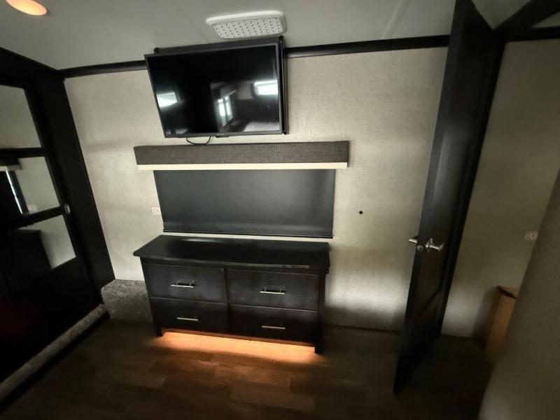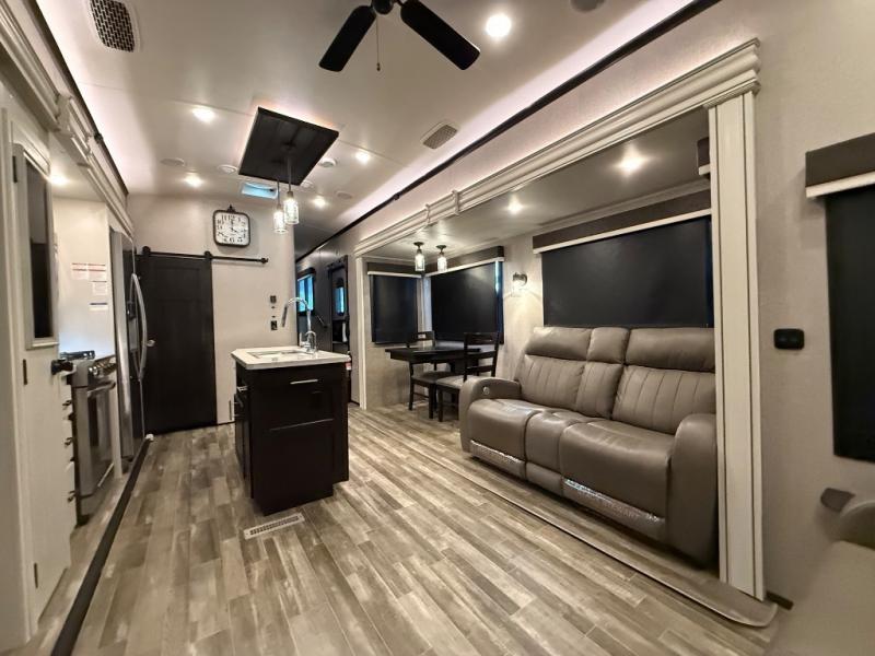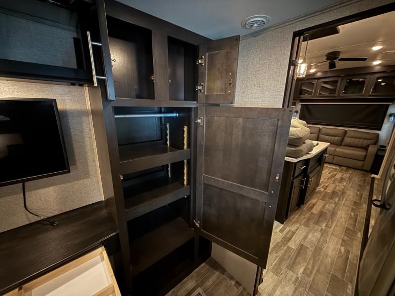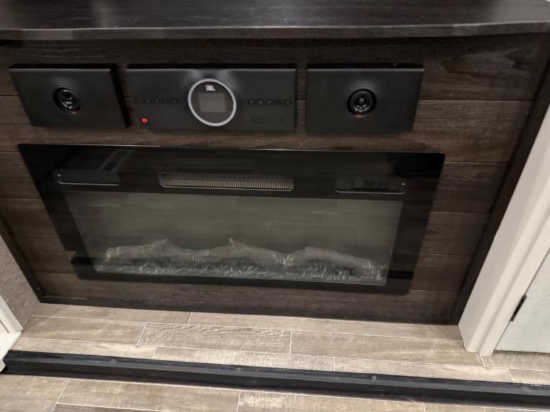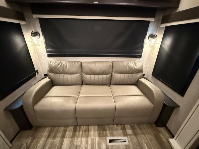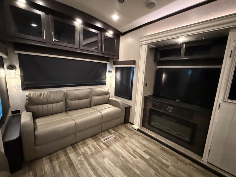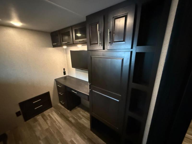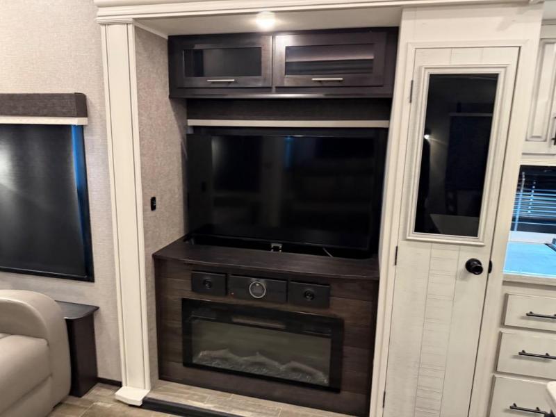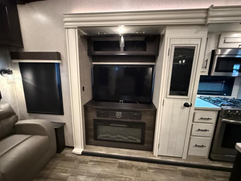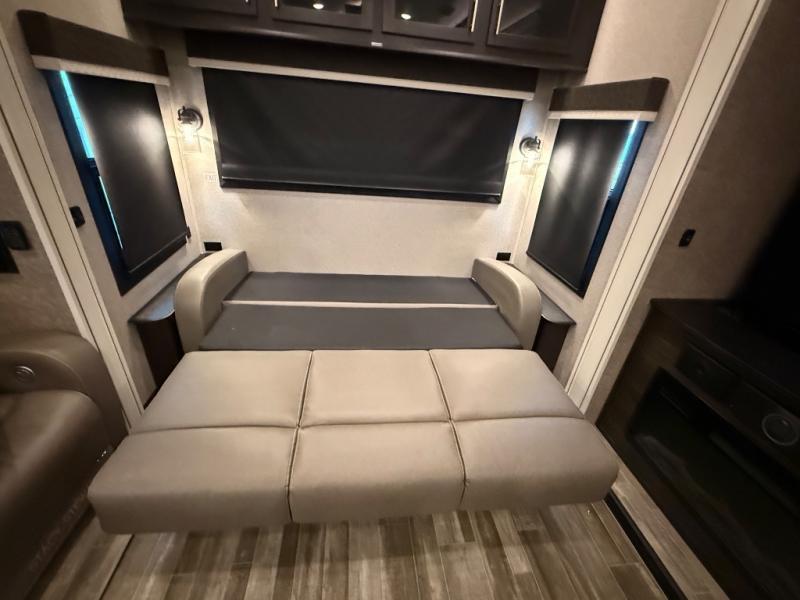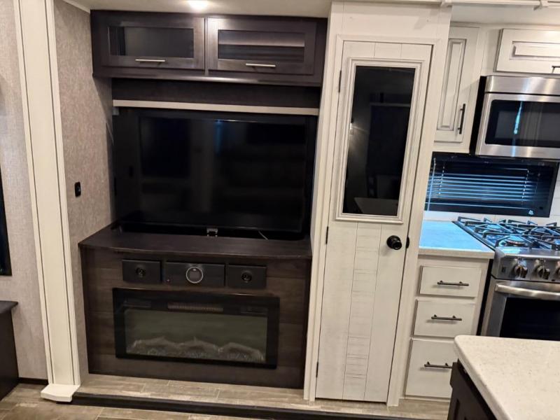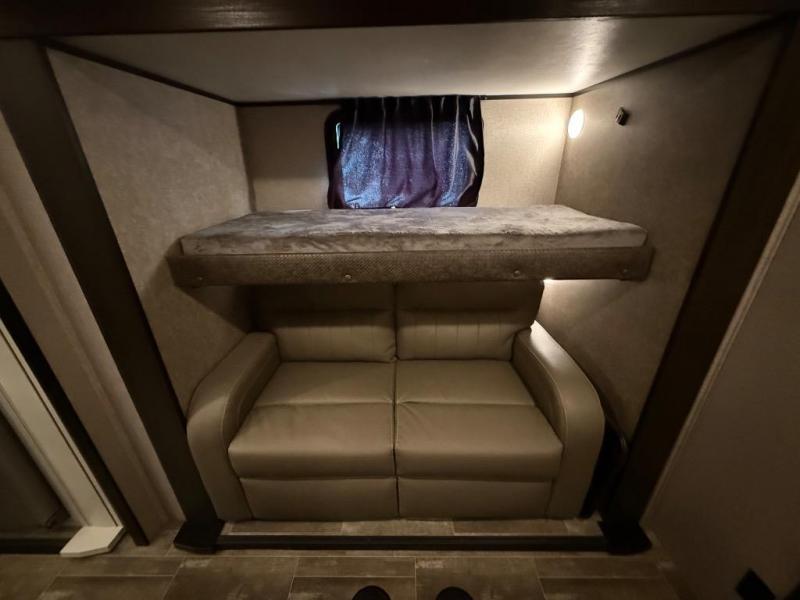 You can bring the whole family with two bedrooms in this fifth wheel! The front private bedroom features a queen bed, a front wall walk-in closet with a hamper and a space prepped to add the optional washer and dryer, and a flip-up dresser with a 32" TV. The second room can be used as a den, an office or a guest room with an overhead loft above a flip-up bunk that has a tri-fold sofa below it, and a desk with a TV. The kitchen is decked out in at-home features like the kitchen island with a double sink and prepped for the optional dishwasher, the large pantry, and a 21 cu. ft. refrigerator to keep your perishables fresh. You can wind down each night by relaxing in the rear living area on either the tri-fold hide-a-bed sofa with flip top side tables to set your drink on or the theater seat which are directly across from the fireplace with a TV on a lift. You can even choose to add the optional tailgate TV next to the outside kitchen with a 17' electric awning with LED lights to keep you protected!