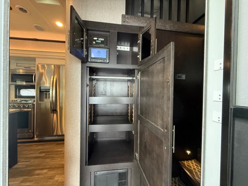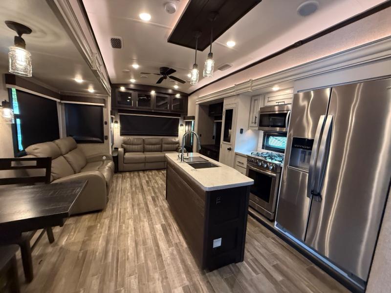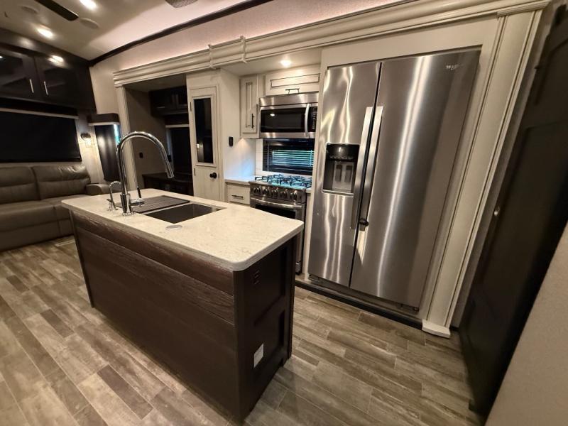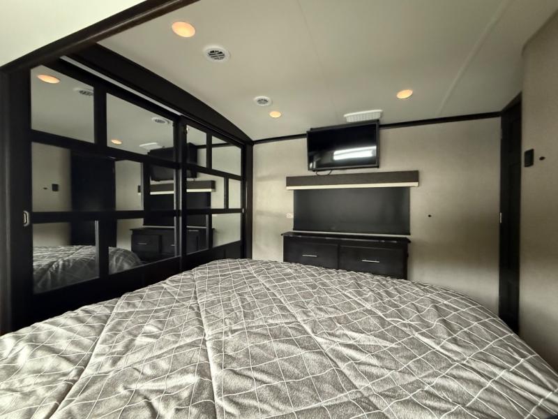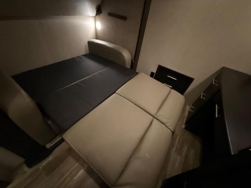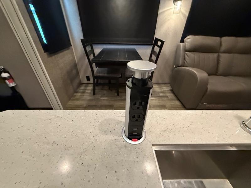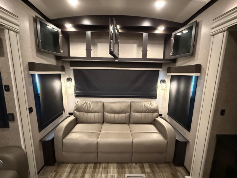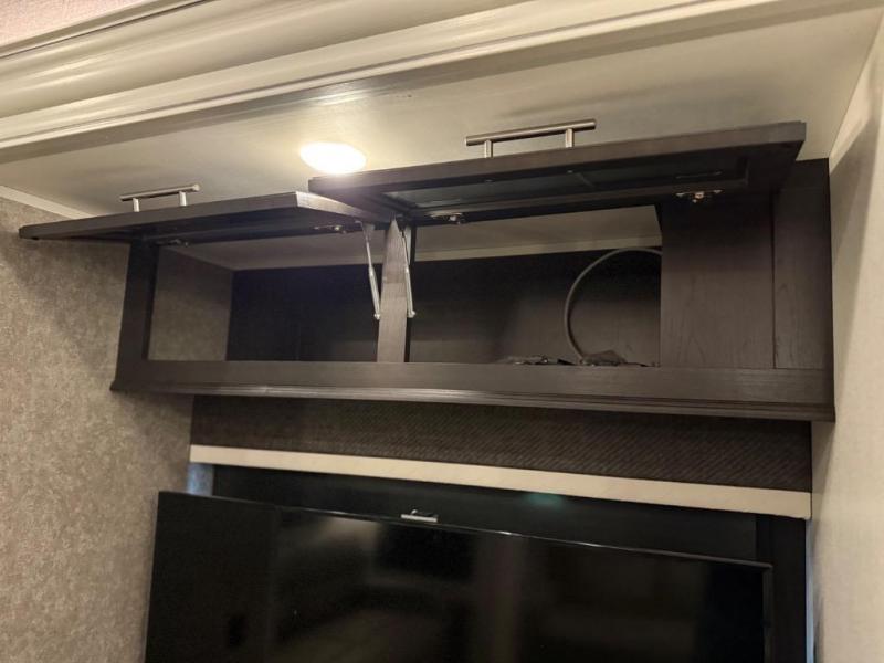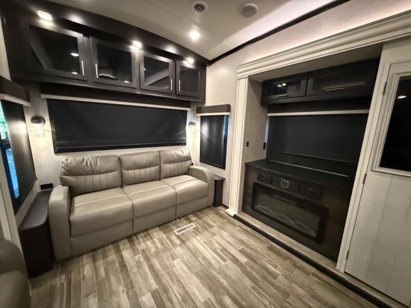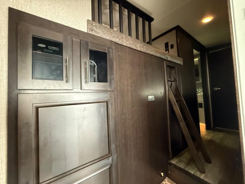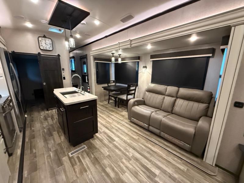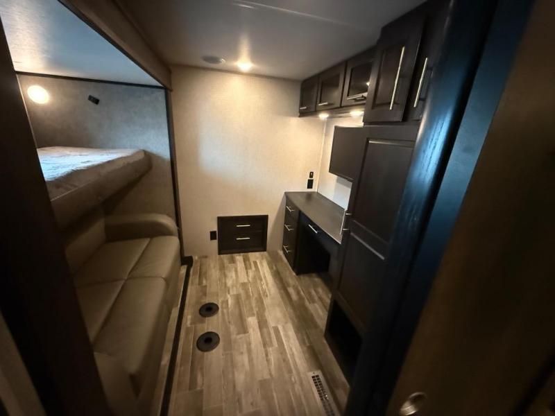 You can bring the whole family with two bedrooms in this fifth wheel! The front private bedroom features a queen bed, a front wall walk-in closet with a hamper and a space prepped to add the optional washer and dryer, and a flip-up dresser with a 32" TV. The second room can be used as a den, an office or a guest room with an overhead loft above a flip-up bunk that has a tri-fold sofa below it, and a desk with a TV. The kitchen is decked out in at-home features like the kitchen island with a double sink and prepped for the optional dishwasher, the large pantry, and a 21 cu. ft. refrigerator to keep your perishables fresh. You can wind down each night by relaxing in the rear living area on either the tri-fold hide-a-bed sofa with flip top side tables to set your drink on or the theater seat which are directly across from the fireplace with a TV on a lift. You can even choose to add the optional tailgate TV next to the outside kitchen with a 17' electric awning with LED lights to keep you protected!