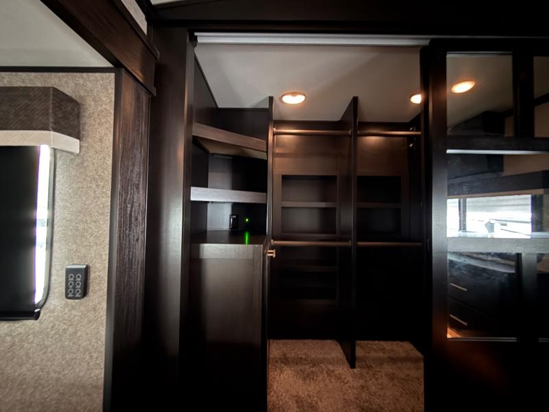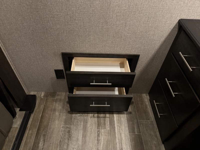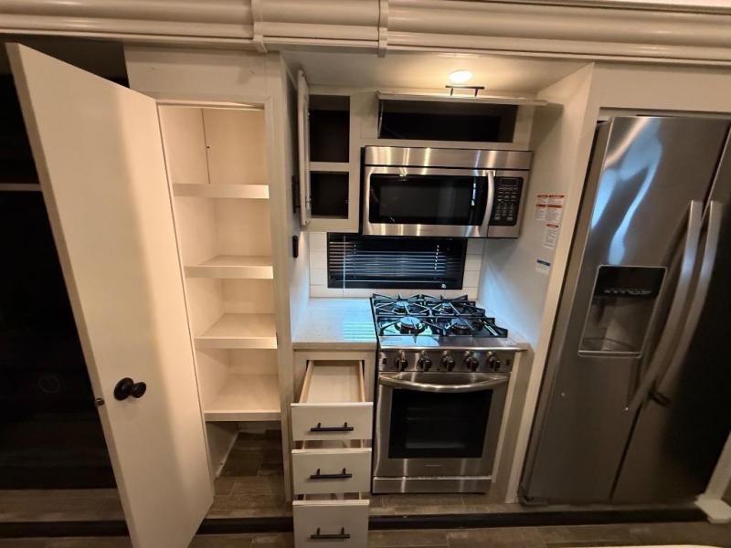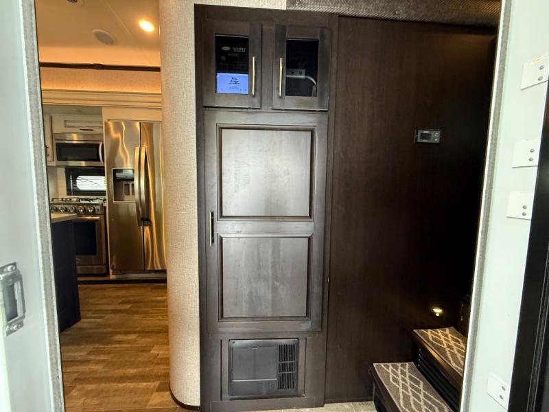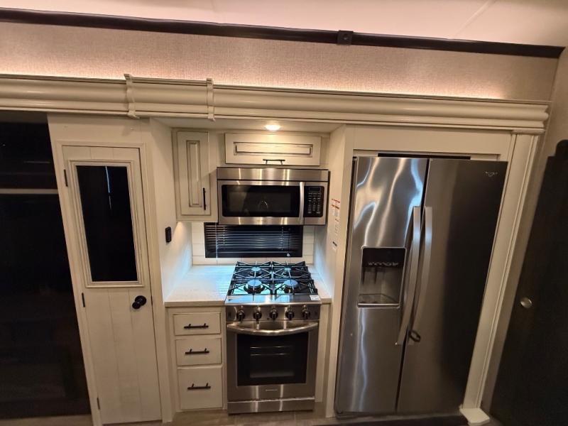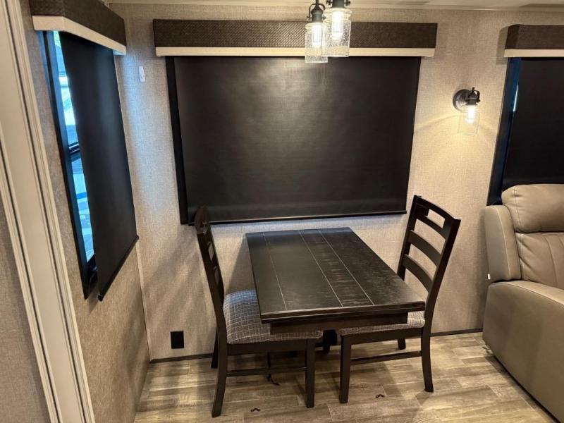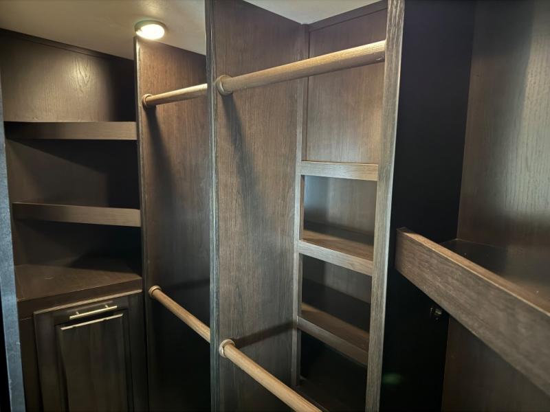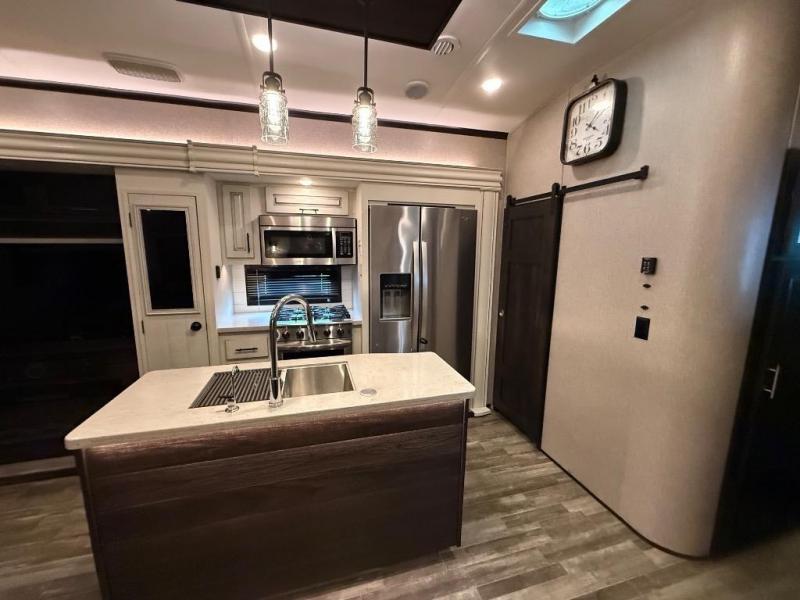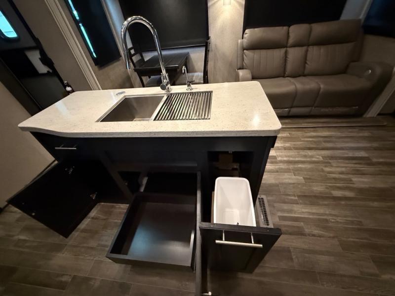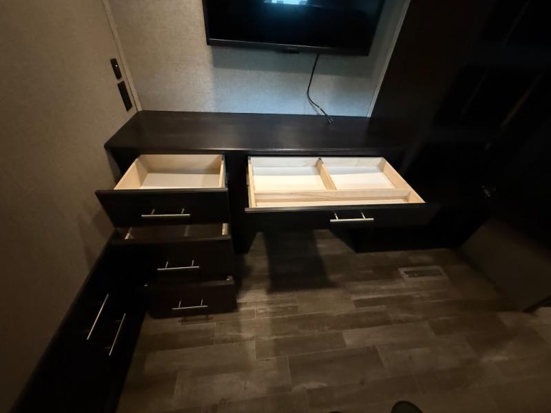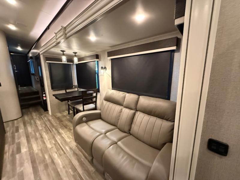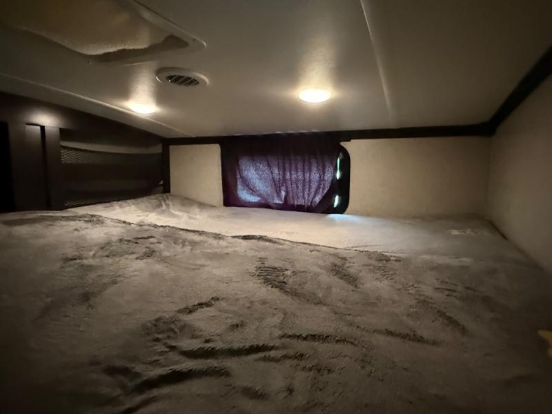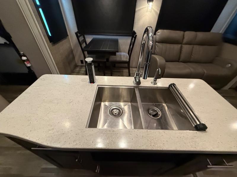 You can bring the whole family with two bedrooms in this fifth wheel! The front private bedroom features a queen bed, a front wall walk-in closet with a hamper and a space prepped to add the optional washer and dryer, and a flip-up dresser with a 32" TV. The second room can be used as a den, an office or a guest room with an overhead loft above a flip-up bunk that has a tri-fold sofa below it, and a desk with a TV. The kitchen is decked out in at-home features like the kitchen island with a double sink and prepped for the optional dishwasher, the large pantry, and a 21 cu. ft. refrigerator to keep your perishables fresh. You can wind down each night by relaxing in the rear living area on either the tri-fold hide-a-bed sofa with flip top side tables to set your drink on or the theater seat which are directly across from the fireplace with a TV on a lift. You can even choose to add the optional tailgate TV next to the outside kitchen with a 17' electric awning with LED lights to keep you protected!