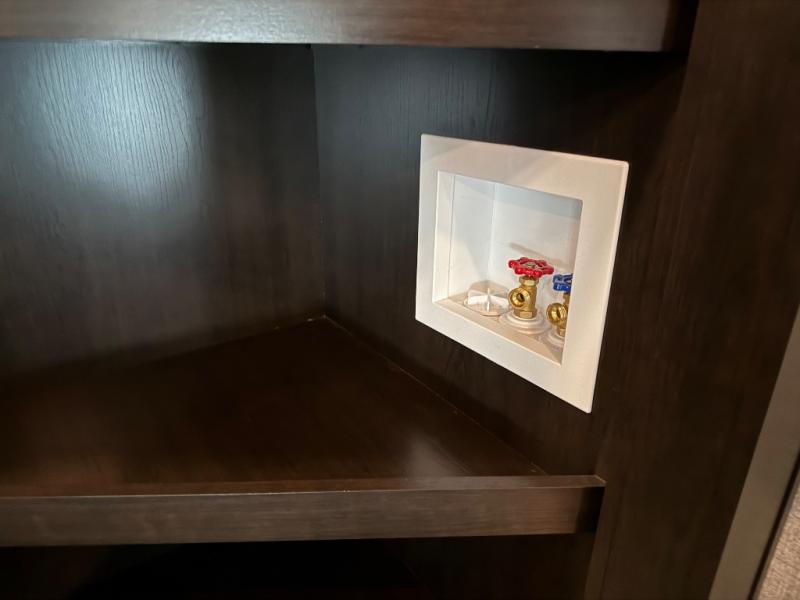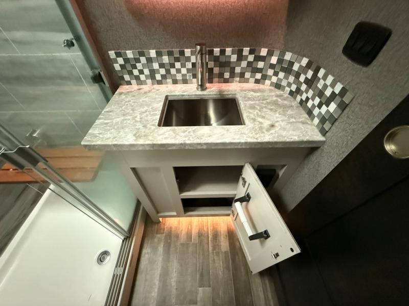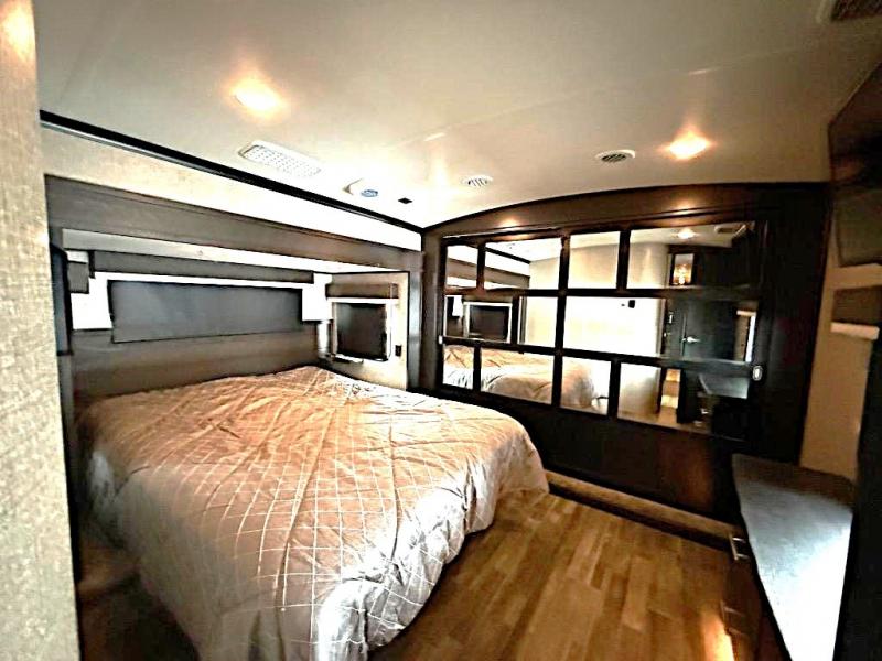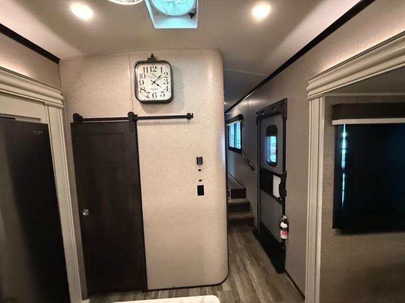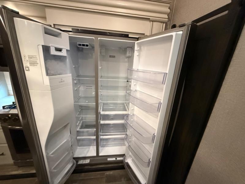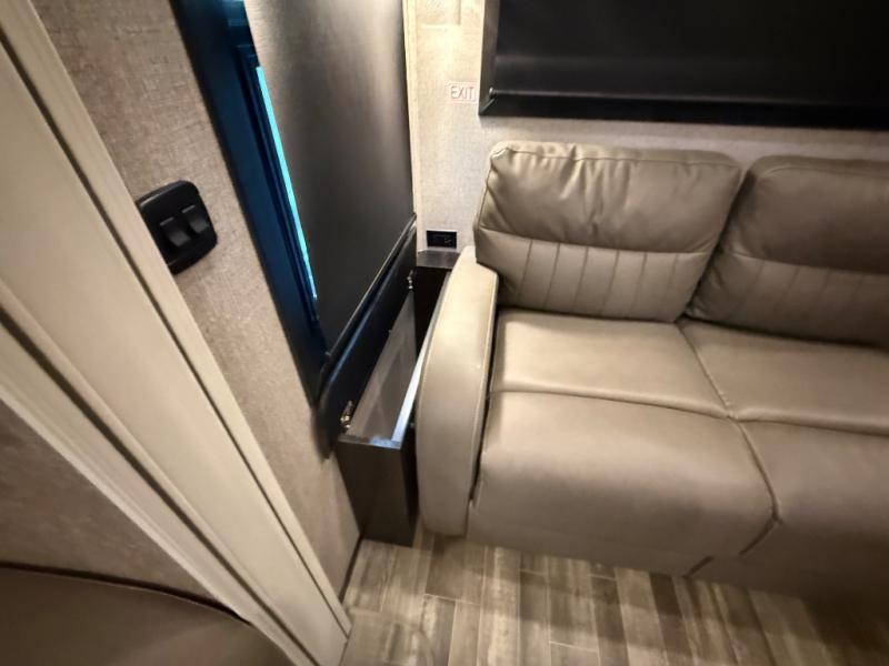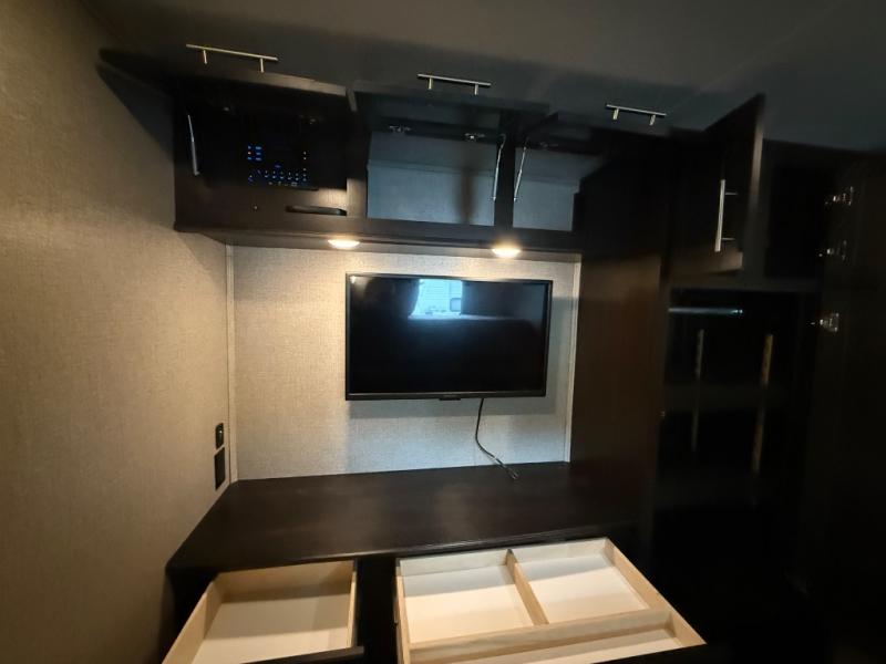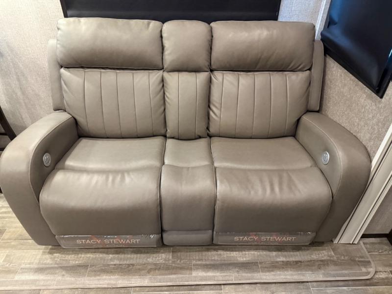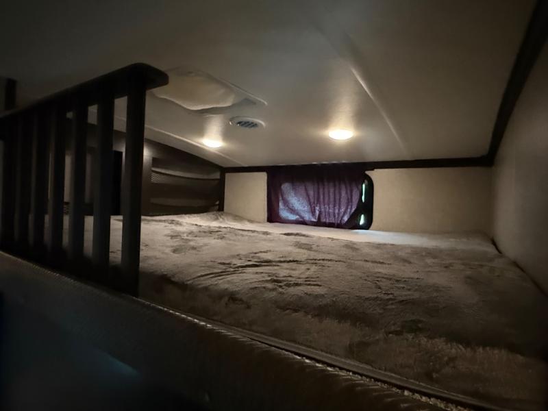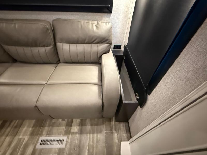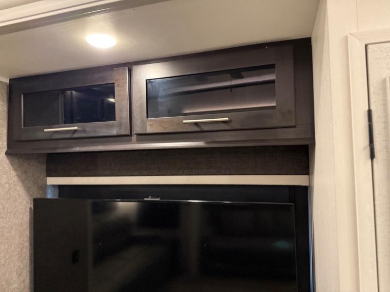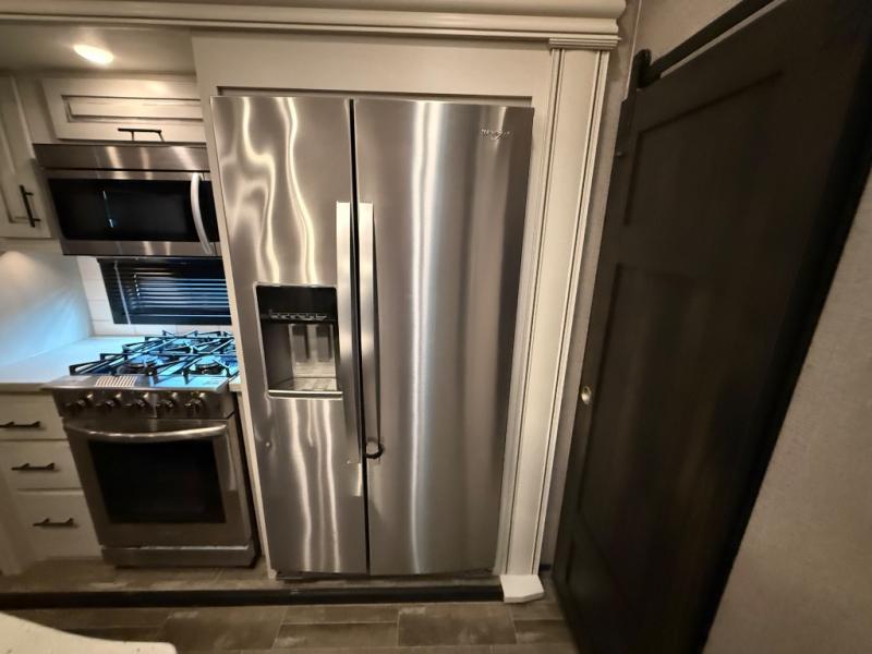 You can bring the whole family with two bedrooms in this fifth wheel! The front private bedroom features a queen bed, a front wall walk-in closet with a hamper and a space prepped to add the optional washer and dryer, and a flip-up dresser with a 32" TV. The second room can be used as a den, an office or a guest room with an overhead loft above a flip-up bunk that has a tri-fold sofa below it, and a desk with a TV. The kitchen is decked out in at-home features like the kitchen island with a double sink and prepped for the optional dishwasher, the large pantry, and a 21 cu. ft. refrigerator to keep your perishables fresh. You can wind down each night by relaxing in the rear living area on either the tri-fold hide-a-bed sofa with flip top side tables to set your drink on or the theater seat which are directly across from the fireplace with a TV on a lift. You can even choose to add the optional tailgate TV next to the outside kitchen with a 17' electric awning with LED lights to keep you protected!