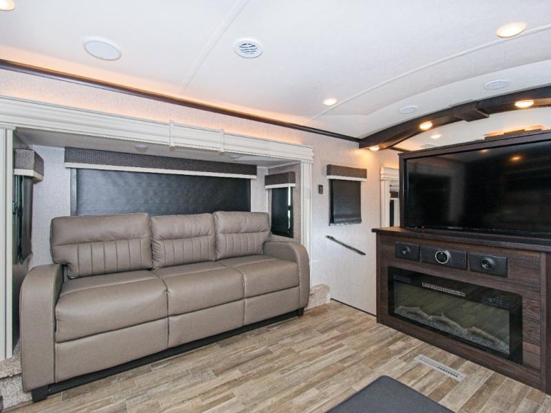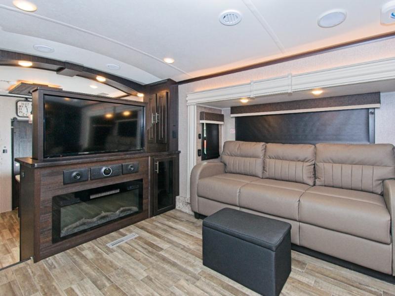 Experience luxury RV living in the North Point 382FLRB, featuring a front living area with a fireplace and 50" TV and a private master suite with a spa-like rear bath.