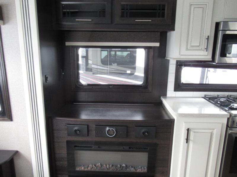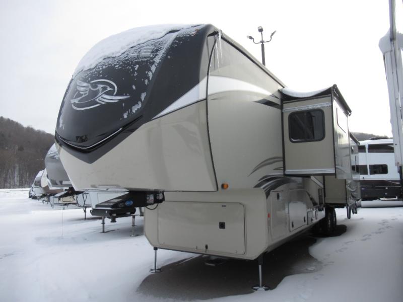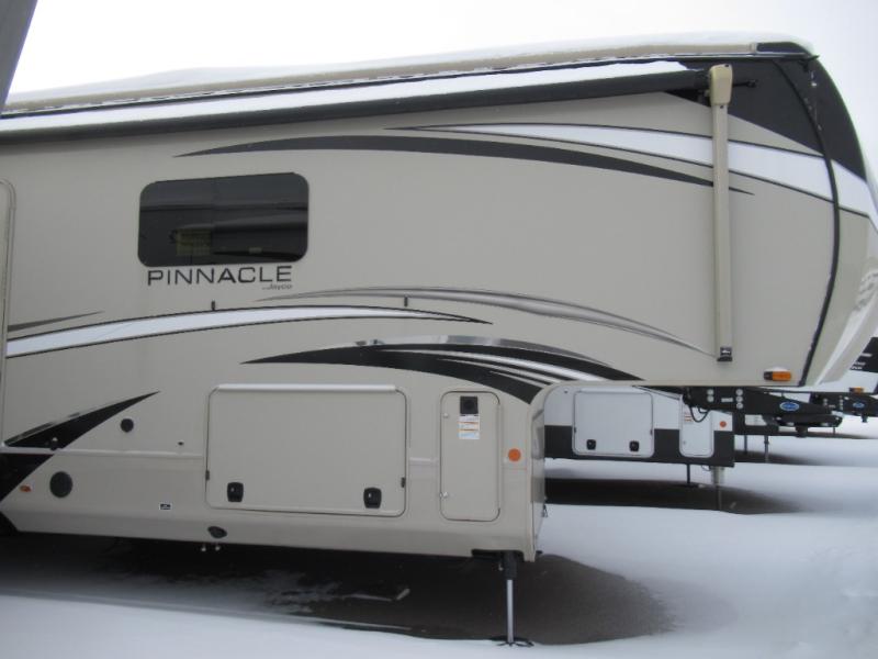 Enjoy all-around luxury features in the Pinnacle fifth wheel by Jayco! Each model includes a fully enclosed, LED-lit Nautilus universal docking center, a pass-through storage with Slam-Latch baggage doors, and a 6-point auto-leveling system to make set-up easier than ever. The Magnum Truss XL6 roof system provides the strongest tested roof in the industry so you can enjoy your fifth wheel for years to come, and the custom automotive-grade vinyl exterior graphics package will give it a sleek look. Inside, you'll enjoy the LED HDTV and JBL home entertainment system, along with dual USB charging ports throughout for all your gadgets. The kitchen is packed with convenient and luxury features, such as a stainless steel sink, a 21 cu. ft. residential refrigerator, solid surface countertops, plus a convection microwave. Whether you're enjoying the exterior 32" LED TV, cleaning up with the central vacuum system, or staying cozy by the LED fireplace, you will love the Pinnacle fifth wheel by Jayco!