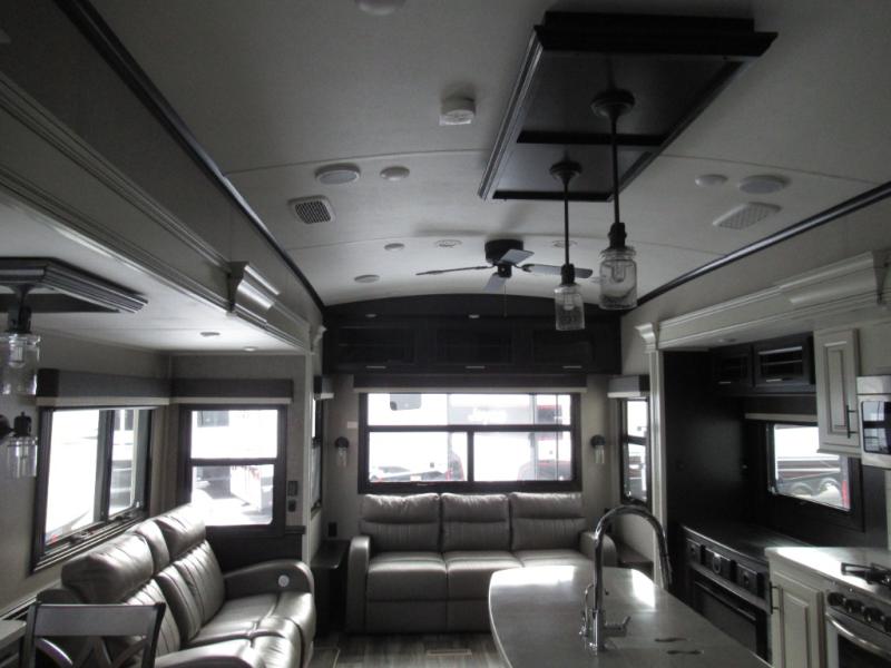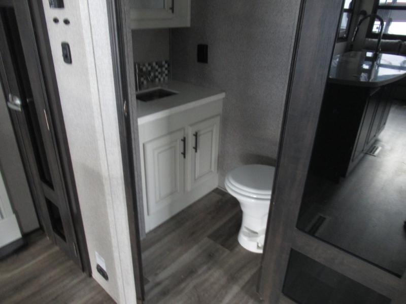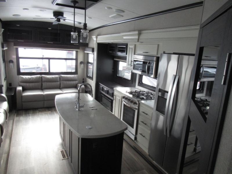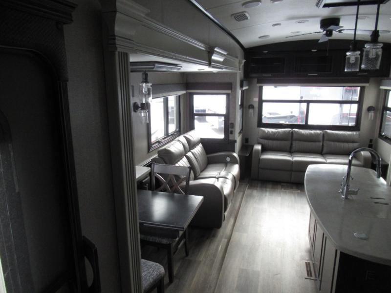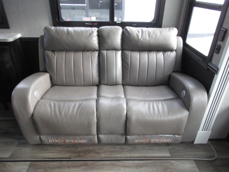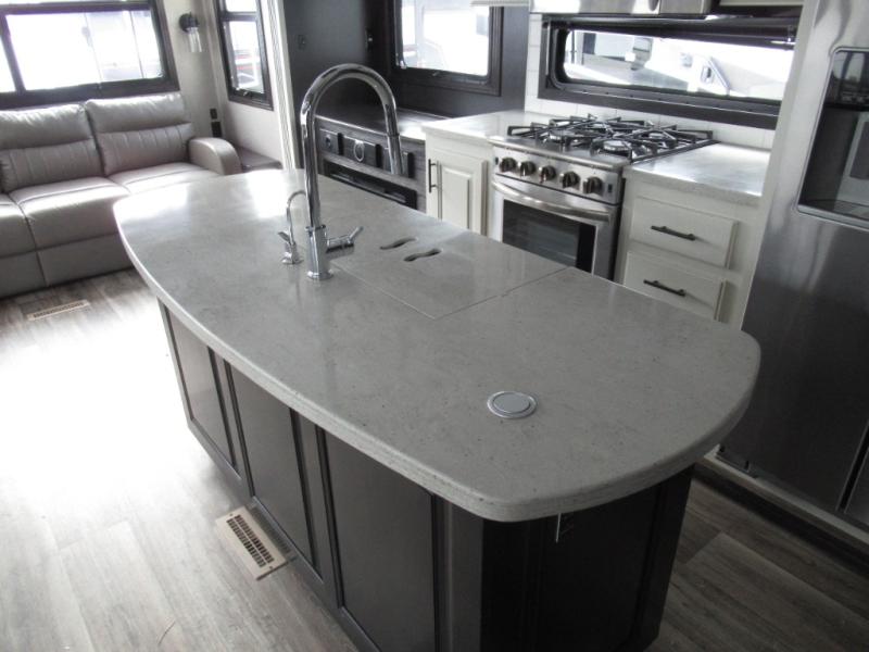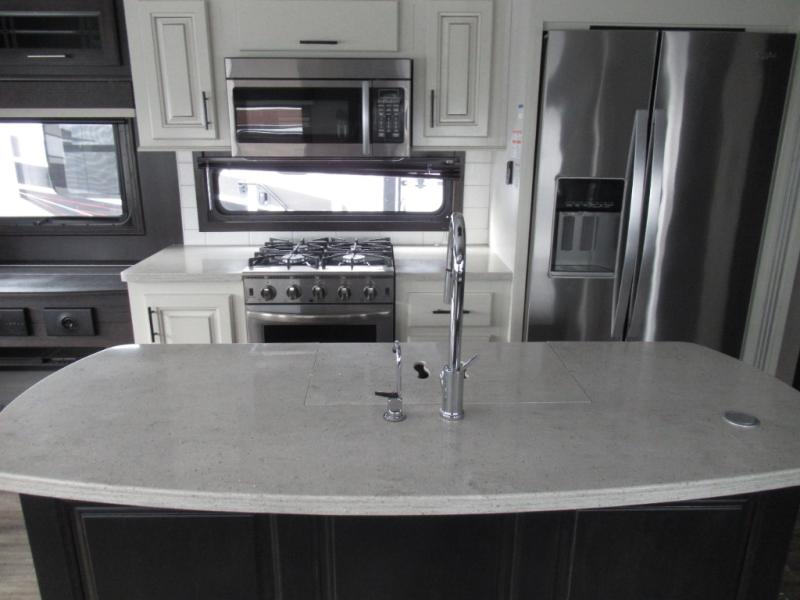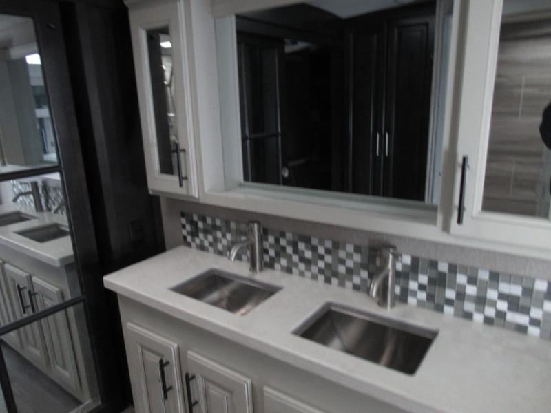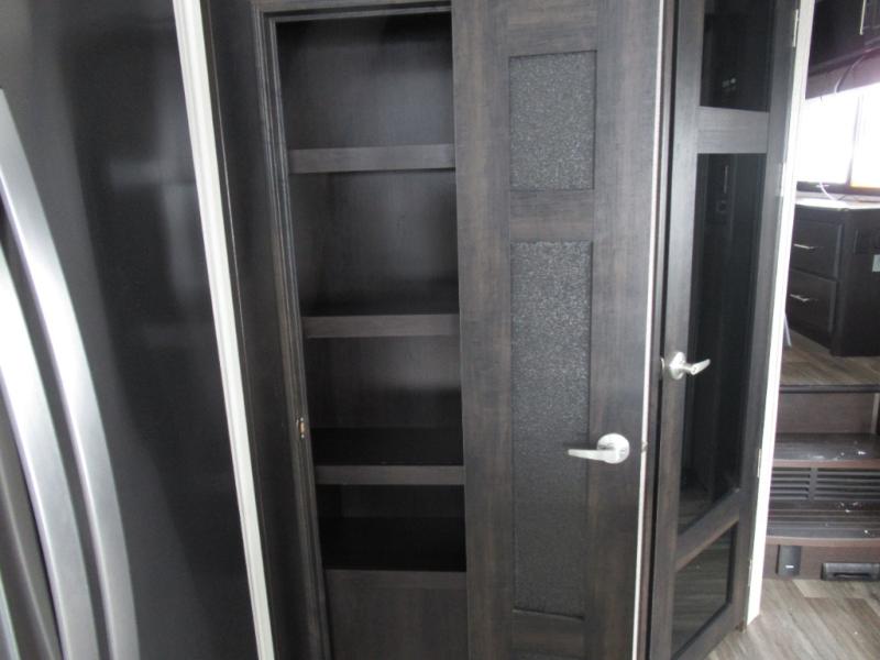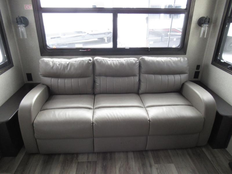 Eat, sleep, relax, and play all in this luxurious fifth wheel. The dual opposing slides in the main living area will open up the whole space, and the kitchen island will provide additional counter space. This model includes plenty of storage space, including a pantry and a shoe garage for convenience. The free-standing table with chairs will allow you to dine just like you do at home, and the theater seat will be great for movie night. There is also a tri-fold hide-a-bed sofa for the kids at night. Up front you'll find the front master suite that includes a full bath with dual bath sinks, a Cedar lined walk-in closet, plus a shower with a seat for your comfort! And don't forget about the half bath for your guests!