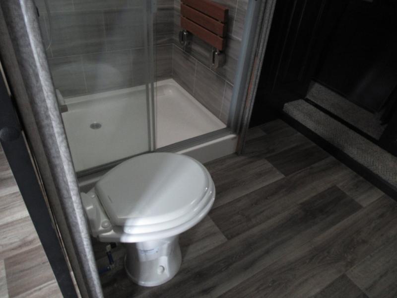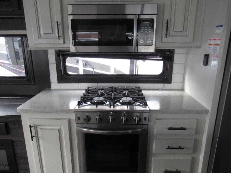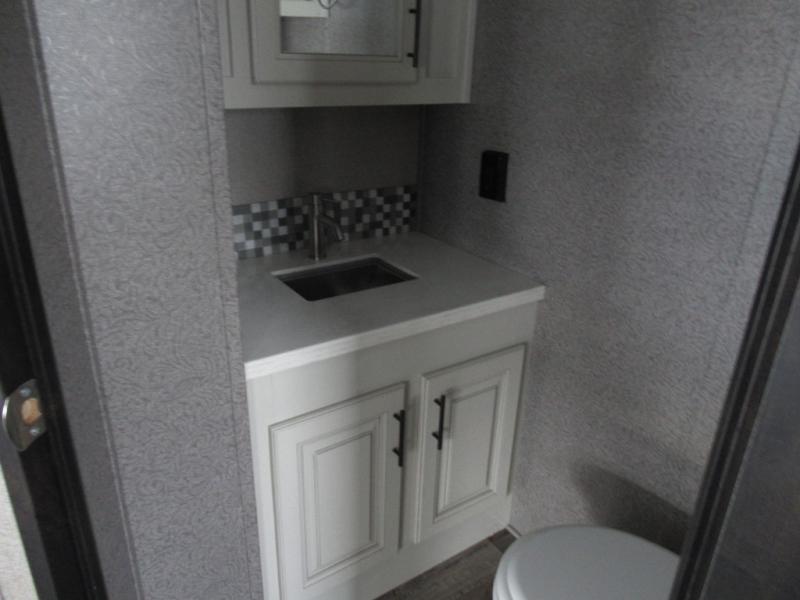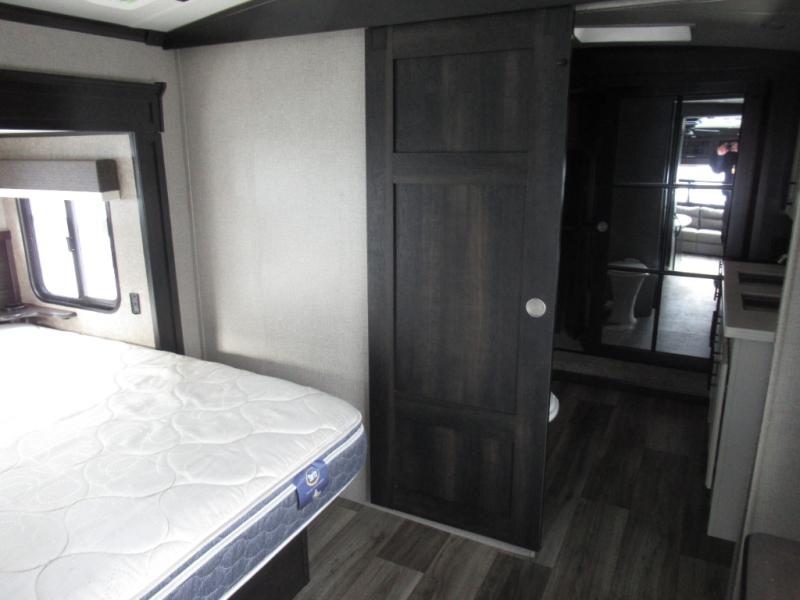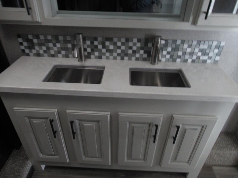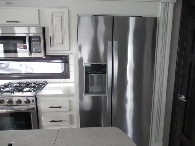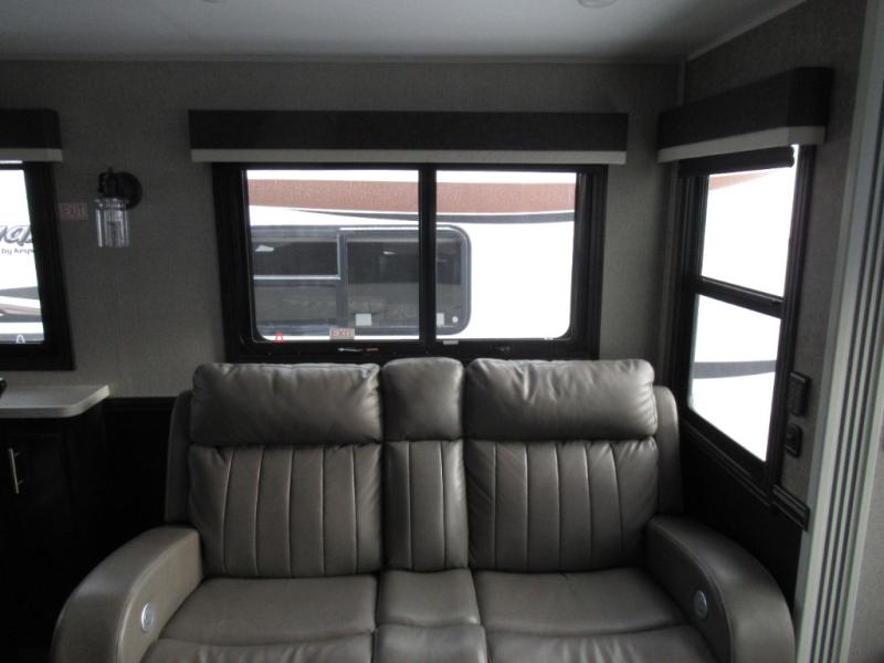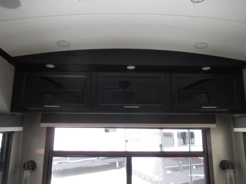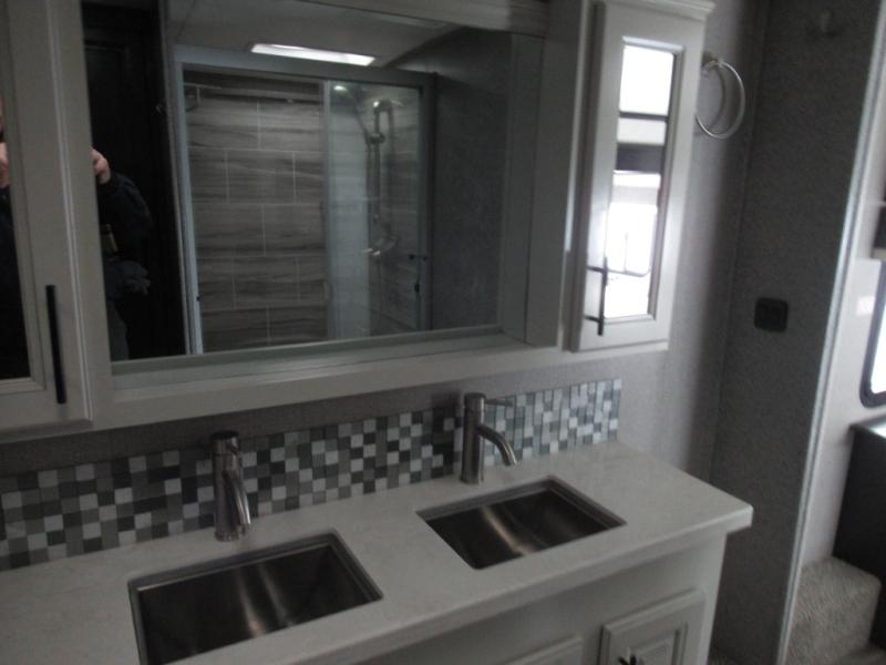 Eat, sleep, relax, and play all in this luxurious fifth wheel. The dual opposing slides in the main living area will open up the whole space, and the kitchen island will provide additional counter space. This model includes plenty of storage space, including a pantry and a shoe garage for convenience. The free-standing table with chairs will allow you to dine just like you do at home, and the theater seat will be great for movie night. There is also a tri-fold hide-a-bed sofa for the kids at night. Up front you'll find the front master suite that includes a full bath with dual bath sinks, a Cedar lined walk-in closet, plus a shower with a seat for your comfort! And don't forget about the half bath for your guests!