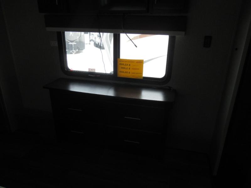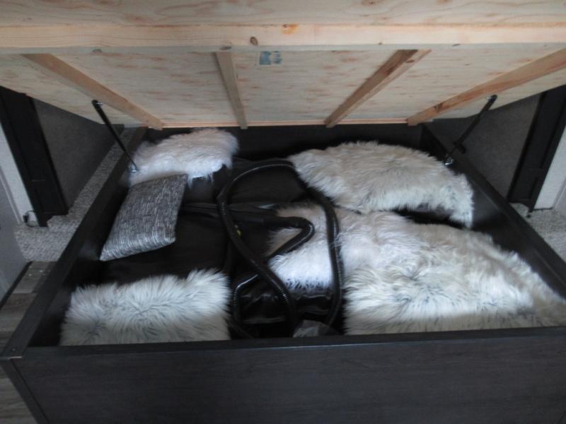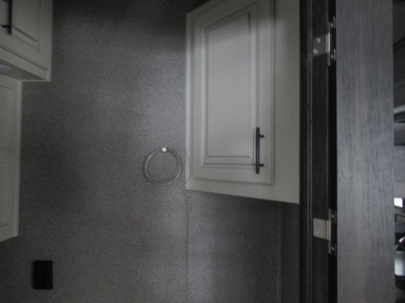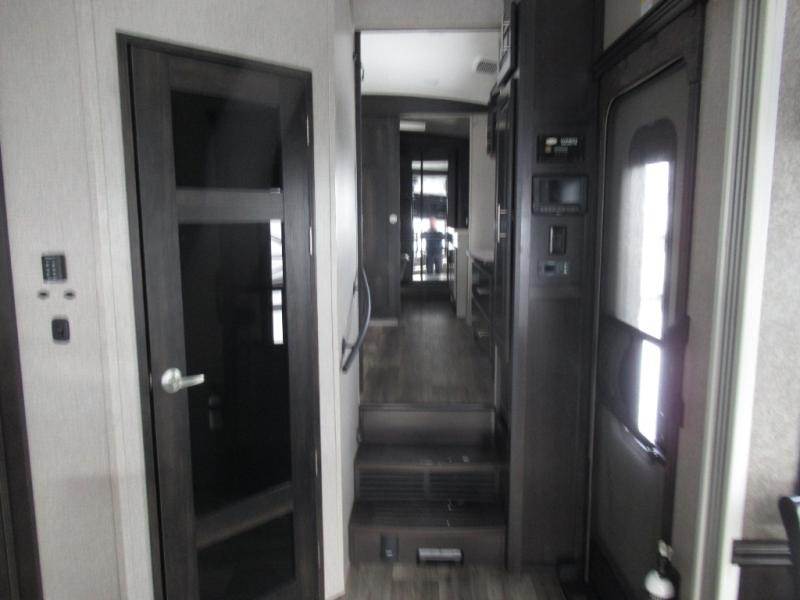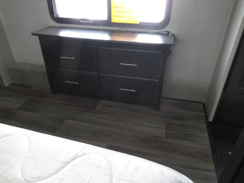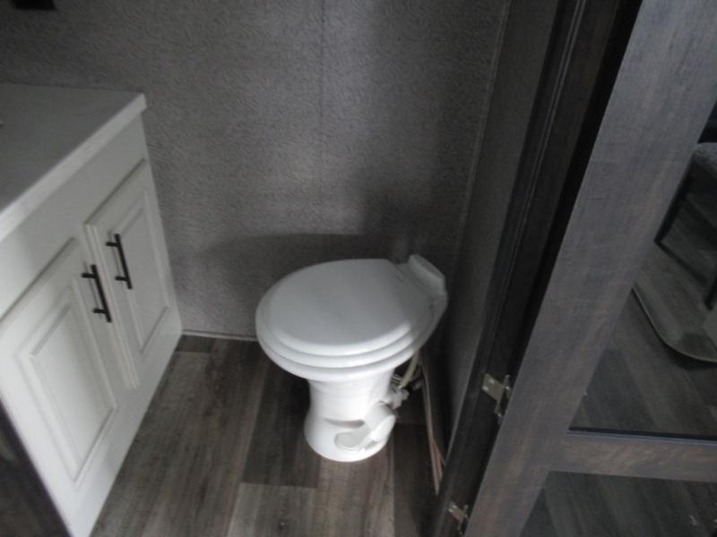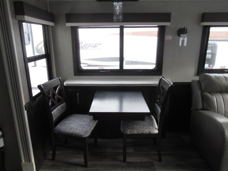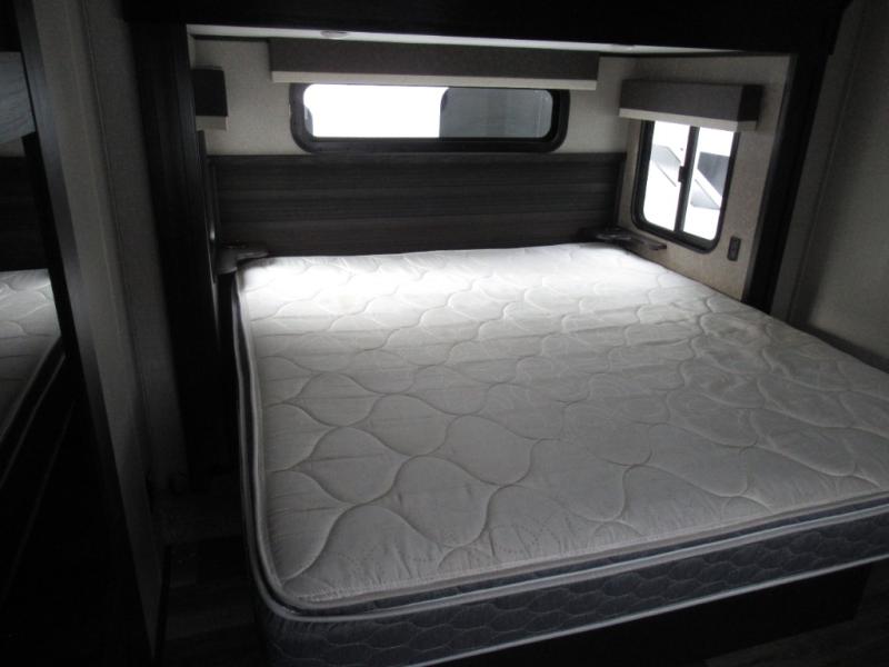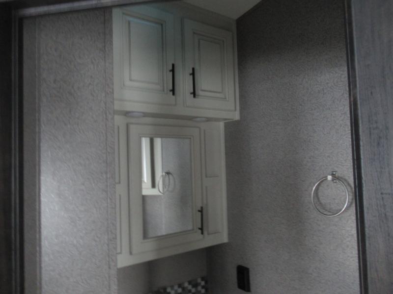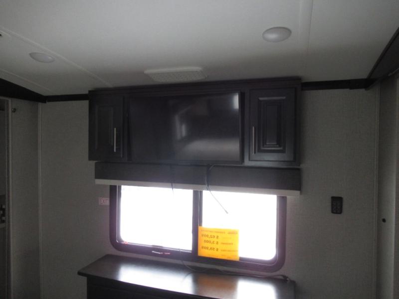 Eat, sleep, relax, and play all in this luxurious fifth wheel. The dual opposing slides in the main living area will open up the whole space, and the kitchen island will provide additional counter space. This model includes plenty of storage space, including a pantry and a shoe garage for convenience. The free-standing table with chairs will allow you to dine just like you do at home, and the theater seat will be great for movie night. There is also a tri-fold hide-a-bed sofa for the kids at night. Up front you'll find the front master suite that includes a full bath with dual bath sinks, a Cedar lined walk-in closet, plus a shower with a seat for your comfort! And don't forget about the half bath for your guests!