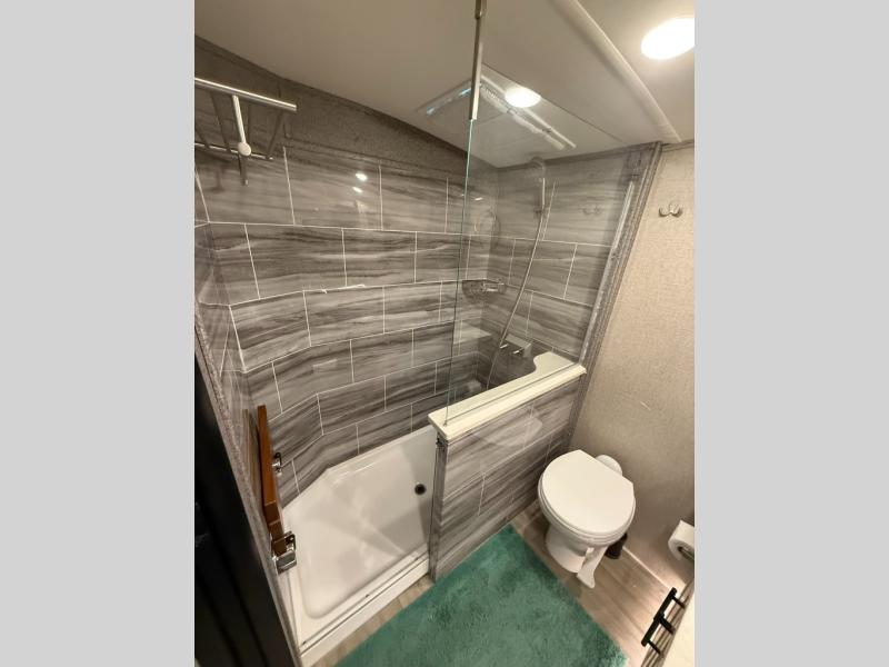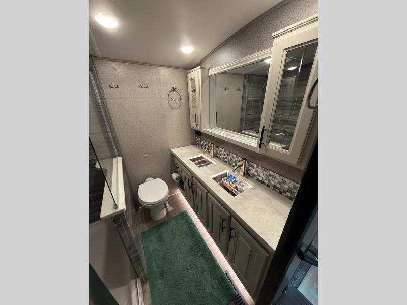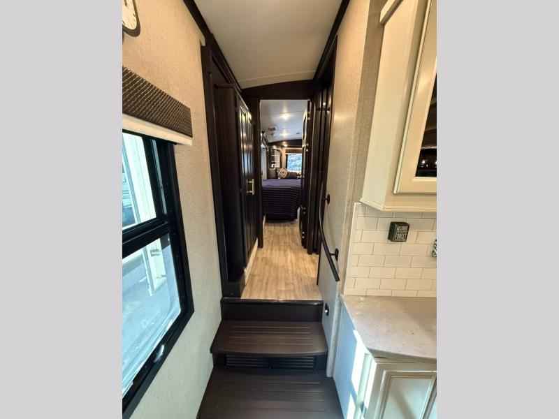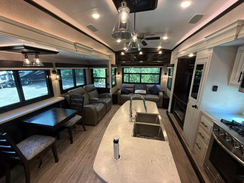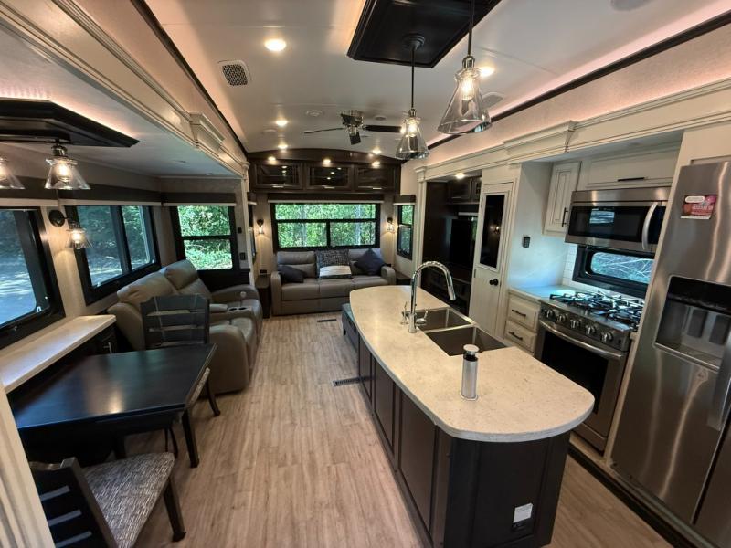 Pack your bags and head to your local state park for a fun family vacation in this fifth wheel. The chef of the family will love cooking in the spacious kitchen with a full pantry and a hutch for your nice dishes. You can also choose to add an optional dishwasher to make clean-up easier than ever. This model includes a full bath with dual bath sinks and a walk-in shower with a seat for your comfort. The front private bedroom will feel just like home with its slide out king bed, a front lounge seat, plus your own fireplace for a cozy evening indoors.