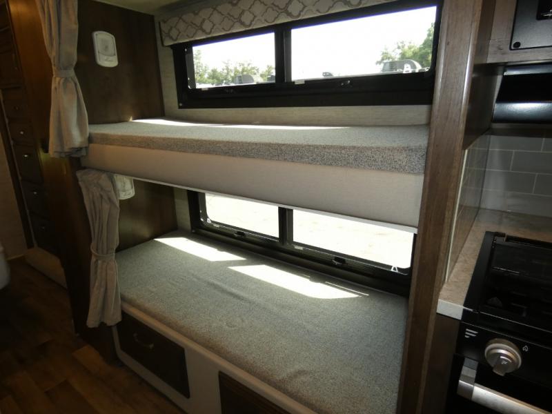 A full-wall slide turns this Redhawk Class C gas motorhome into a very spacious coach! There is room for a master suite in the back which has access into the dual-entry bath, a set of bunk beds with an industry-exclusive 300-LB rating, a sofa next to the 8 cubic foot flush-mount double-door refrigerator, and a booth dinette. Additional features that are going to make your life easier are the swivel cab seats, the bunk above the cab rated at 750 LBS, the cab privacy curtain, and the Furrion all-in-one cooktop and oven. You will also have the opportunity to make your outdoor experience even more enjoyable by lowering the 18' electric awning with LED lights for some protection from the sun or rain.