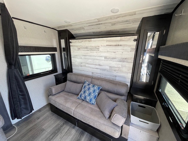 You will love versatile living with this travel trailer! Depending on what time of day you enter the model will determine whether you see the Murphy bed or sofa. The double-over-double rear bunks offer a 600 lb. weight rating so you can rest with ease. The living area has everything you could need to feel right at home with a L-lounger sofa next to the entertainment center with an electric fireplace and a 40" LED TV. The chef of the group will love creating home cooked meals with the three burner Furrion glass cooktop and the 8 cu. ft. refrigerator or you can head to the outside kitchen if you wish to breathe in some fresh air while you cook!