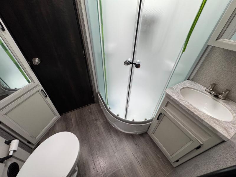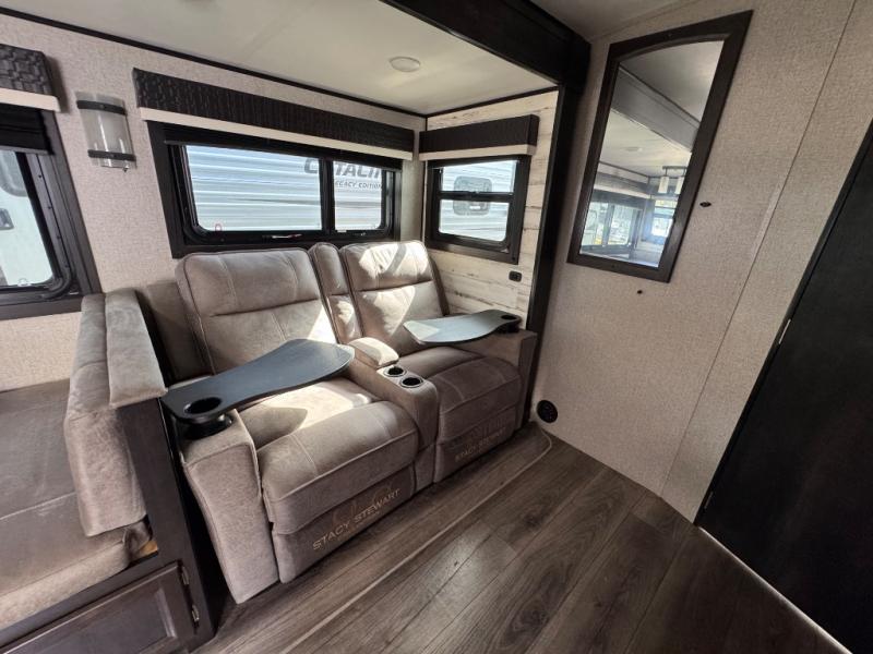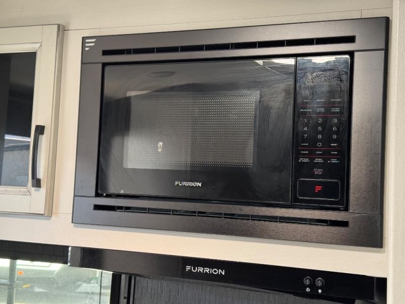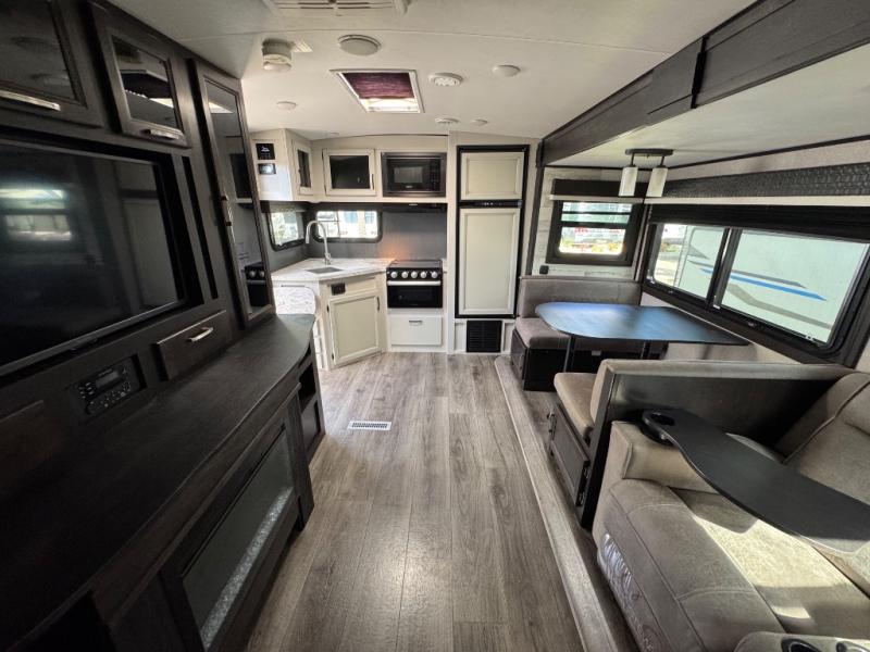 You will feel right at home in this travel trailer! The rear kitchen layout allows you to move about freely while you created a delicious meal with the three burner Furrion glass cooktop, the 8 cu. ft. refrigerator, and even the microwave. You can enjoy each meal comfortably at the booth dinette then play a card game or you can relax on the tri-fold sofa and enjoy the entertainment center with the electric fireplace and the 40" LED TV. You can start your days feeling clean and fresh by taking a hot, steamy shower in the glass 34" radius shower inside the walk-through bathroom, plus there is a linen closet and a small wardrobe for your storage needs. The front private bedroom offers a queen bed for a good night's rest with wardrobes on either side to keep your clothes neat, and even an entrance/exit door for you to slip out early in the morning for a quick fishing trip!