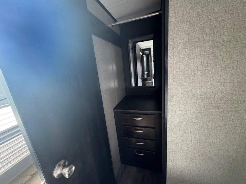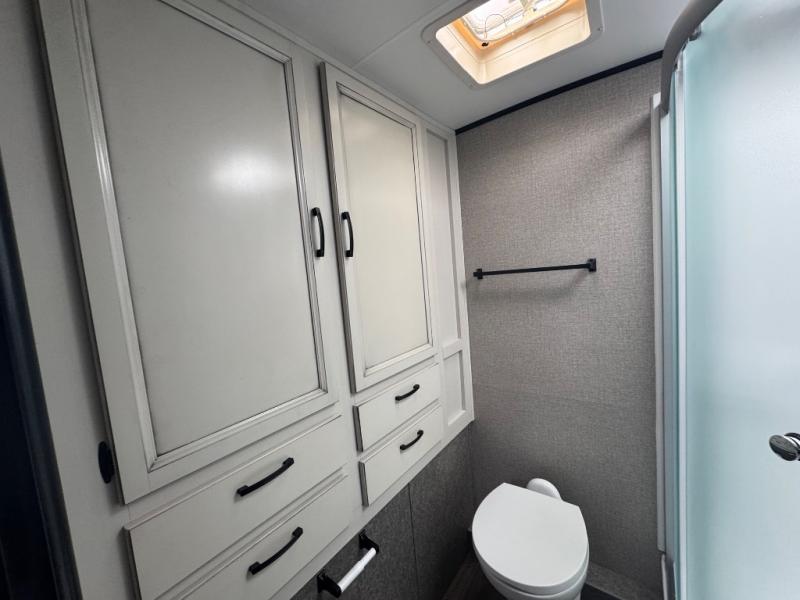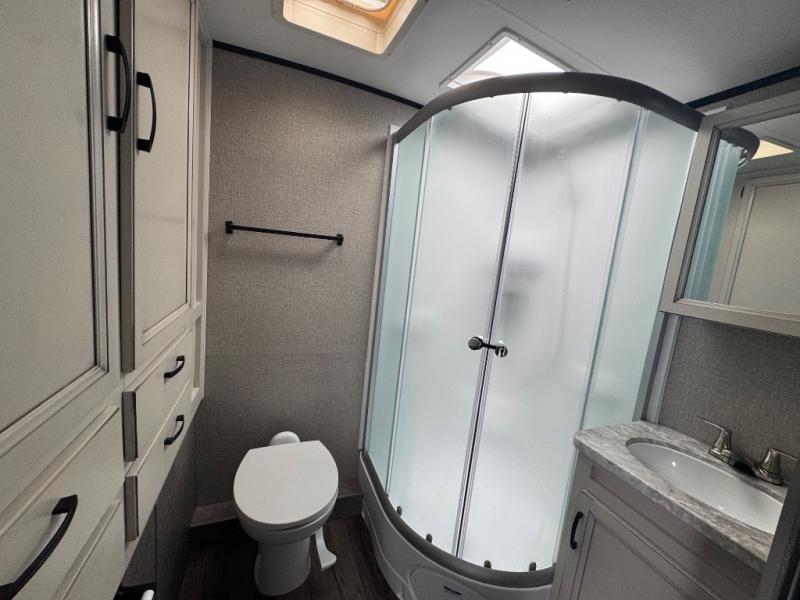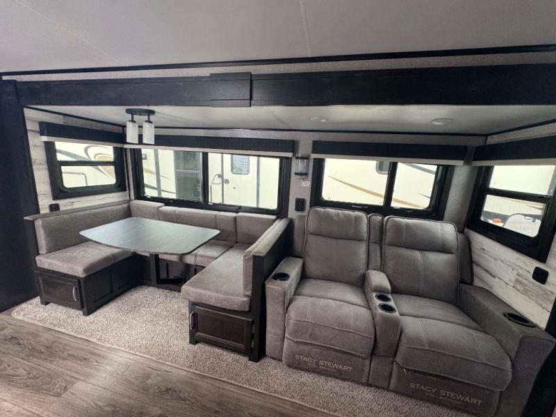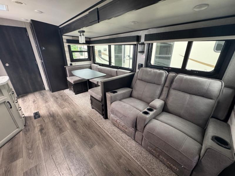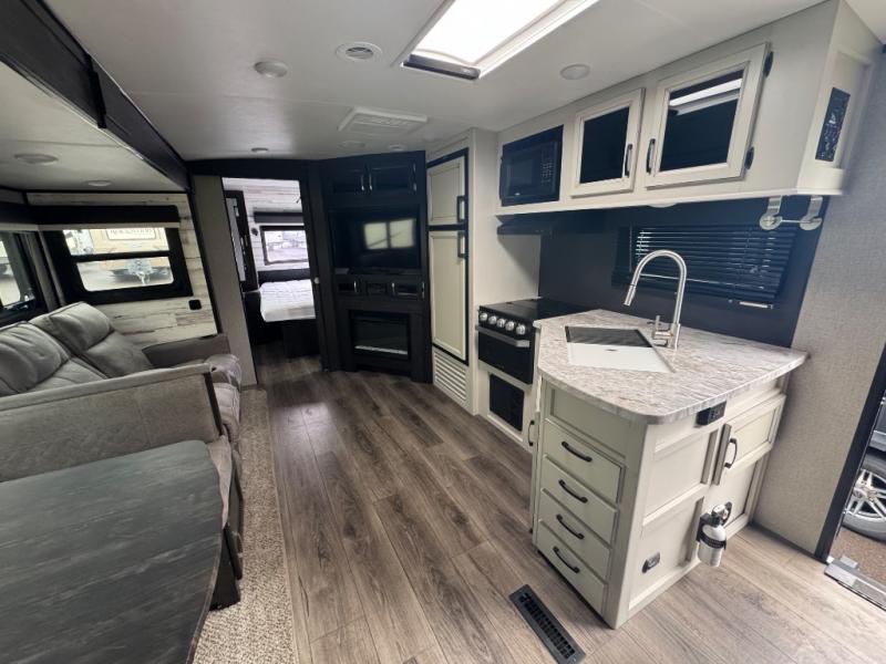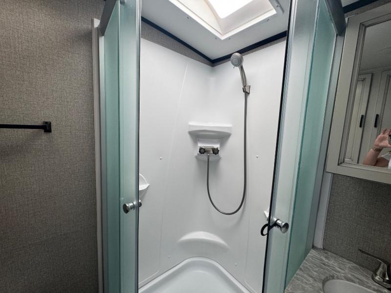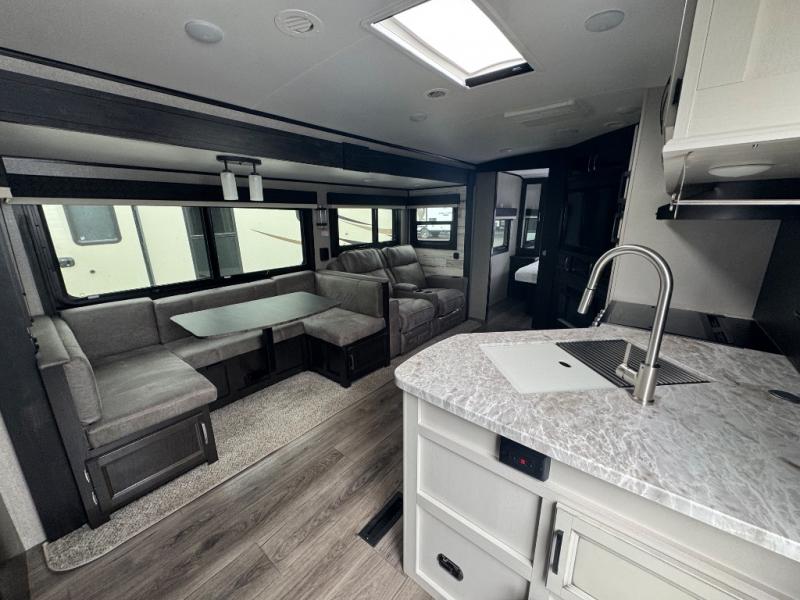 Step inside this dual entry travel trailer and see just how luxurious your next adventure will be! The full rear bathroom is packed with features you will love like the glass 34" radius shower with a skylight above, the porcelain foot flush toilet, and the large wardrobe to keep your linens handy. There are two pantries to store everyone's favorite snacks, a U-shaped dinette to enjoy your meals at, and a microwave to pop a bag of popcorn for movie night on the tri-fold sofa in front of the entertainment center. After a fun-filled day you can lay down on the queen bed in the front private bedroom or head outdoors and relax underneath the 19' electric awning with LED lights and marine-grade exterior speakers with blue LED accent lighting to keep the good times going!